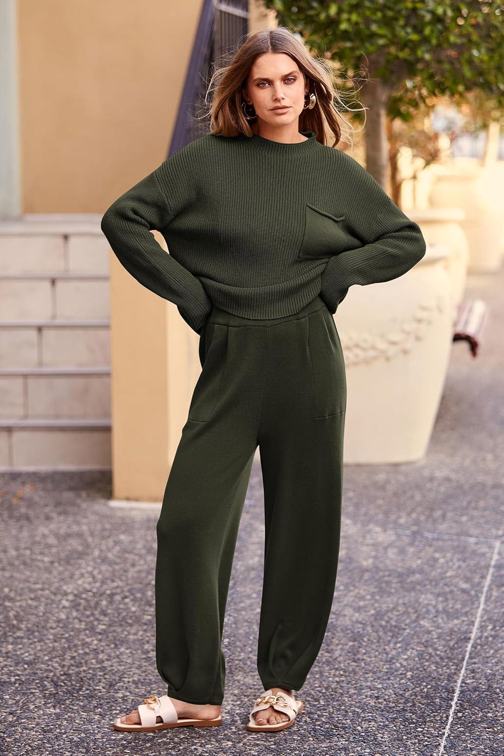 PRETTYGARDEN Two Piece Sets for Women 2025 Pullover Sweater High Waisted Sweatpants Tracksuit Lounge Set Fall Winter Outfits(Army Green)