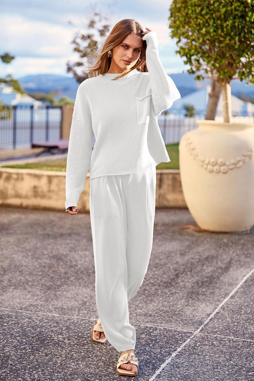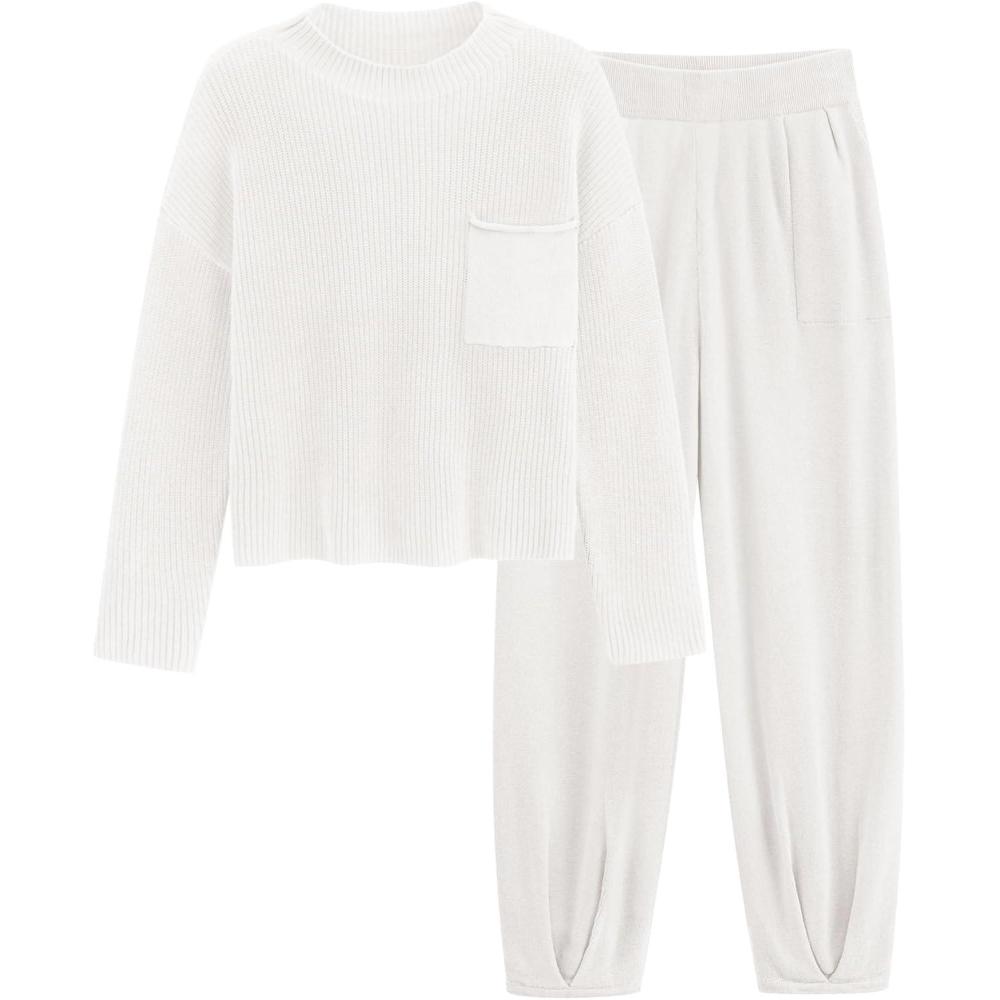 imagePRETTYGARDEN Two Piece Sets for Women 2025 Pullover Sweater High Waisted Sweatpants Tracksuit Lounge Set Fall Winter OutfitsBeige White