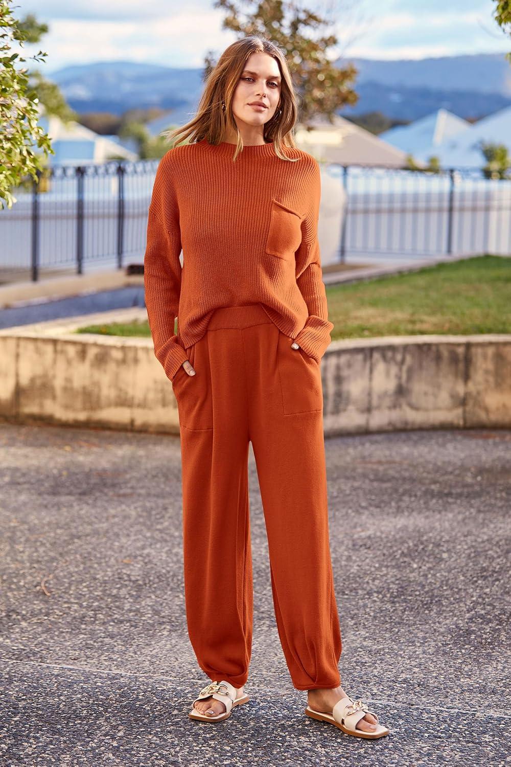 PRETTYGARDEN Two Piece Sets for Women 2025 Pullover Sweater High Waisted Sweatpants Tracksuit Lounge Set Fall Winter Outfits(Orange)