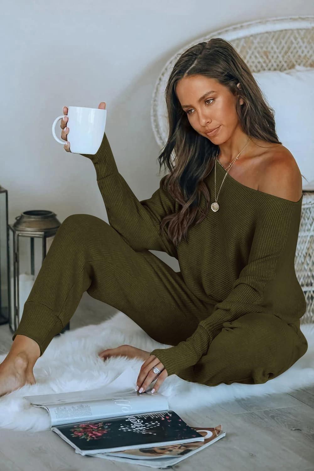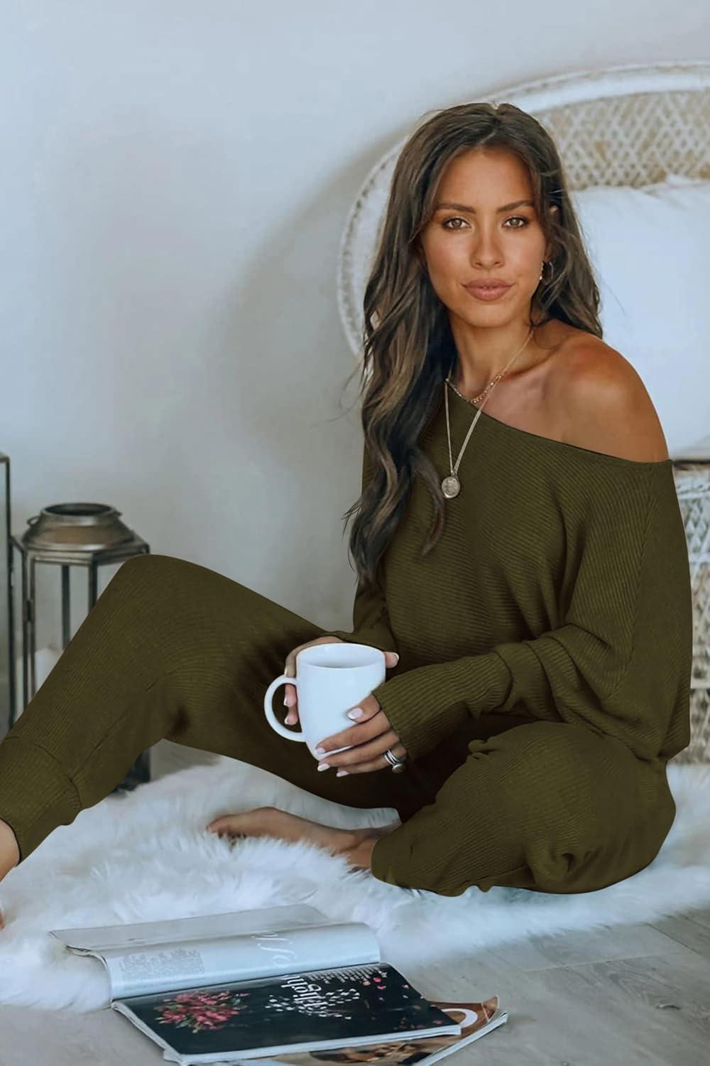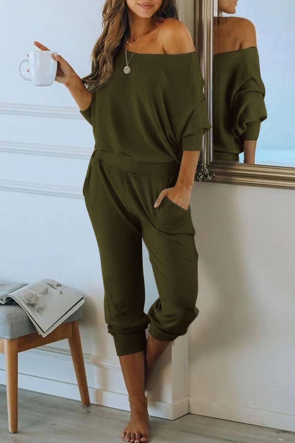 PRETTYGARDEN Two Piece Sets for Women Fall 2025 Ribbed Knit Off Shoulder Tops Lounge Pants Tracksuit Fashion Clothing(Army Green)