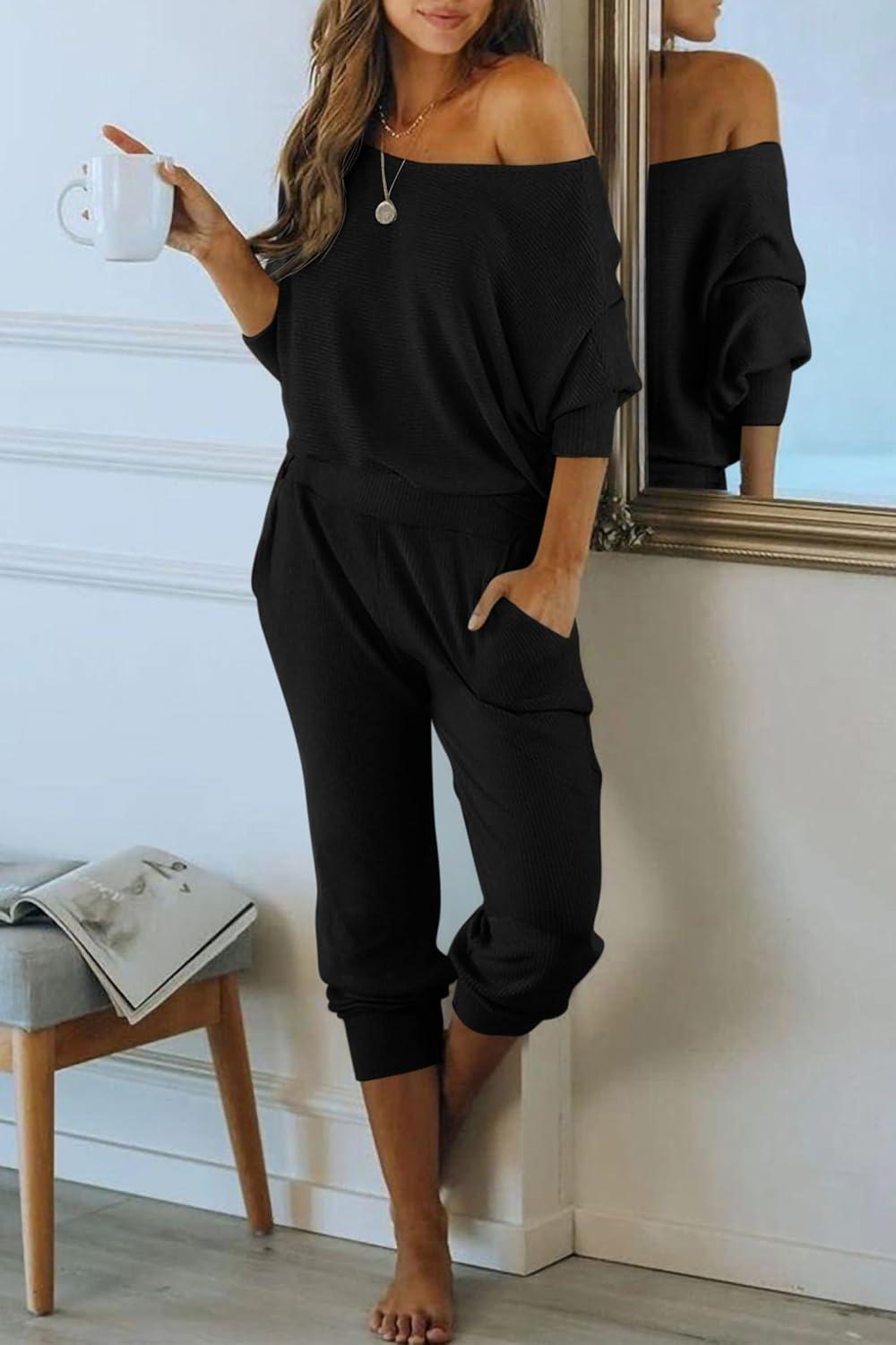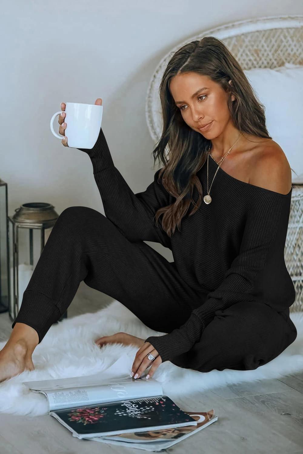 PRETTYGARDEN Two Piece Sets for Women Fall 2025 Ribbed Knit Off Shoulder Tops Lounge Pants Tracksuit Fashion Clothing(Black)