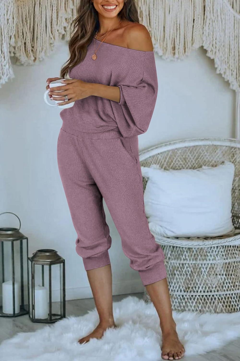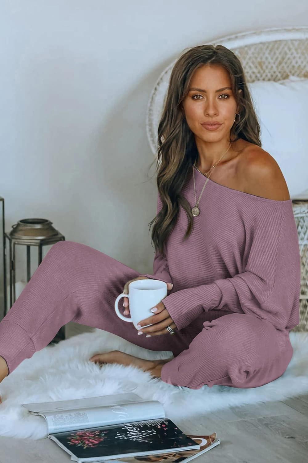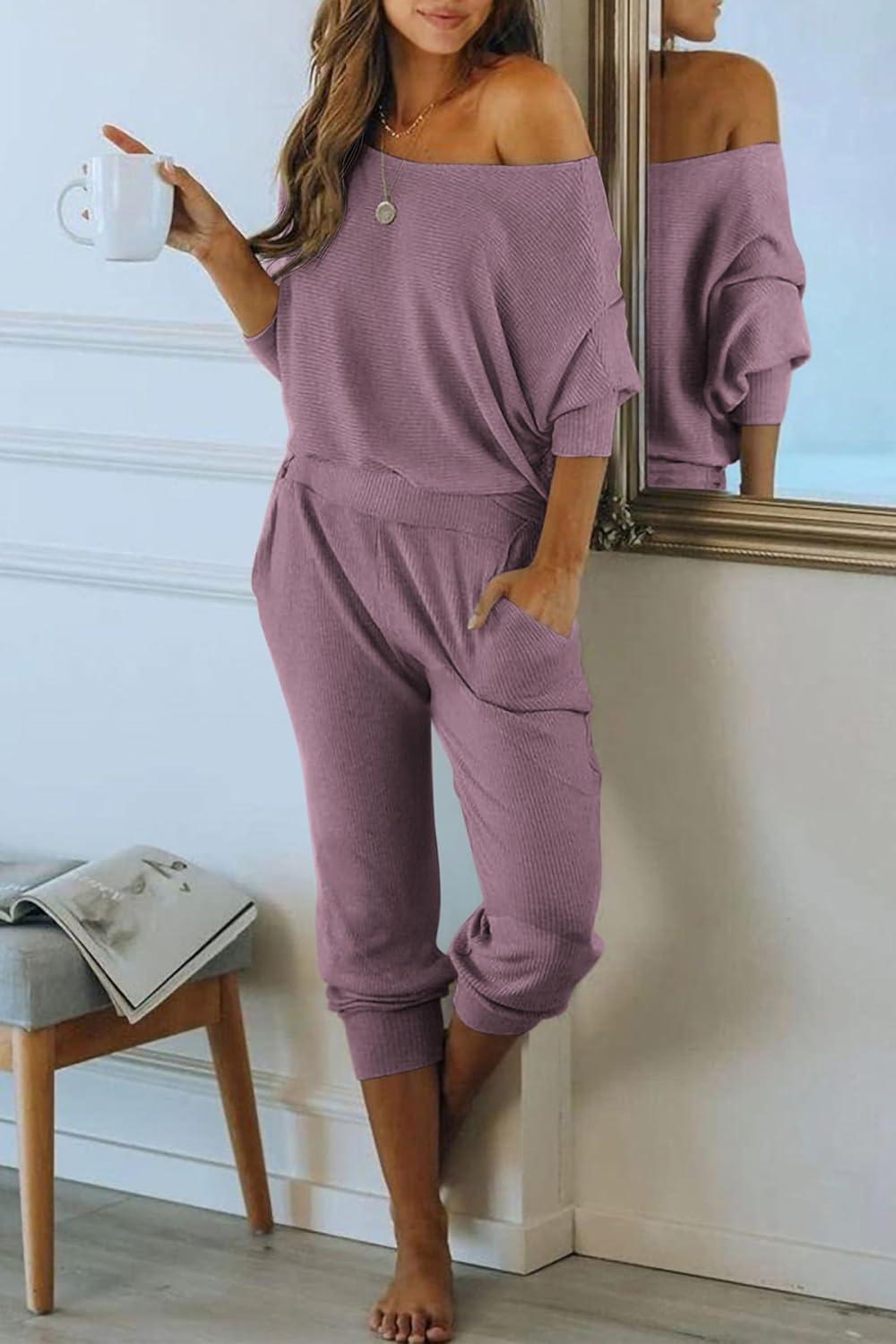 PRETTYGARDEN Two Piece Sets for Women Fall 2025 Ribbed Knit Off Shoulder Tops Lounge Pants Tracksuit Fashion Clothing(Deep Purple)