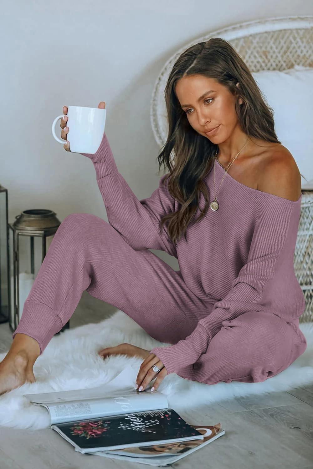 PRETTYGARDEN Two Piece Sets for Women Fall 2025 Ribbed Knit Off Shoulder Tops Lounge Pants Tracksuit Fashion Clothing(Dusty Pink)