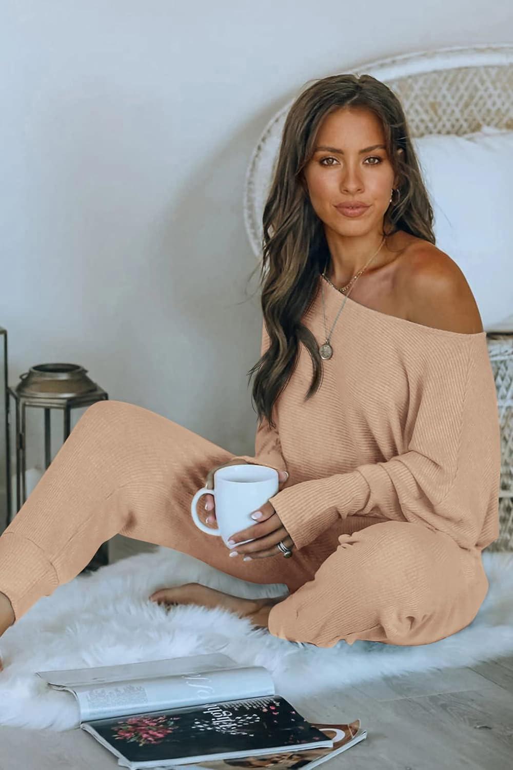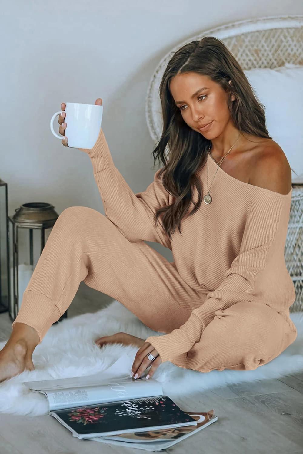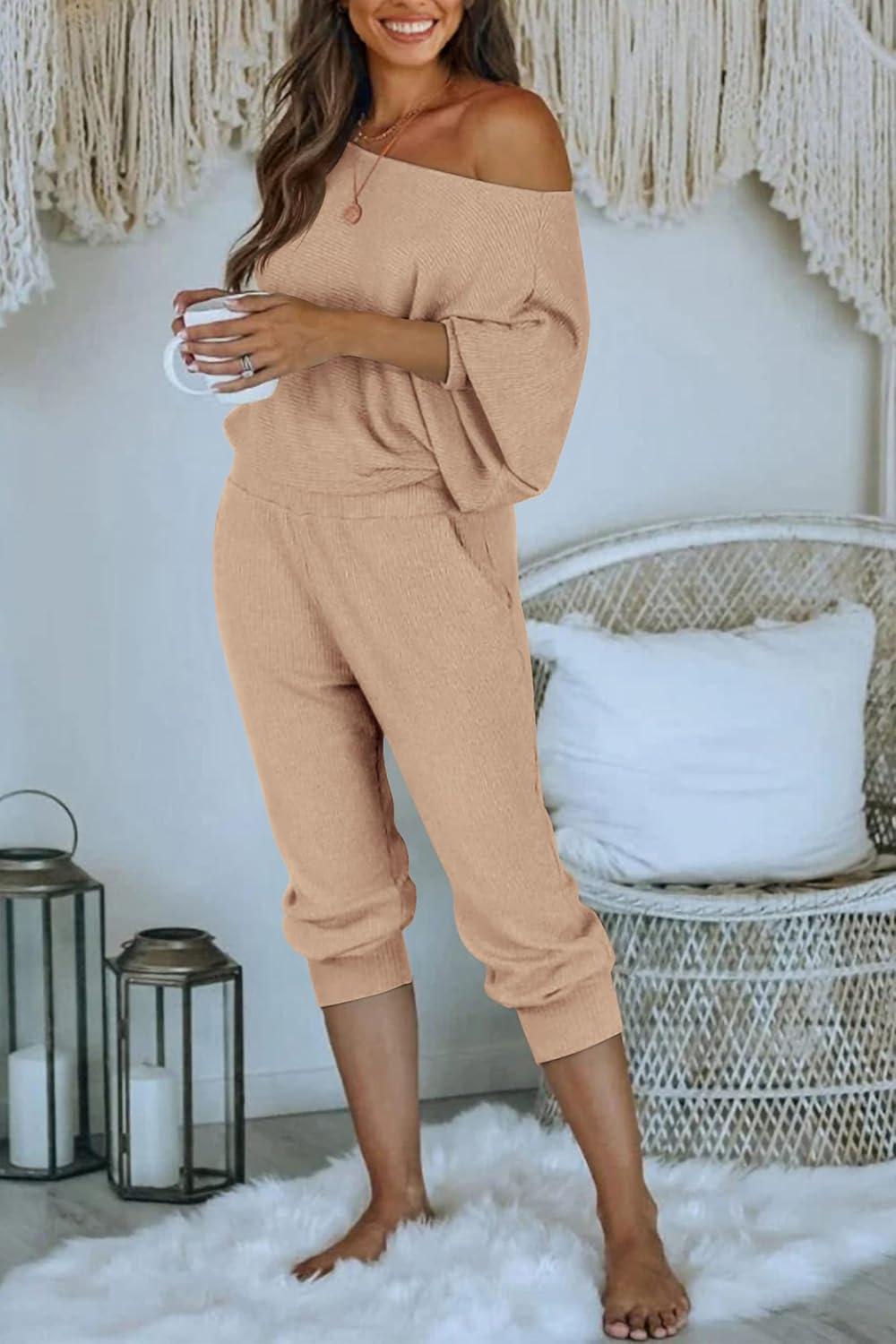 PRETTYGARDEN Two Piece Sets for Women Fall 2025 Ribbed Knit Off Shoulder Tops Lounge Pants Tracksuit Fashion Clothing(Khaki)