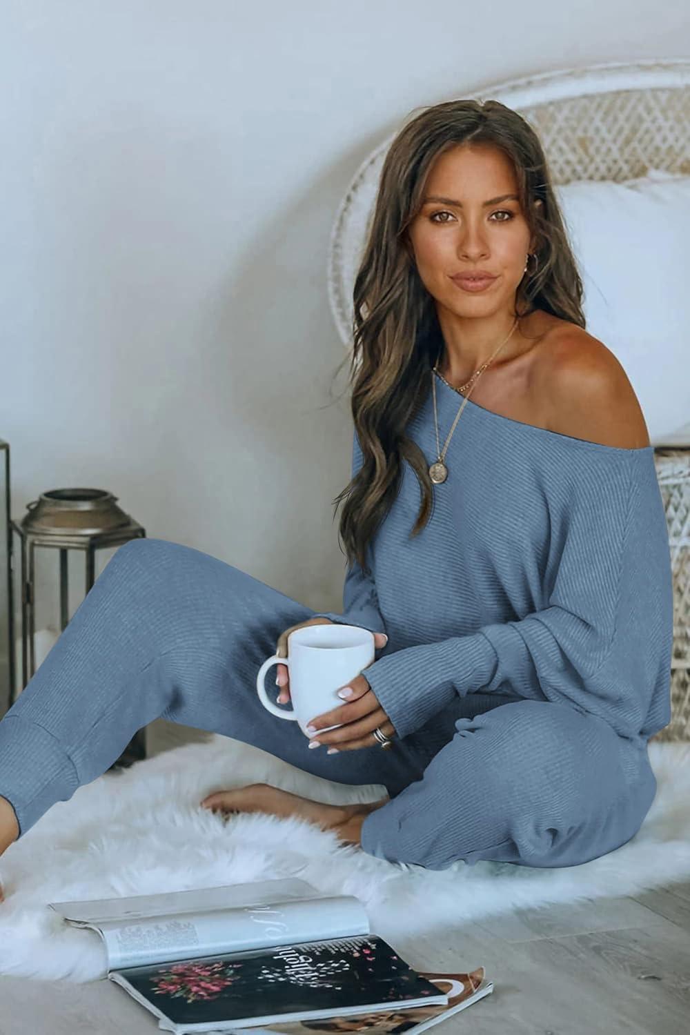 PRETTYGARDEN Two Piece Sets for Women Fall 2025 Ribbed Knit Off Shoulder Tops Lounge Pants Tracksuit Fashion Clothing(Lake Blue)