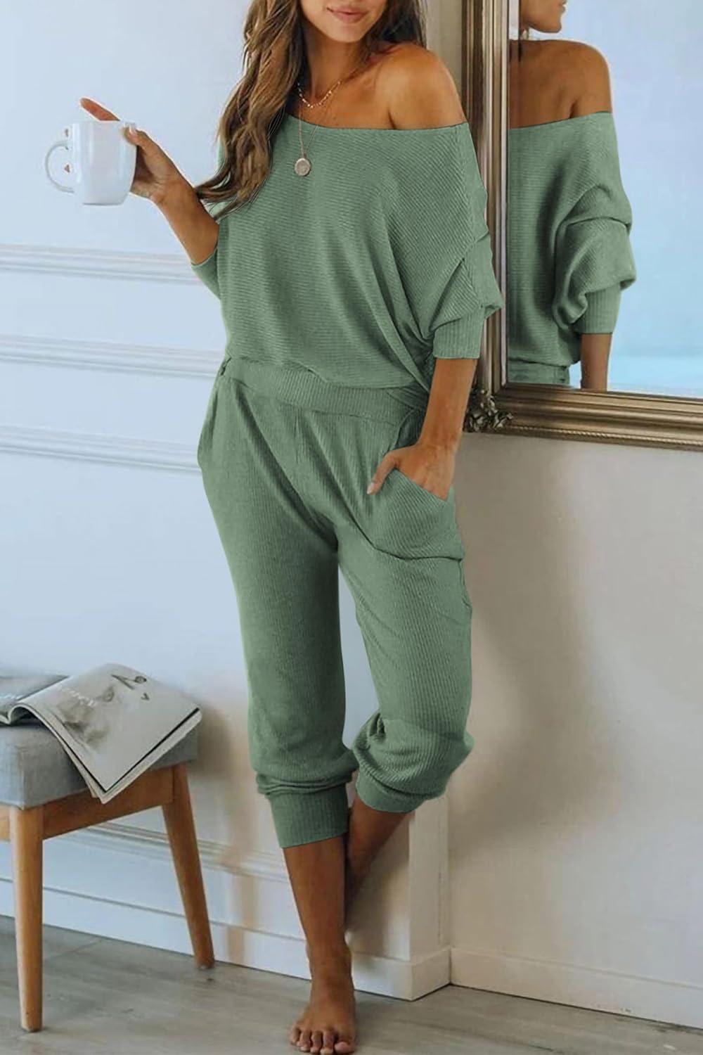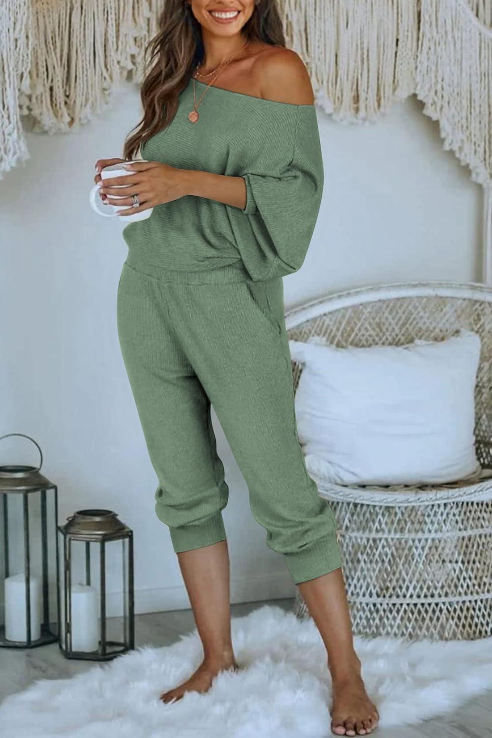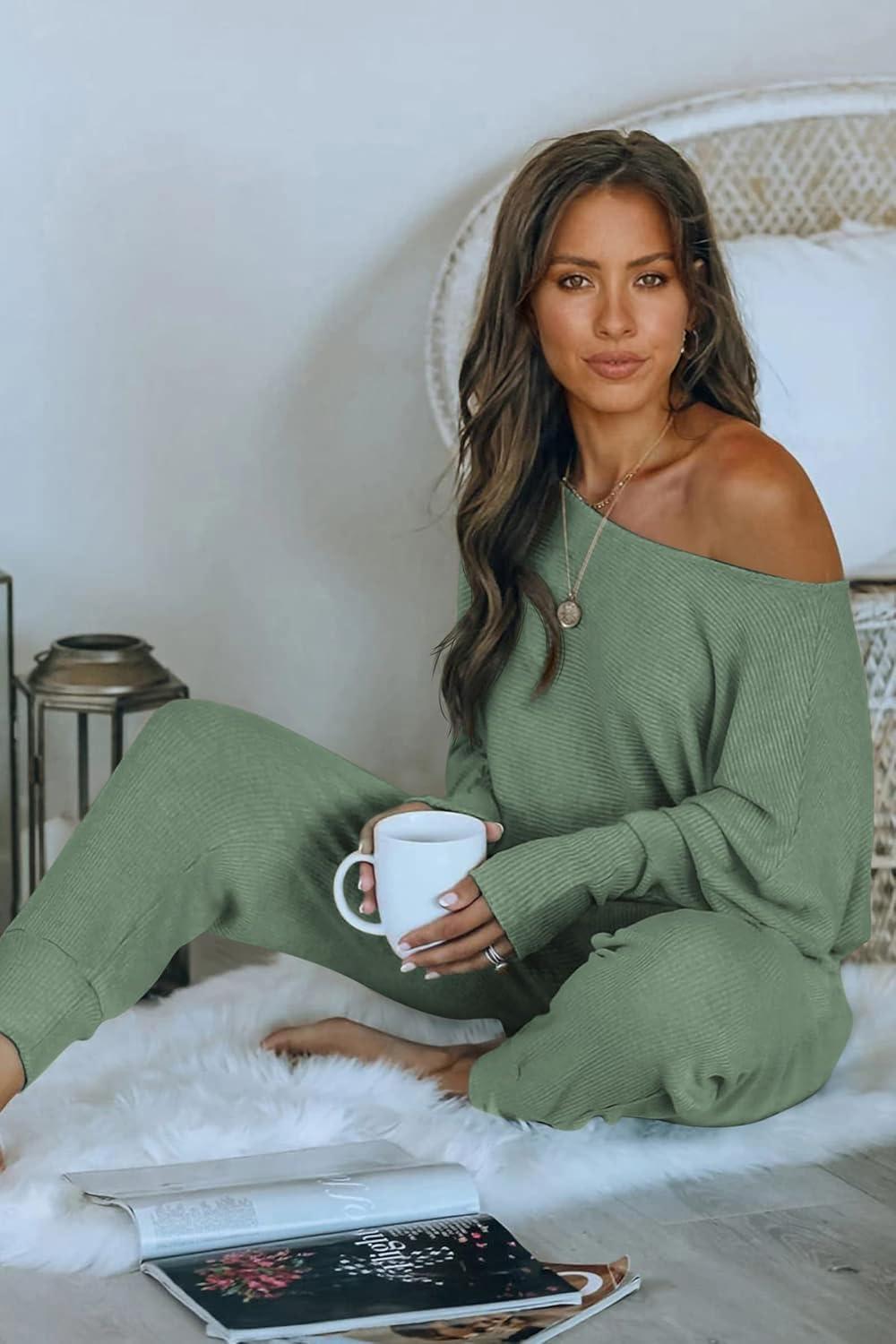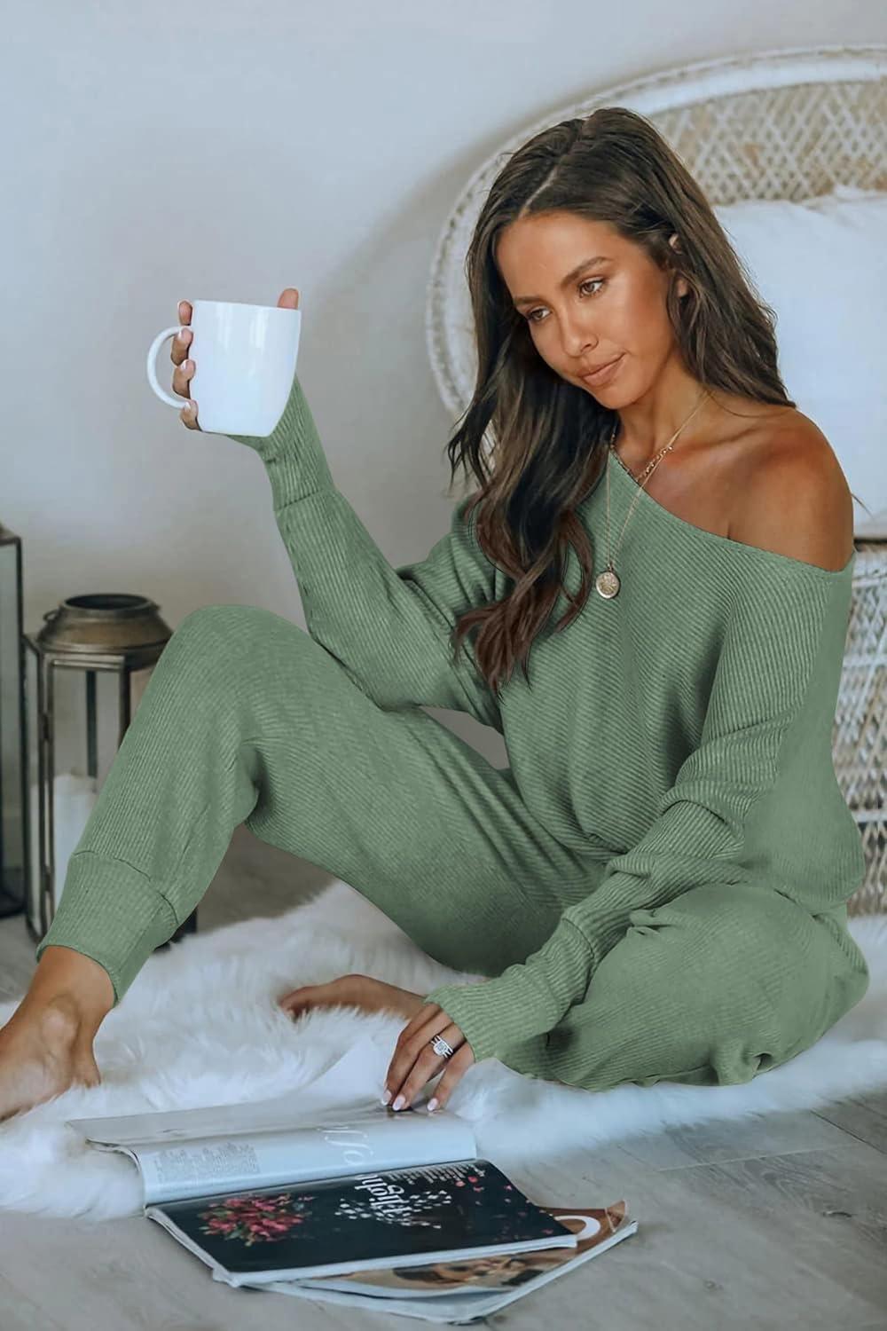 PRETTYGARDEN Two Piece Sets for Women Fall 2025 Ribbed Knit Off Shoulder Tops Lounge Pants Tracksuit Fashion Clothing(Light Green)