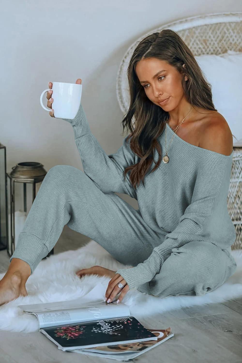 PRETTYGARDEN Two Piece Sets for Women Fall 2025 Ribbed Knit Off Shoulder Tops Lounge Pants Tracksuit Fashion Clothing(Light Grey)