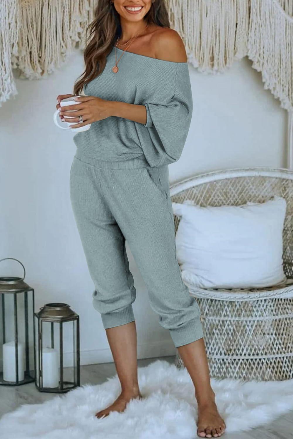 PRETTYGARDEN Two Piece Sets for Women Fall 2025 Ribbed Knit Off Shoulder Tops Lounge Pants Tracksuit Fashion Clothing(Light Grey Blue)