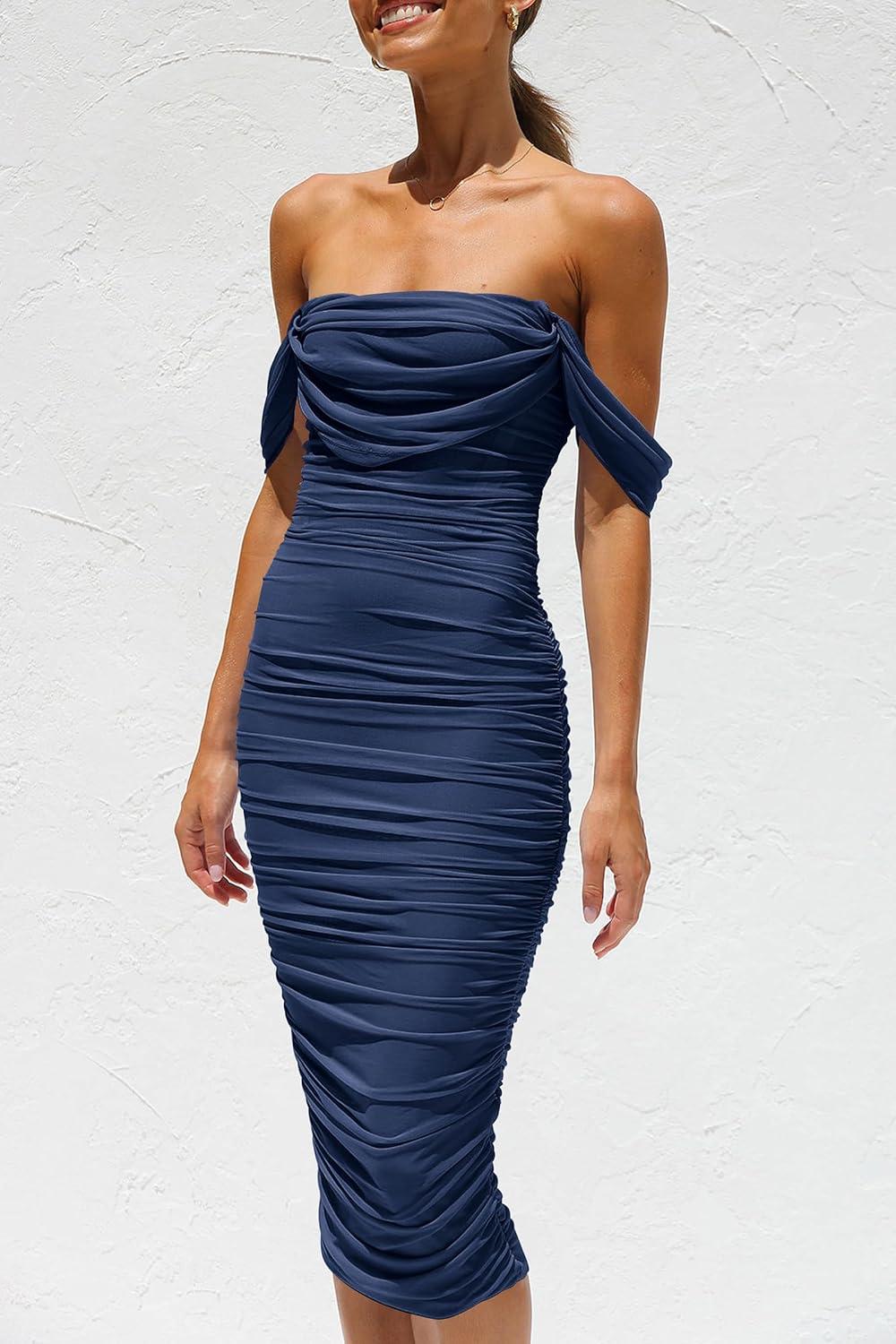 PRETTYGARDEN Wedding Guest Dress 2025 Summer Off Shoulder Ruched Elegant Sexy Bodycon Homecoming Cocktail Party Midi Dress(Navy)