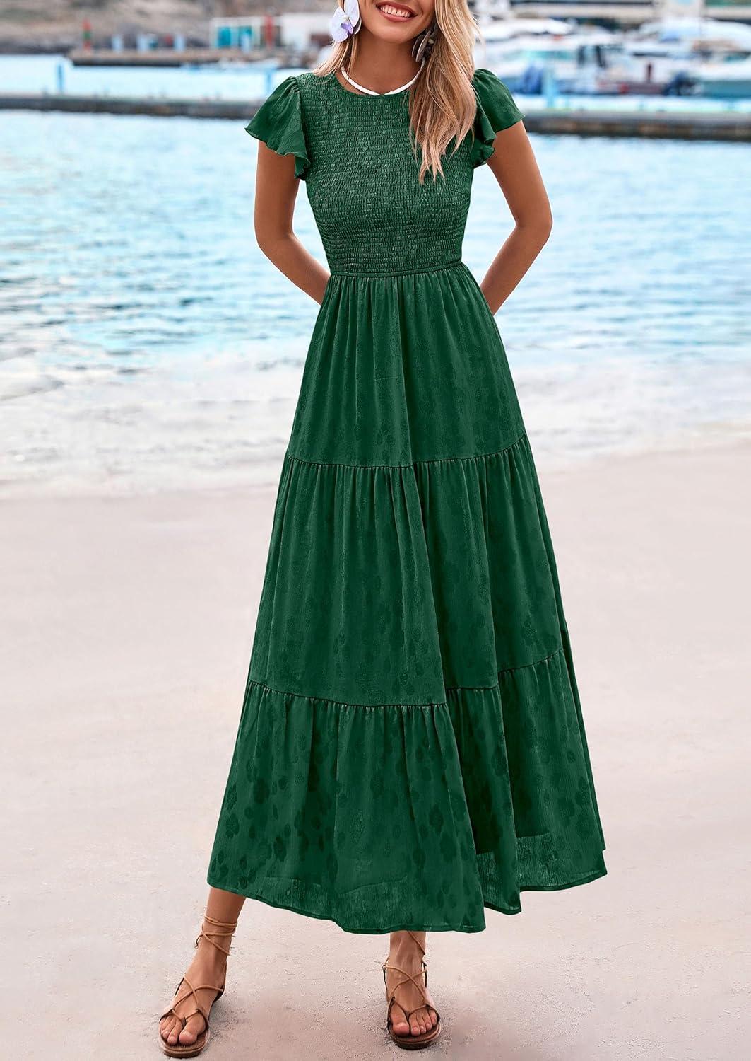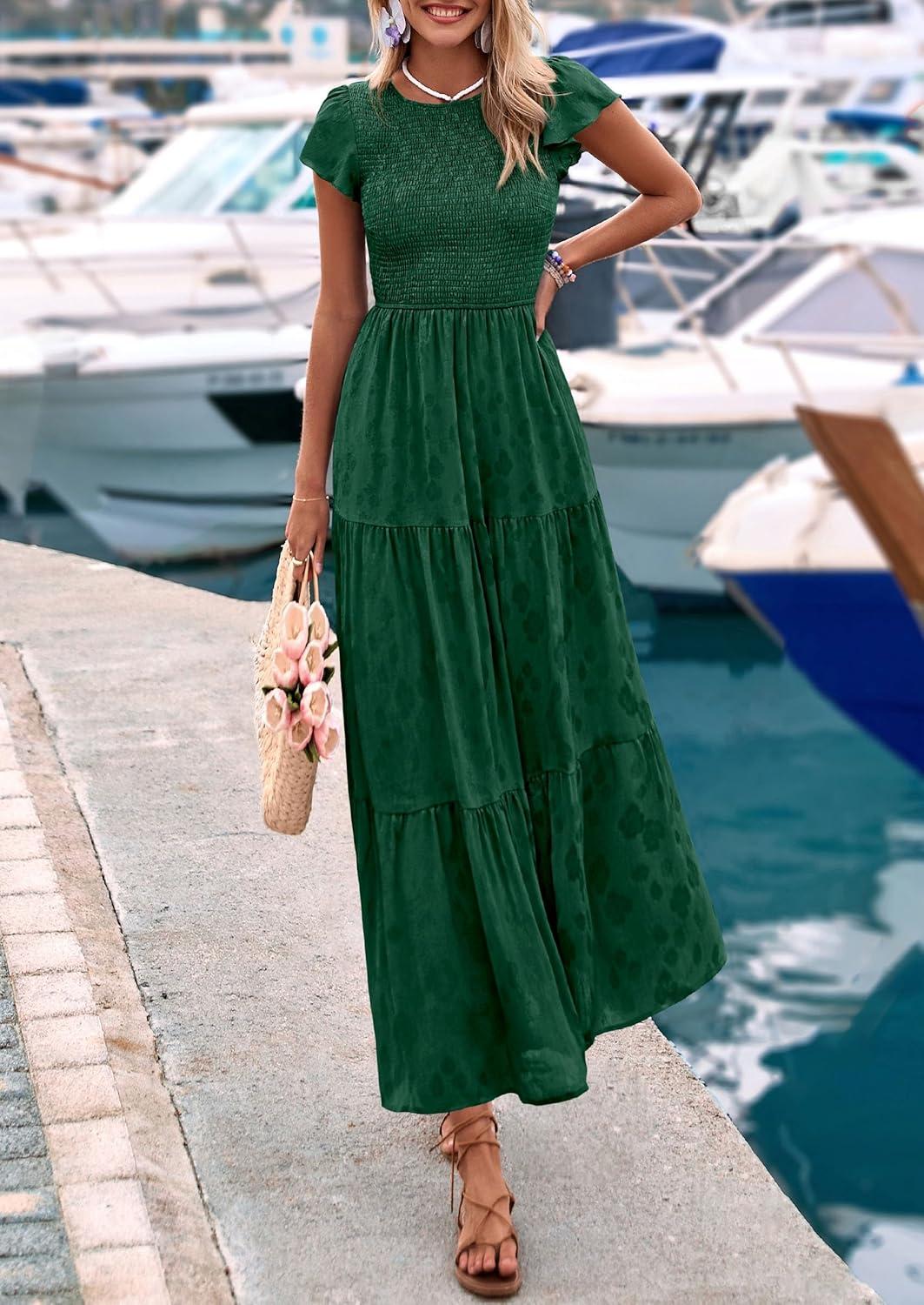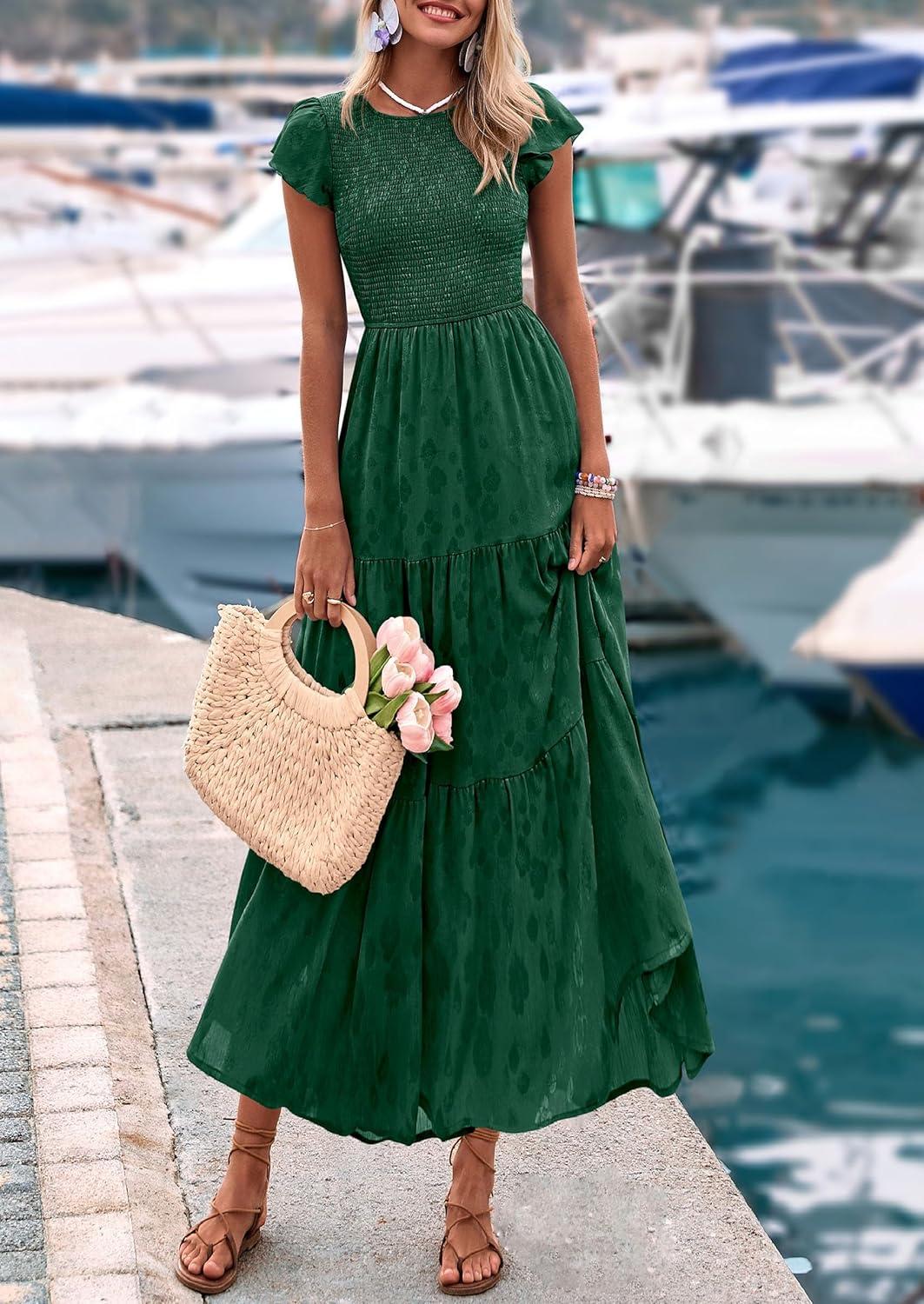 PRETTYGARDEN Wedding Guest Dresses for Women 2025 Summer Floral Cap Sleeve Smocked A Line Long Elegant Party Boho Dress(Dark Green)