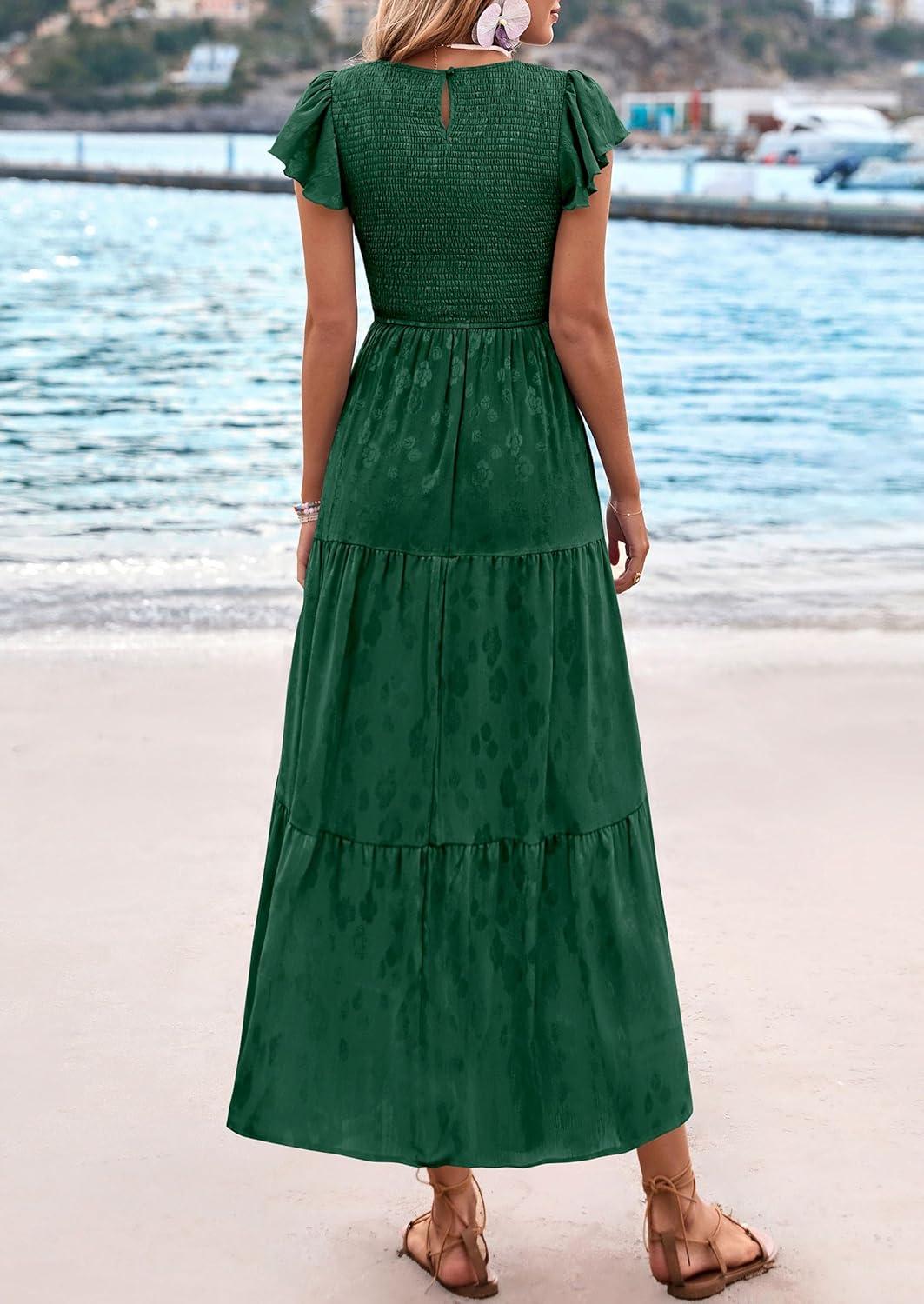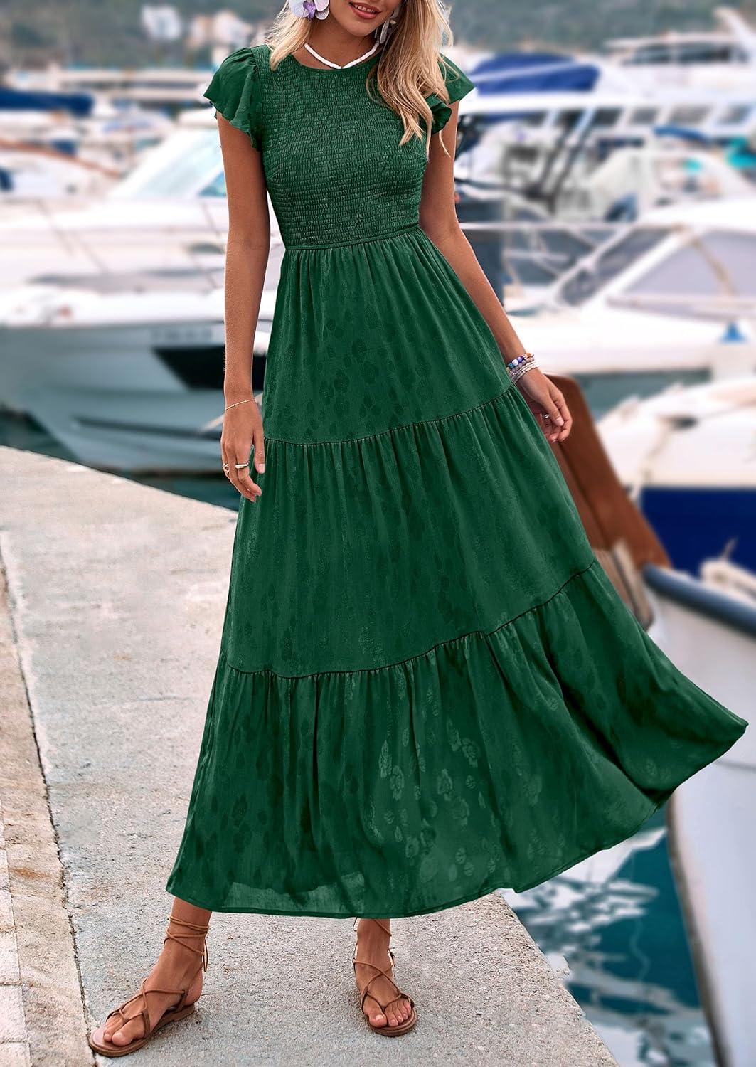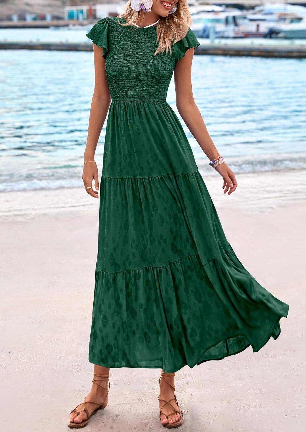 PRETTYGARDEN Wedding Guest Dresses for Women 2025 Summer Floral Cap Sleeve Smocked A Line Long Elegant Party Boho Dress(Dark Green)