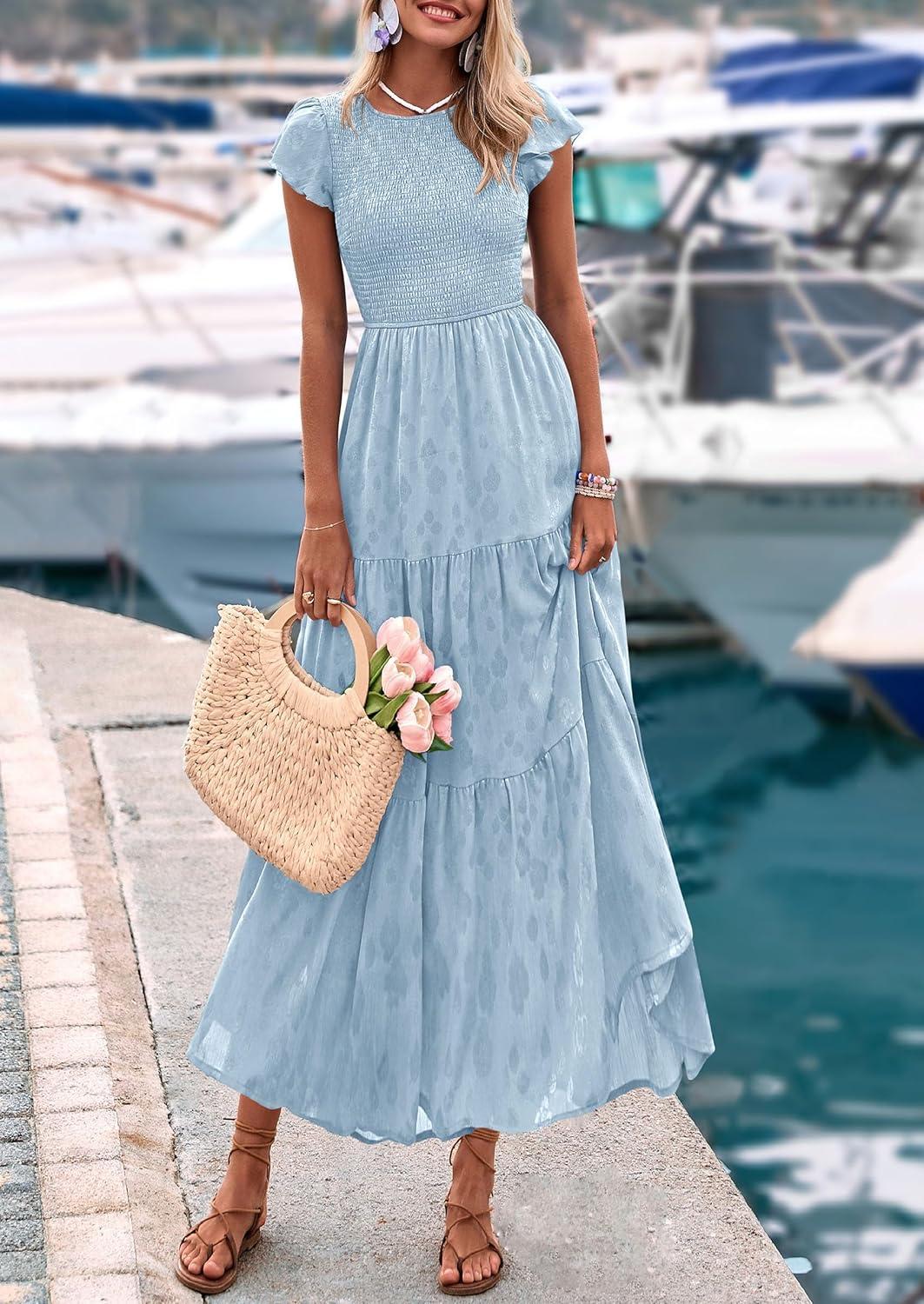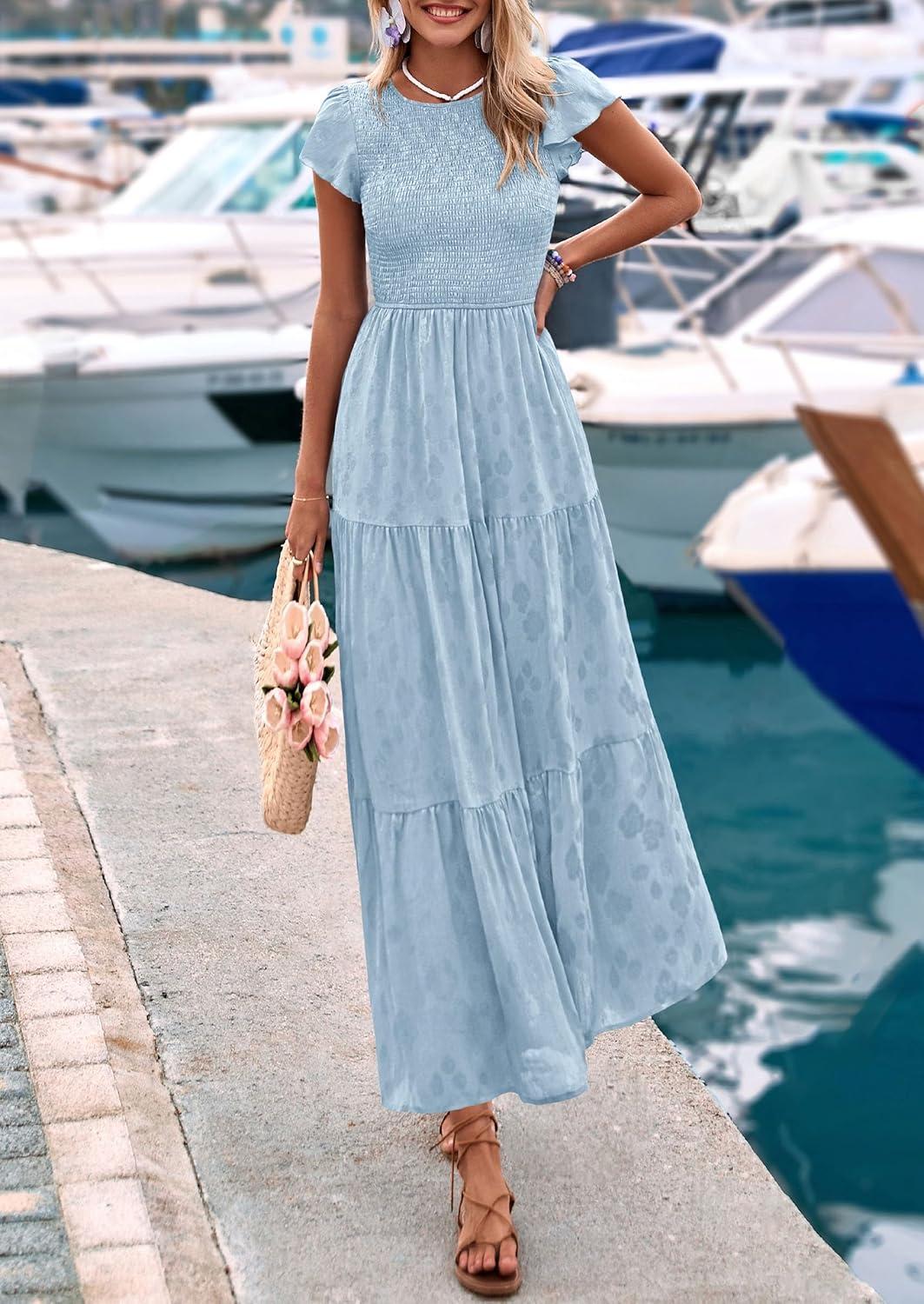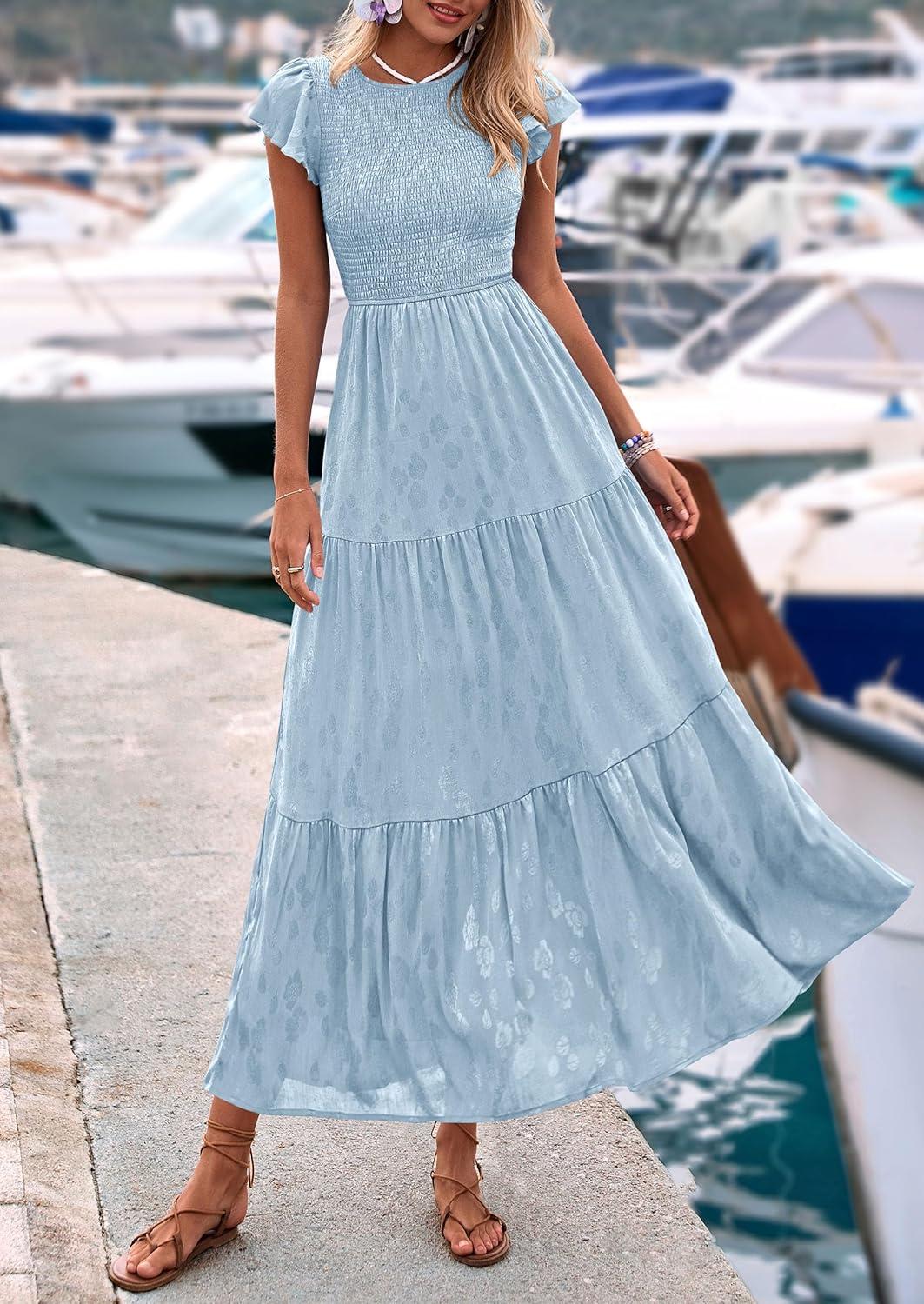 PRETTYGARDEN Wedding Guest Dresses for Women 2025 Summer Floral Cap Sleeve Smocked A Line Long Elegant Party Boho Dress(Light Blue)