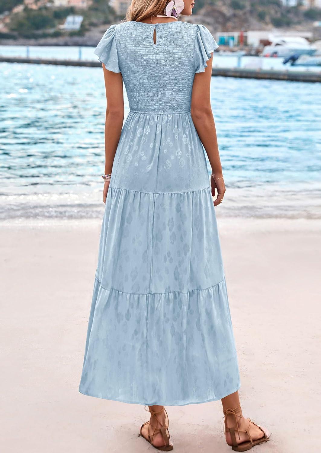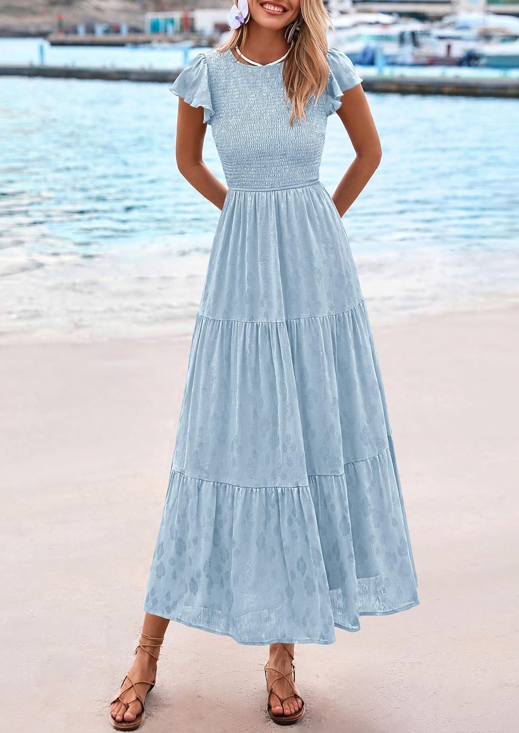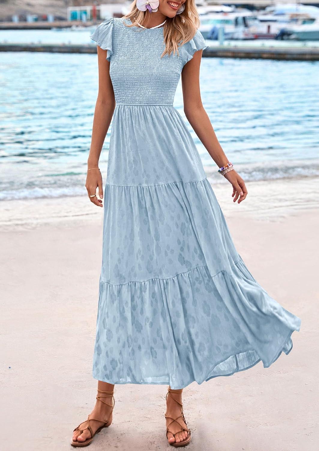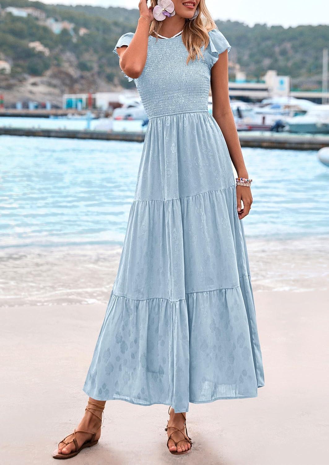 PRETTYGARDEN Wedding Guest Dresses for Women 2025 Summer Floral Cap Sleeve Smocked A Line Long Elegant Party Boho Dress(Light Blue)