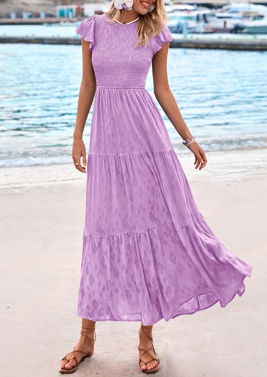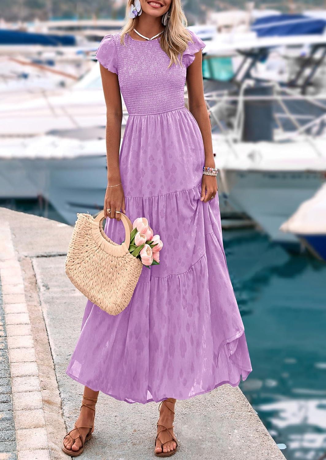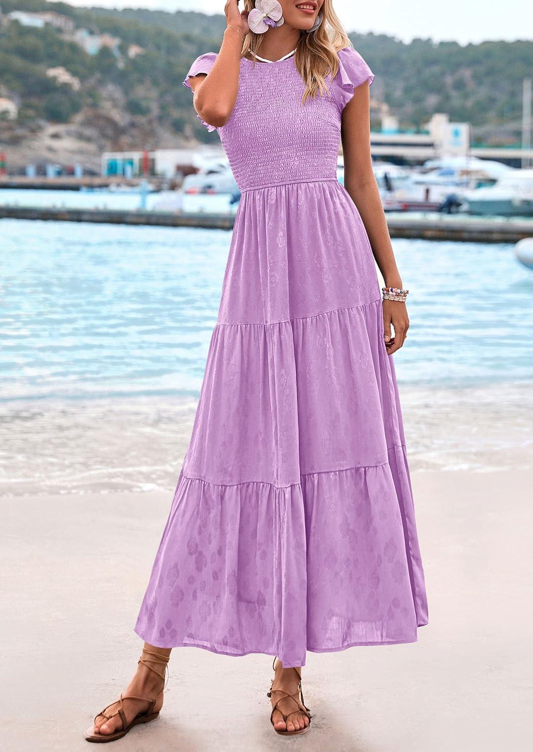 PRETTYGARDEN Wedding Guest Dresses for Women 2025 Summer Floral Cap Sleeve Smocked A Line Long Elegant Party Boho Dress(Light Purple)