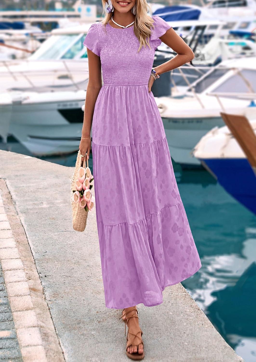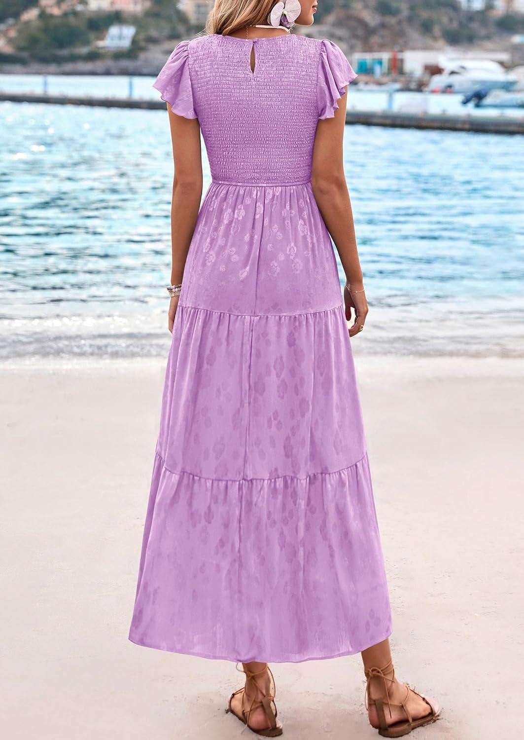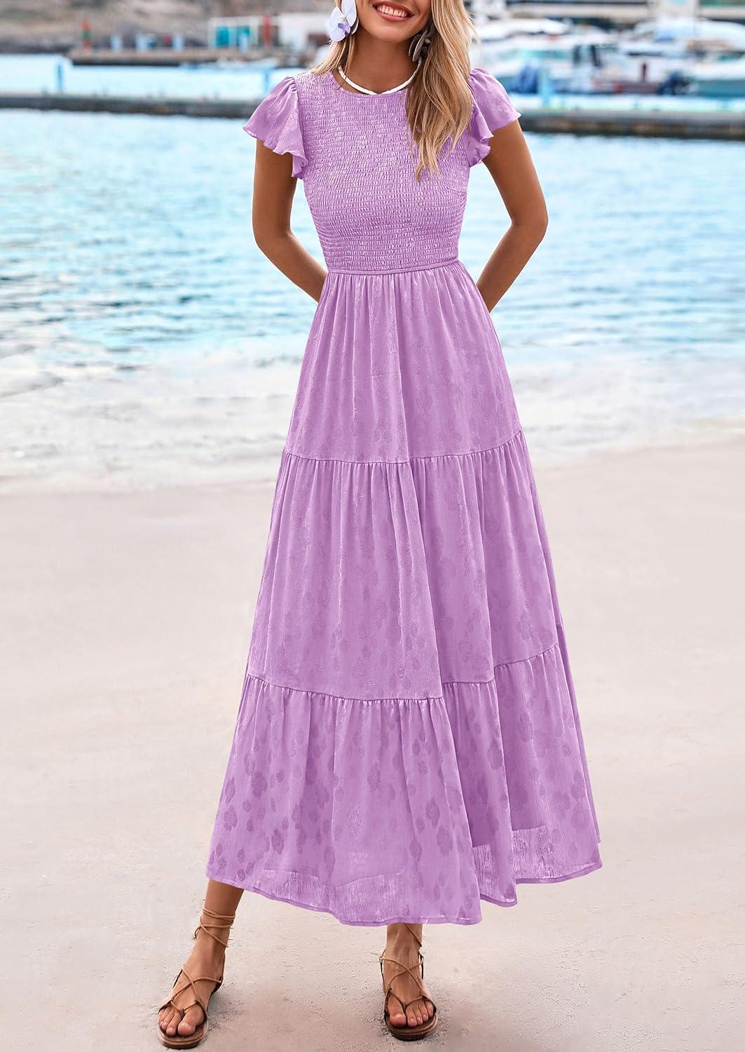 PRETTYGARDEN Wedding Guest Dresses for Women 2025 Summer Floral Cap Sleeve Smocked A Line Long Elegant Party Boho Dress(Light Purple)