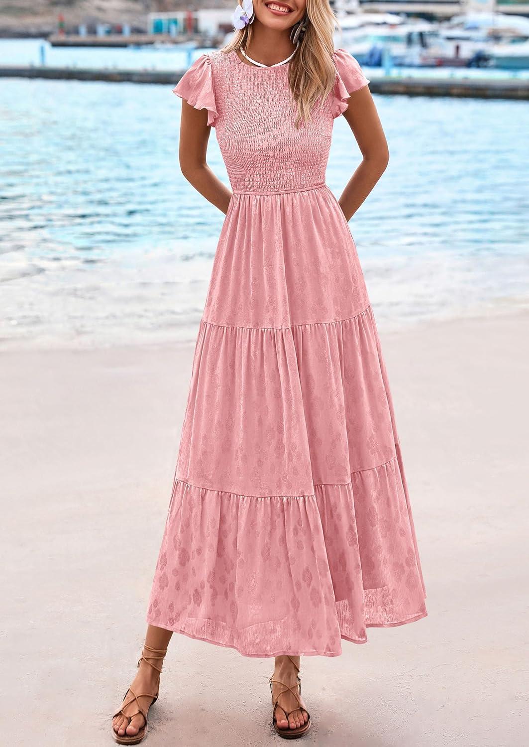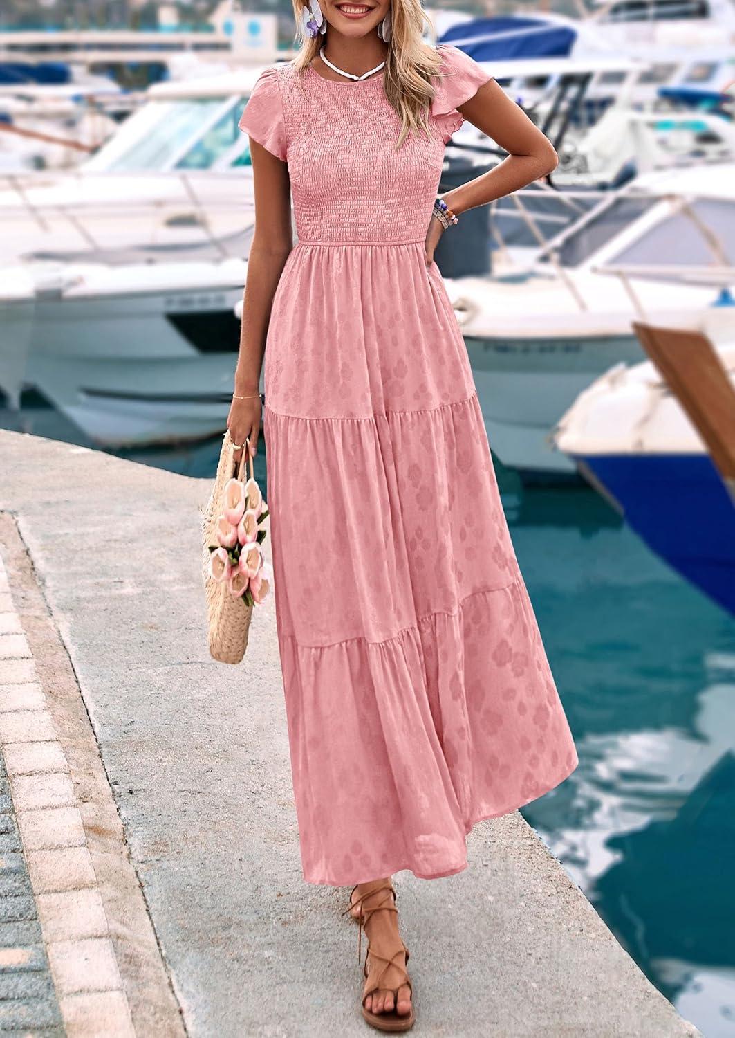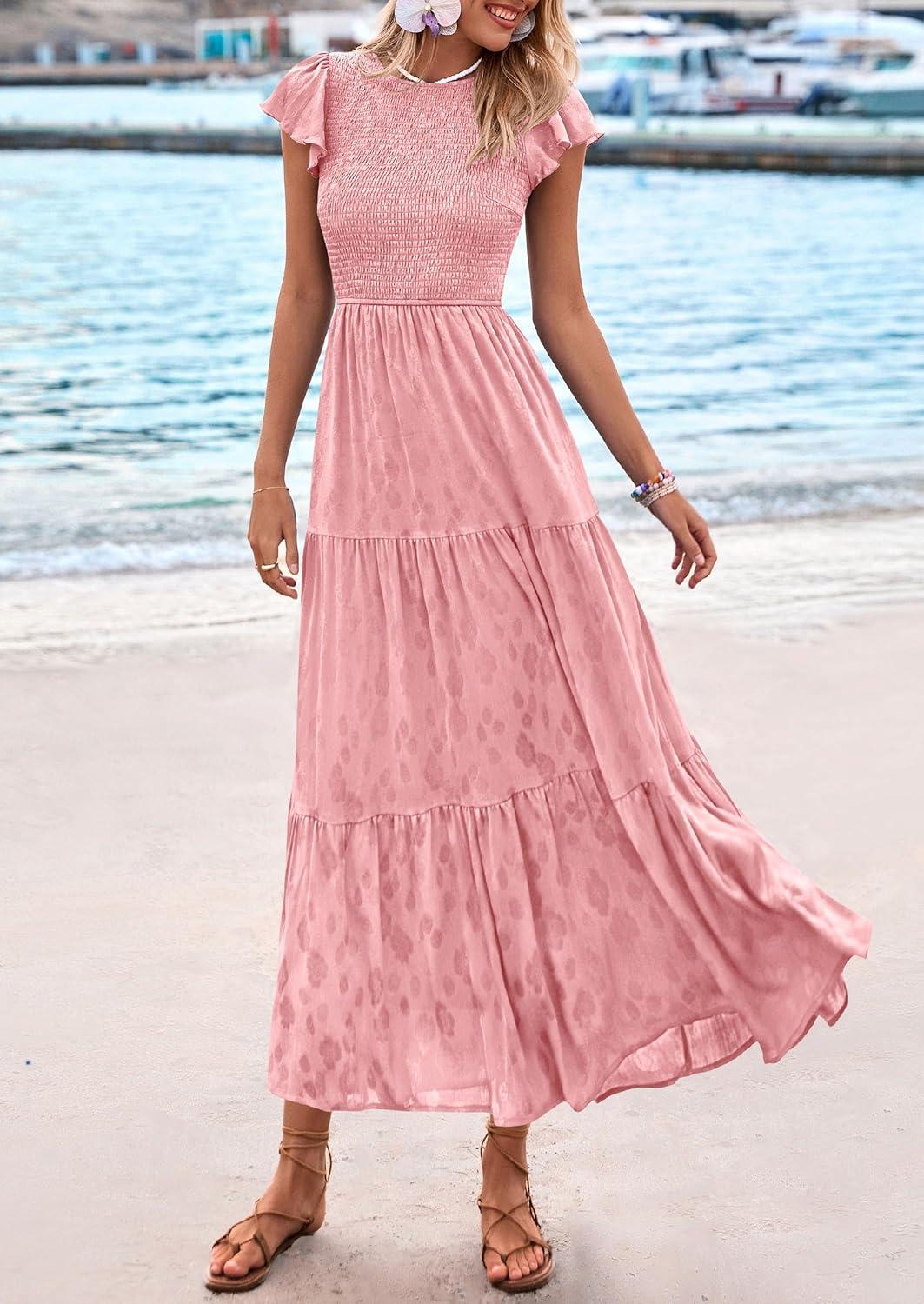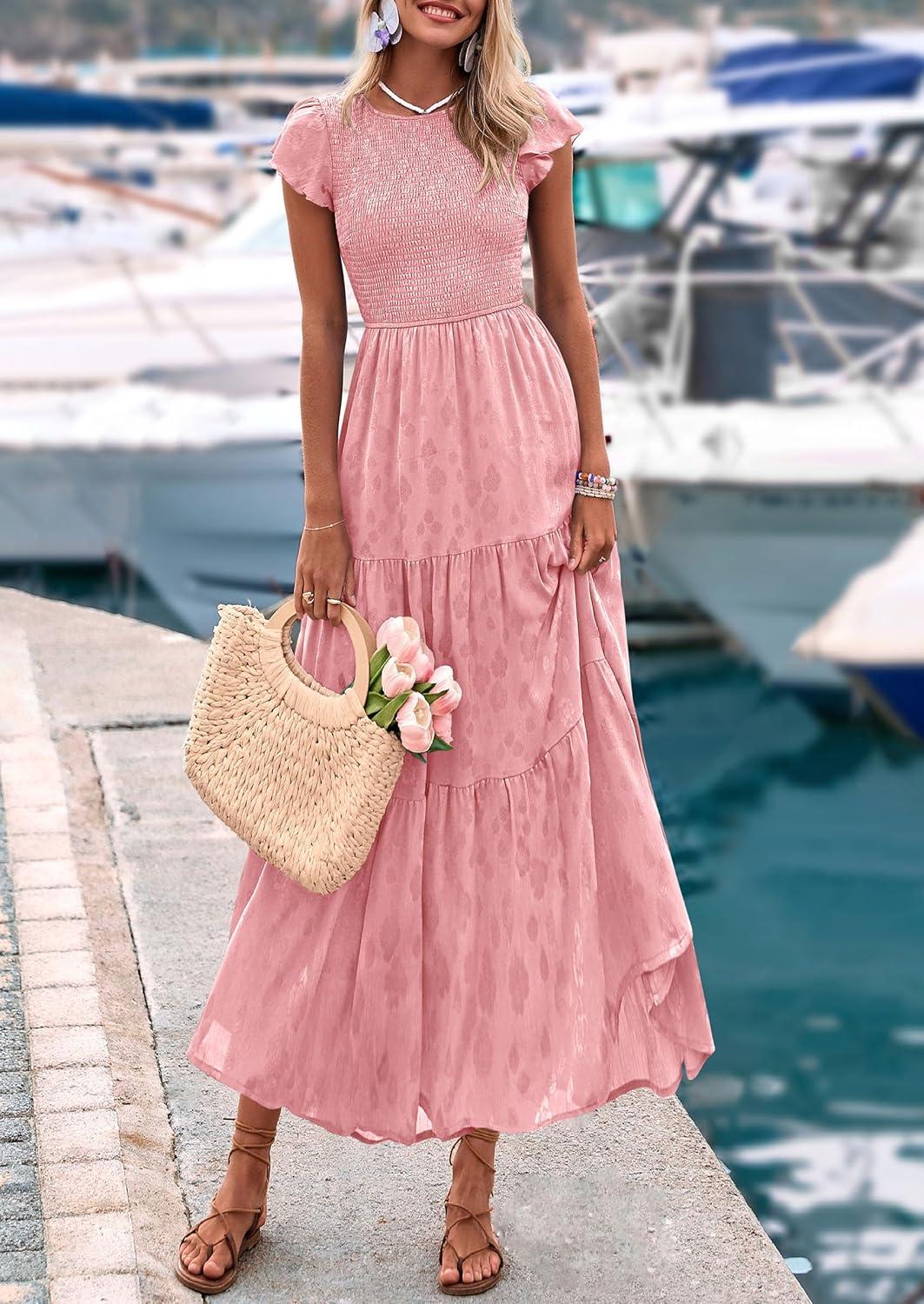 PRETTYGARDEN Wedding Guest Dresses for Women 2025 Summer Floral Cap Sleeve Smocked A Line Long Elegant Party Boho Dress(Pink)