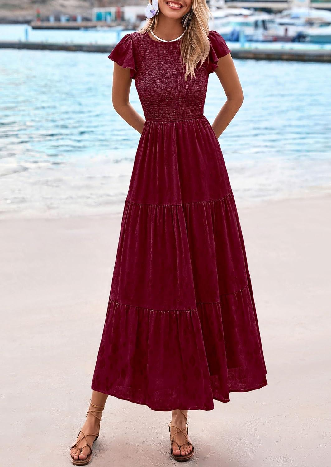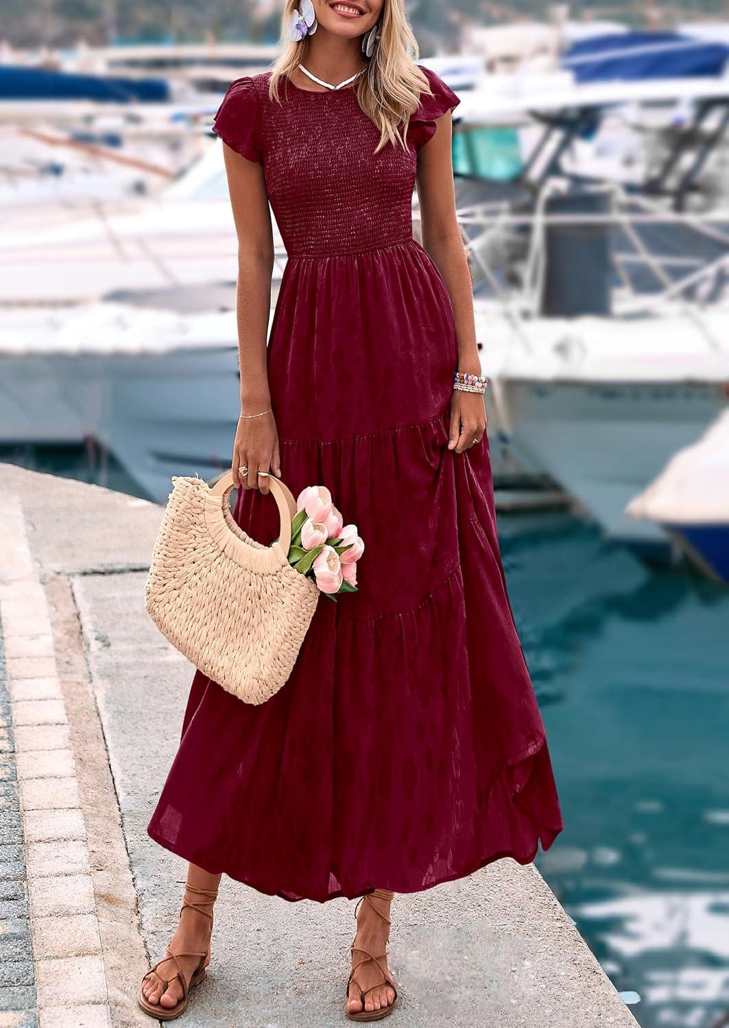 PRETTYGARDEN Wedding Guest Dresses for Women 2025 Summer Floral Cap Sleeve Smocked A Line Long Elegant Party Boho Dress(Wine Red)