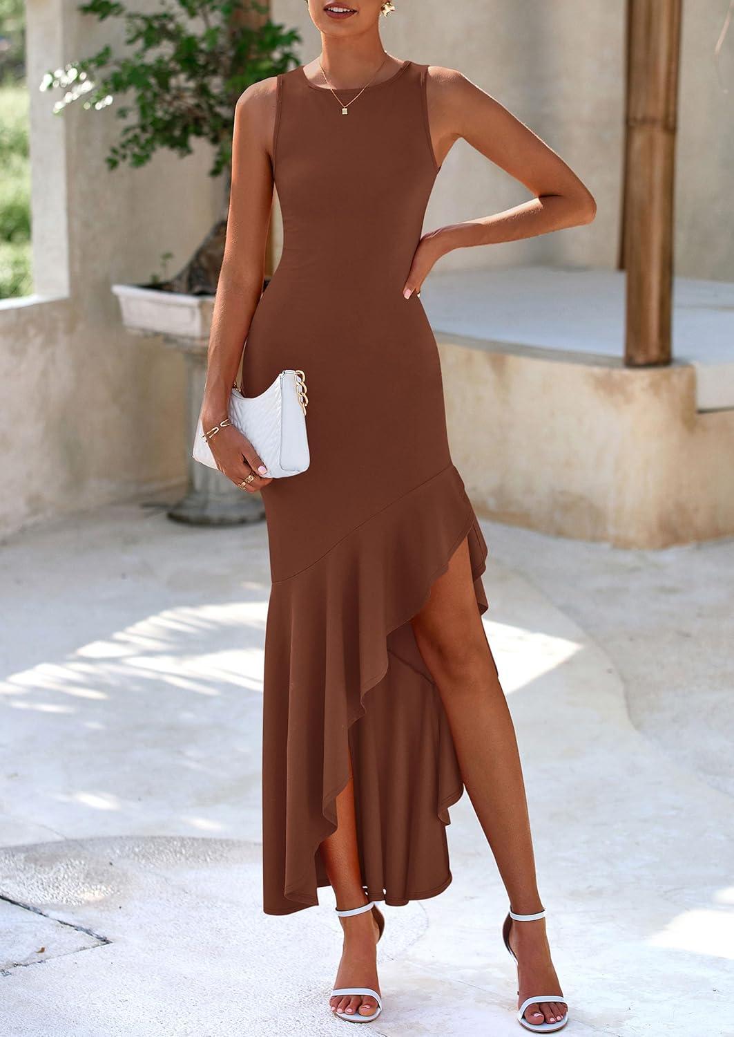 PRETTYGARDEN Wedding Guest Dresses for Women 2025 Summer Formal Gala Maxi Dress Ruffle Mermaid Cocktail Long Dresses(Coffee)