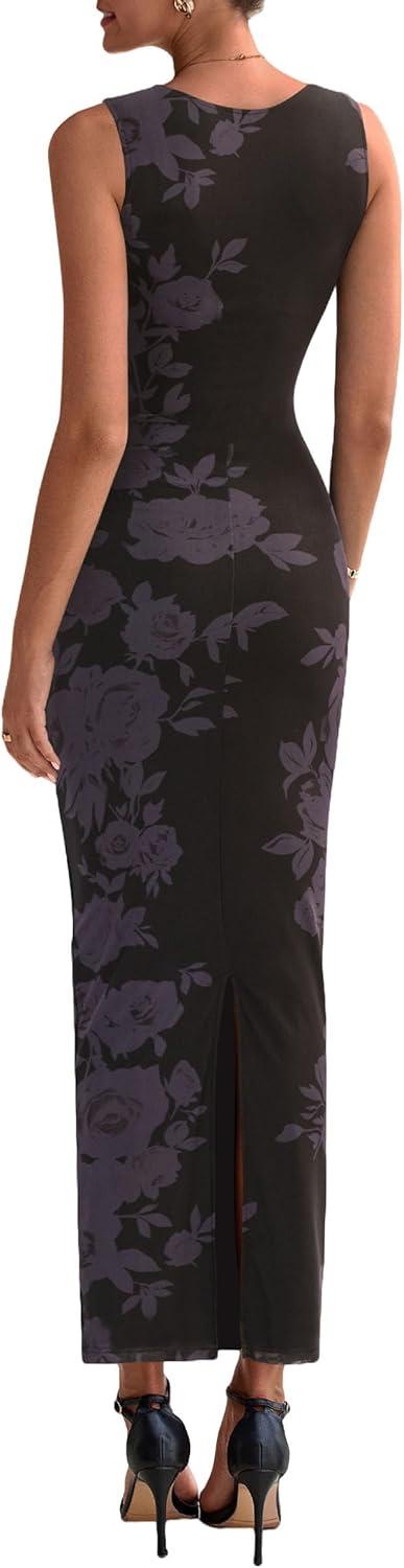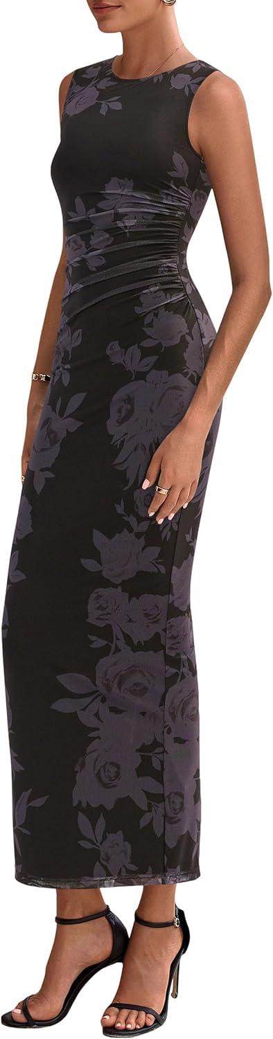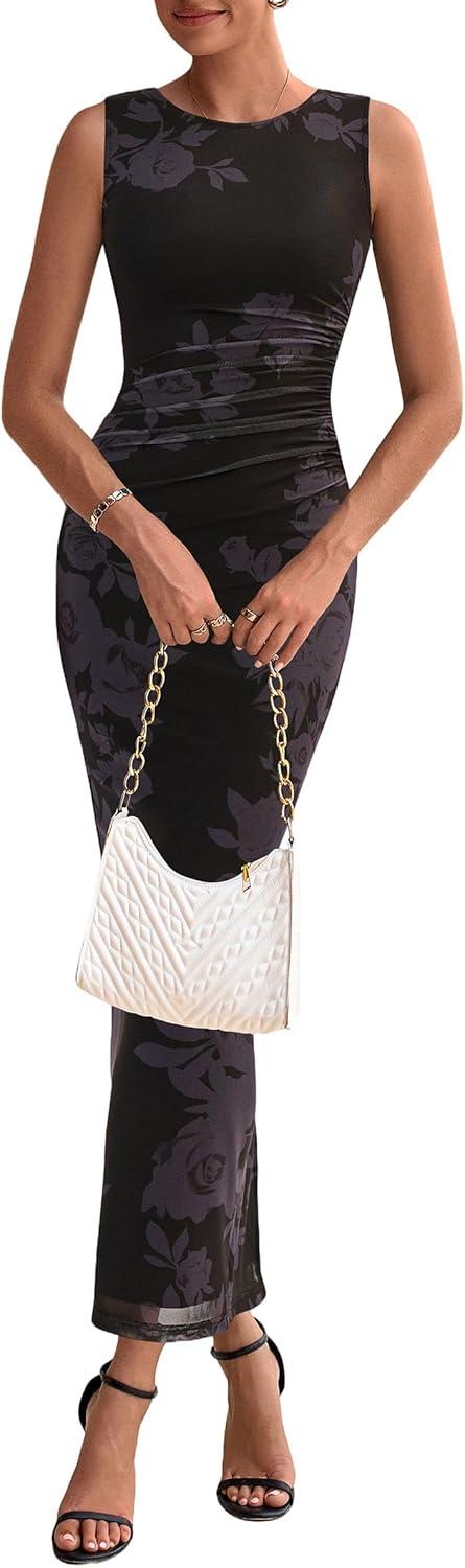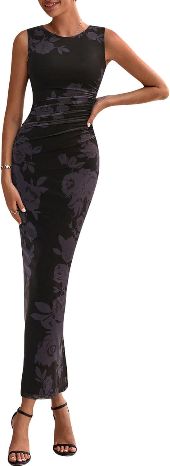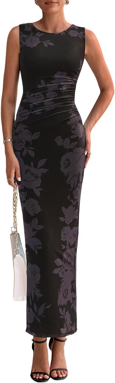 PRETTYGARDEN Wedding Guest Dresses for Women 2025 Summer Spring Floral Bodycon Sleeveless Mesh Maxi Long Dress(Floral Black)