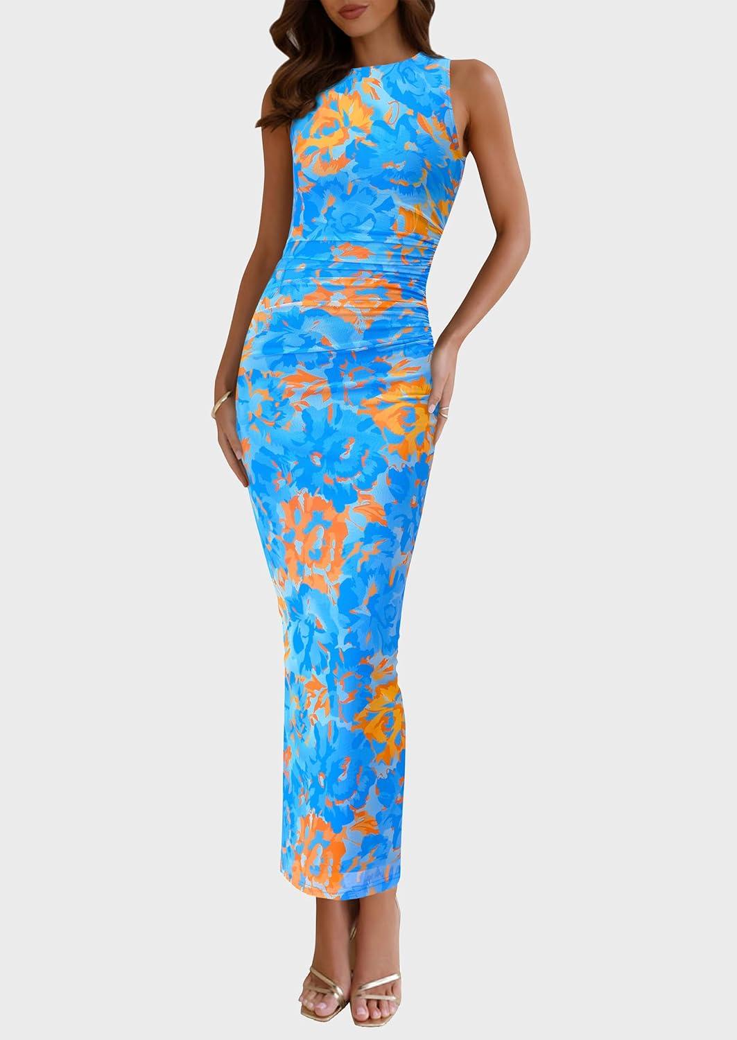 PRETTYGARDEN Wedding Guest Dresses for Women 2025 Summer Spring Floral Bodycon Sleeveless Mesh Maxi Long Dress(Floral Blue)