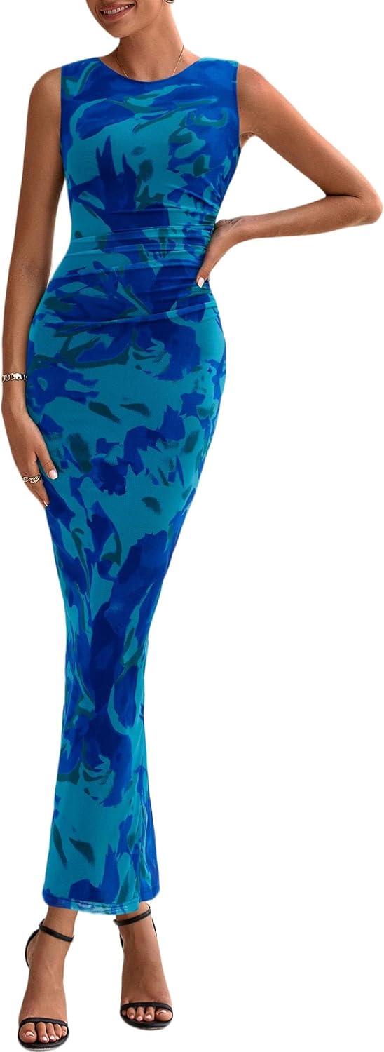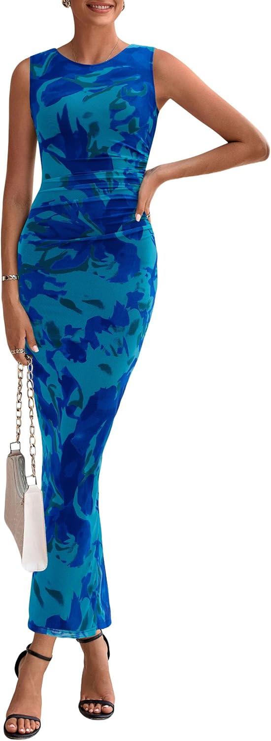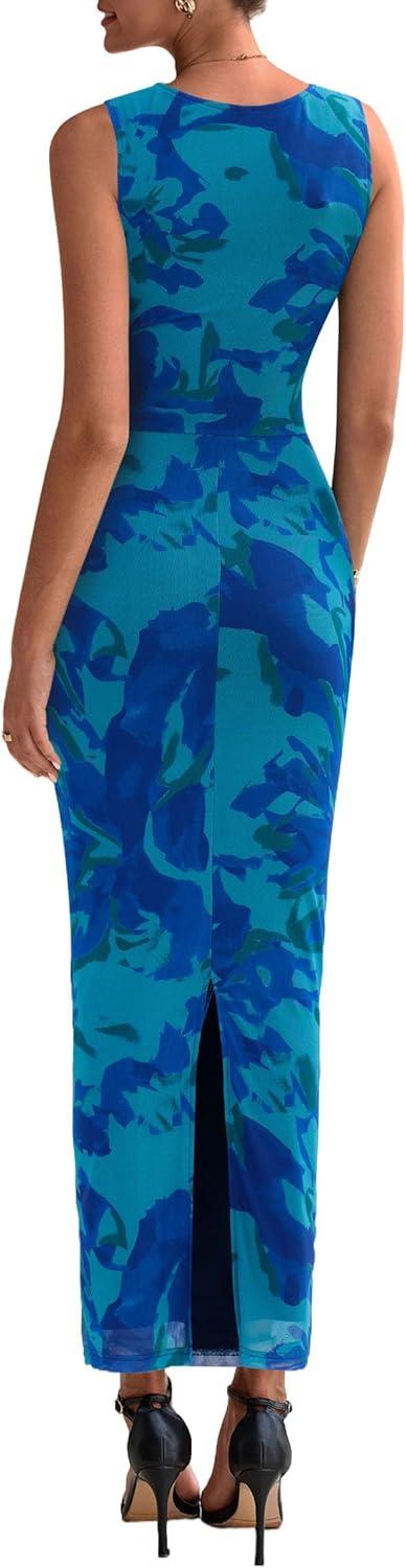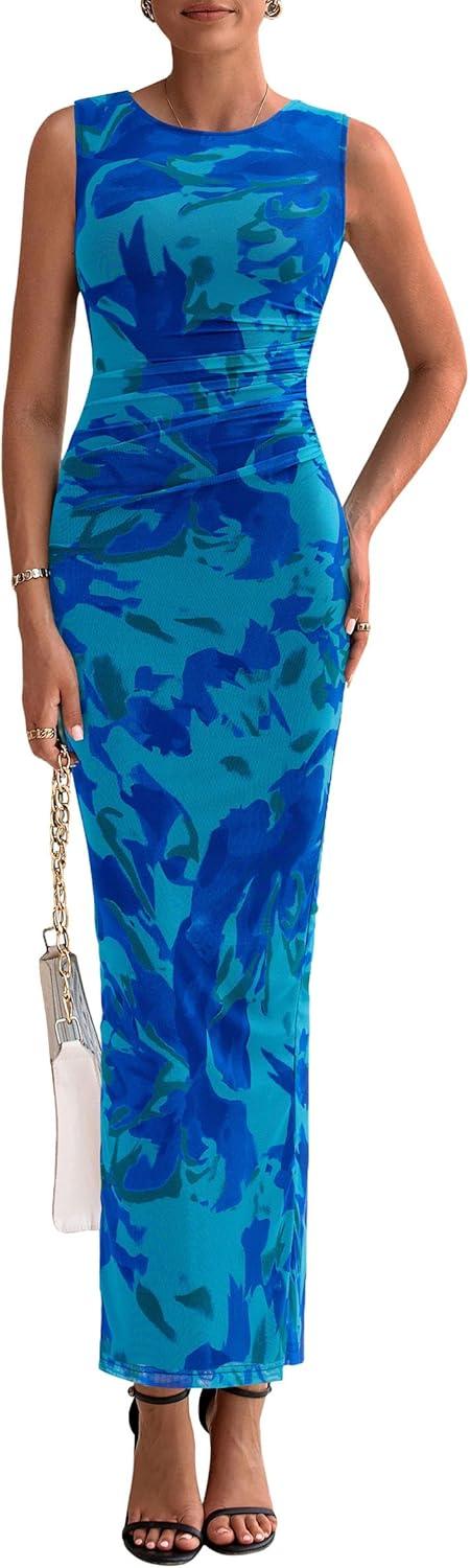 PRETTYGARDEN Wedding Guest Dresses for Women 2025 Summer Spring Floral Bodycon Sleeveless Mesh Maxi Long Dress(Green Blue Flower)