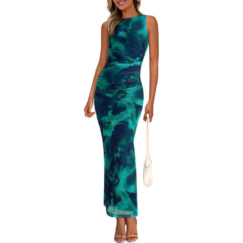 PRETTYGARDEN Wedding Guest Dresses for Women 2025 Summer Spring Floral Bodycon Sleeveless Mesh Maxi Long Dress(Green Floral)