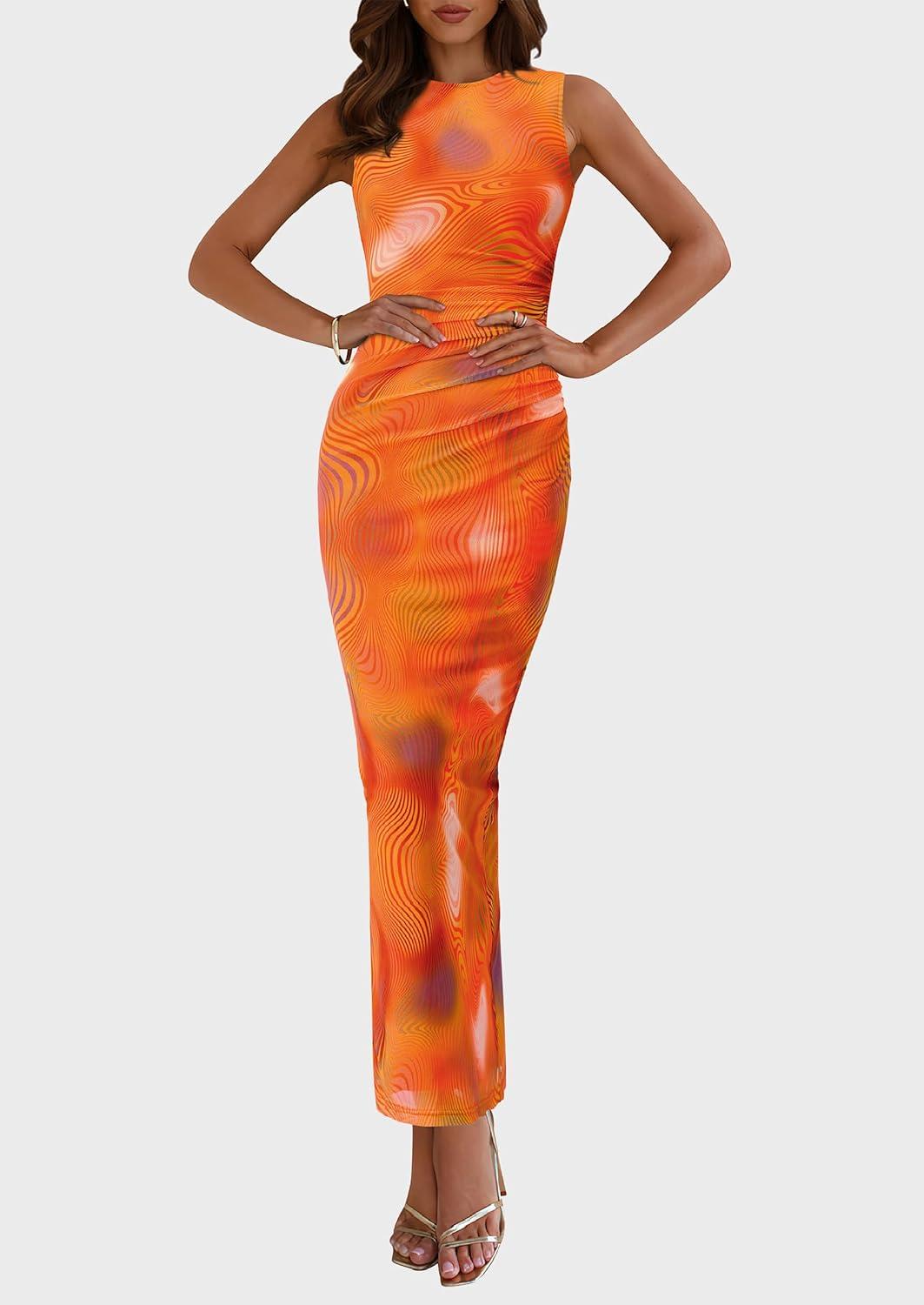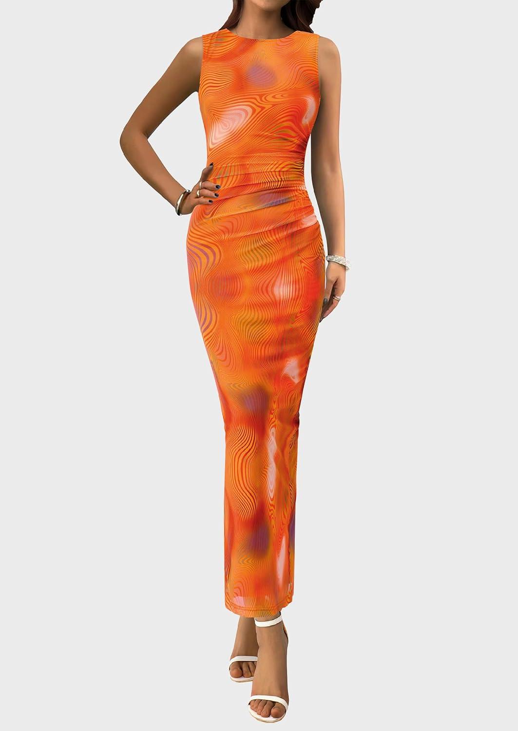 PRETTYGARDEN Wedding Guest Dresses for Women 2025 Summer Spring Floral Bodycon Sleeveless Mesh Maxi Long Dress(Print Orange)