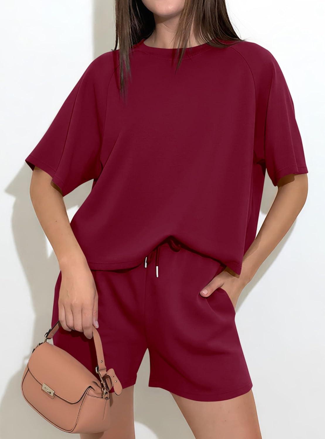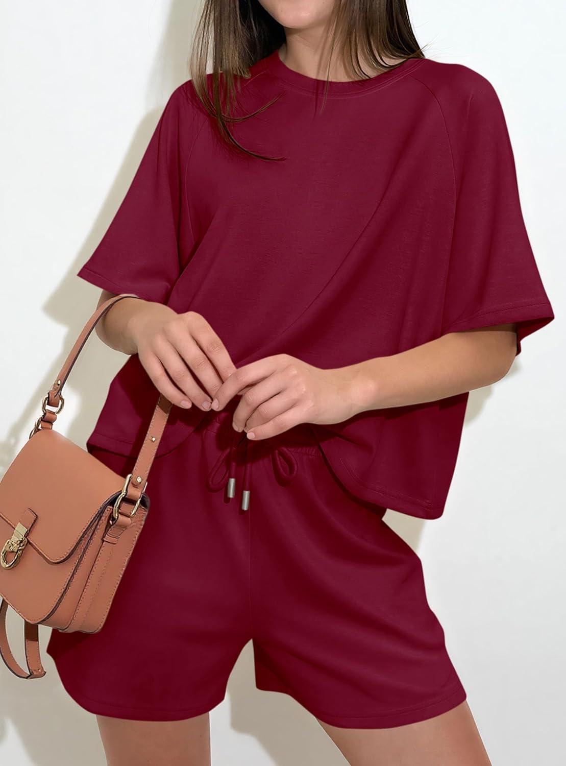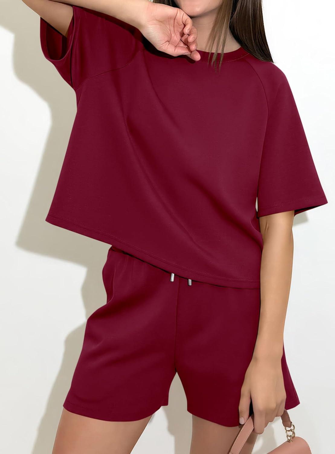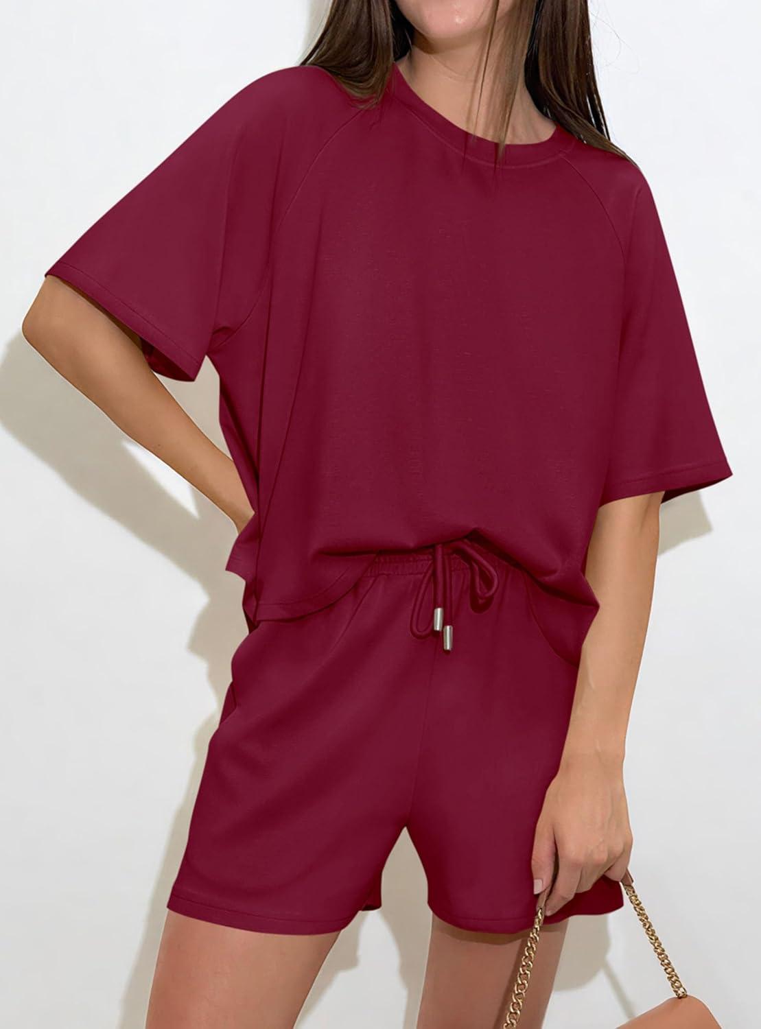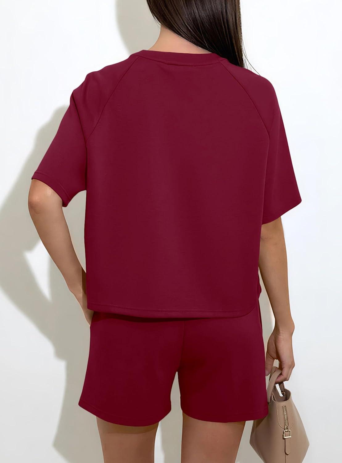 PRETTYGARDEN Women 2 Piece Lounge Sets Short Sleeve Shirts Workout Tops Shorts Matching Clothing 2026 Summer Vacation Outfits(Burgundy)