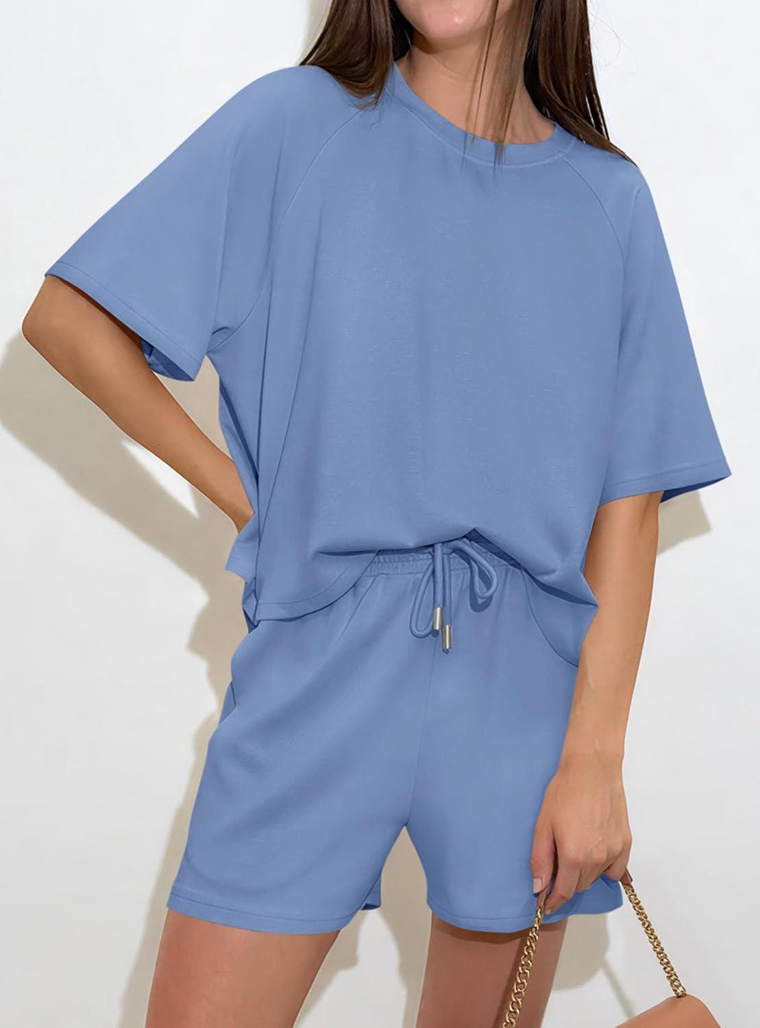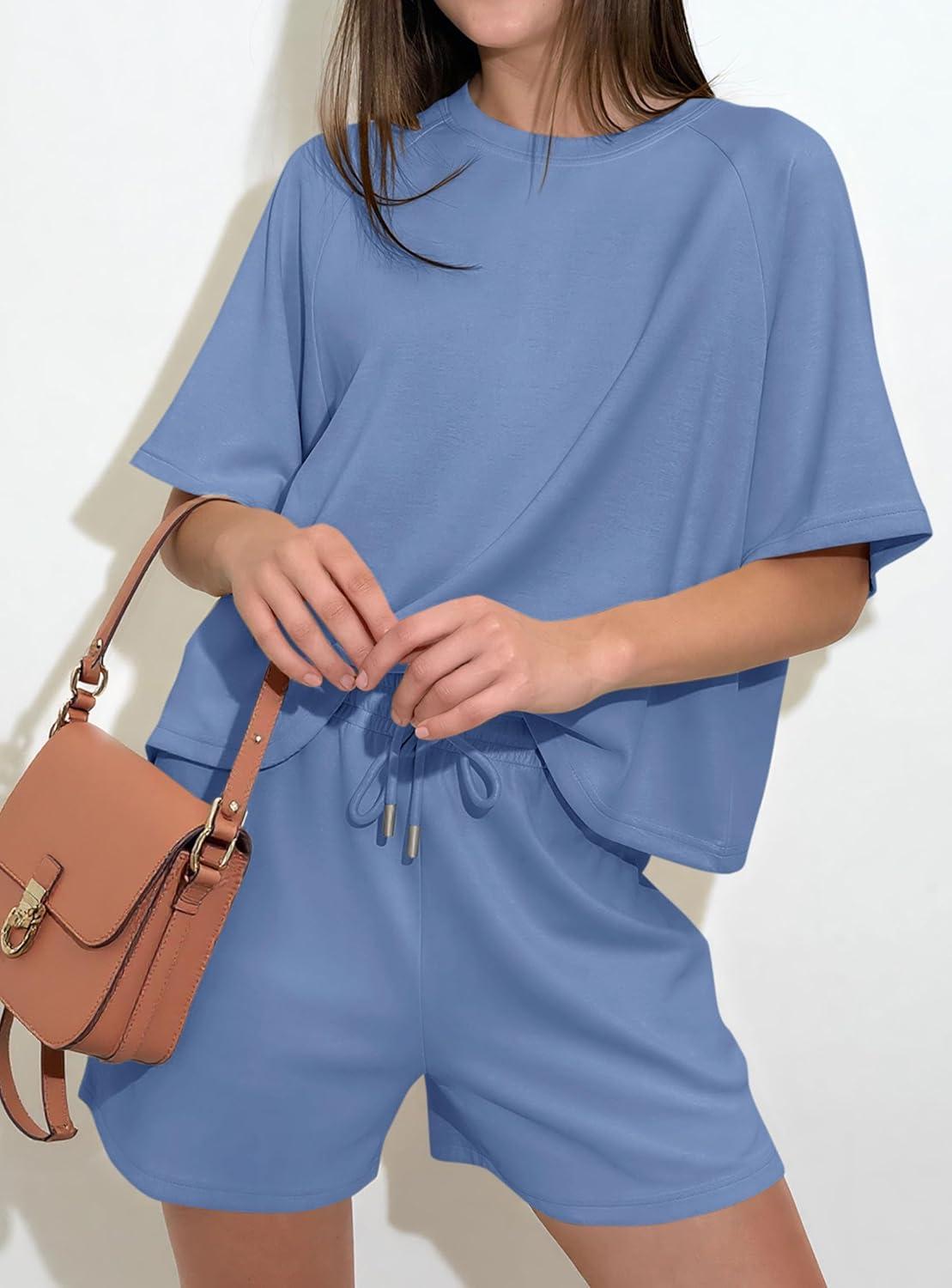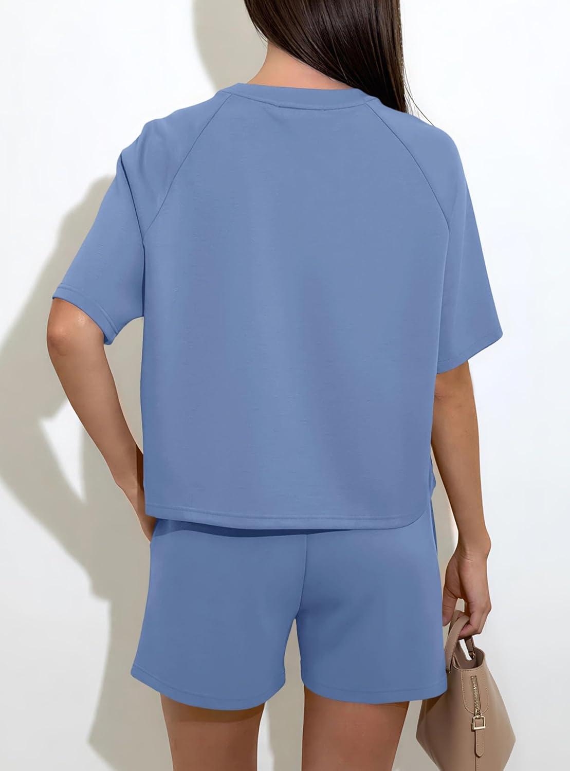 PRETTYGARDEN Women 2 Piece Lounge Sets Short Sleeve Shirts Workout Tops Shorts Matching Clothing 2026 Summer Vacation Outfits(Dusty Blue)