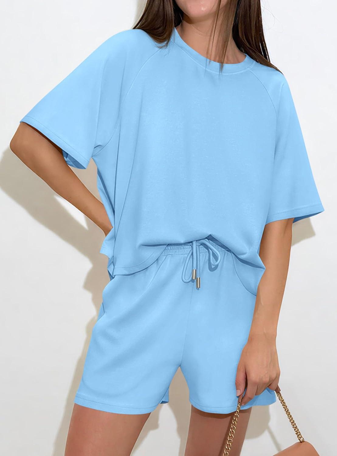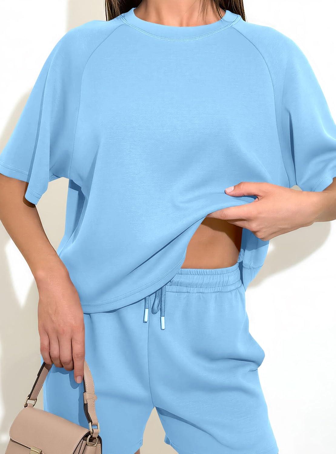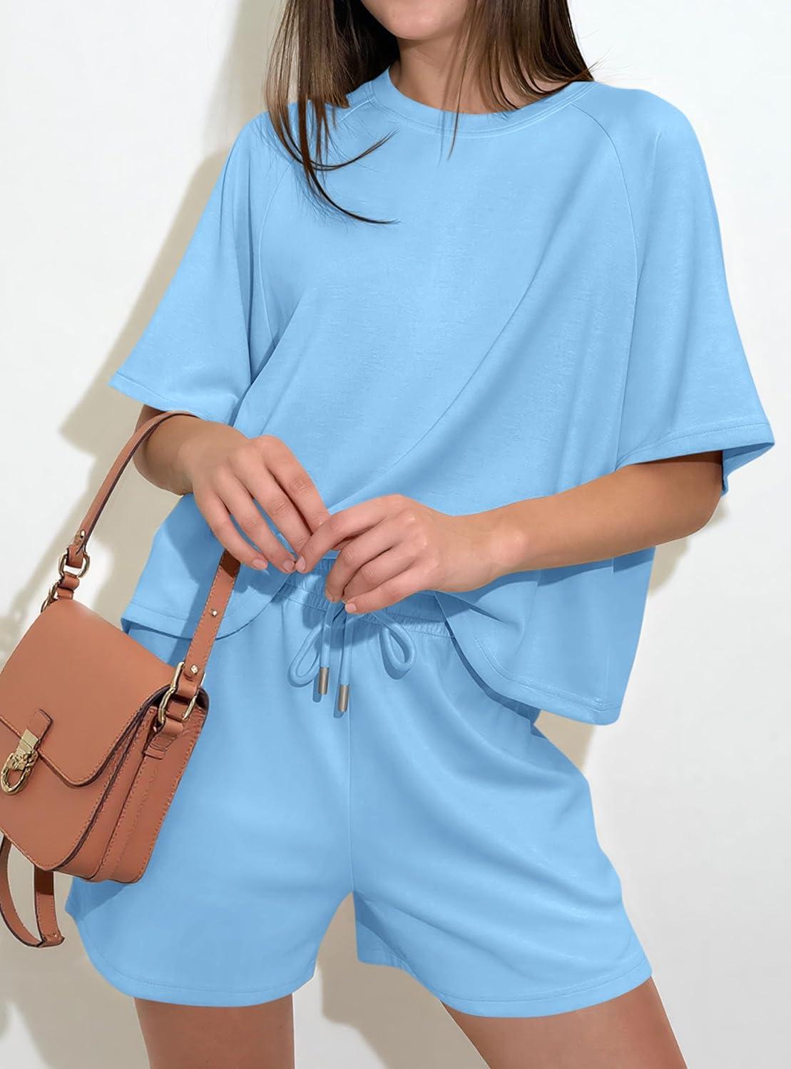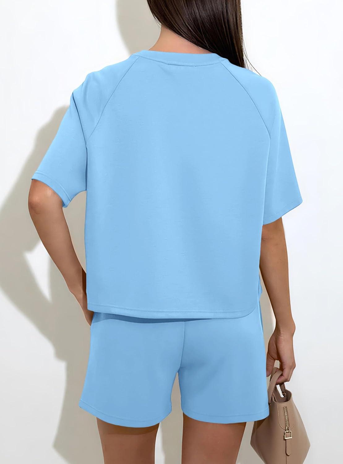 PRETTYGARDEN Women 2 Piece Lounge Sets Short Sleeve Shirts Workout Tops Shorts Matching Clothing 2026 Summer Vacation Outfits(Light Blue)