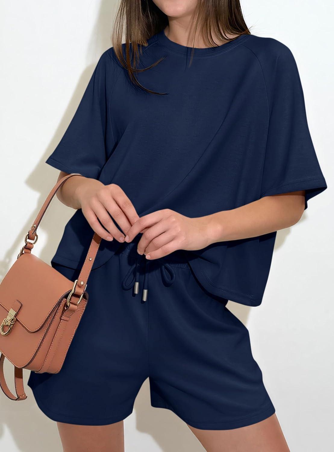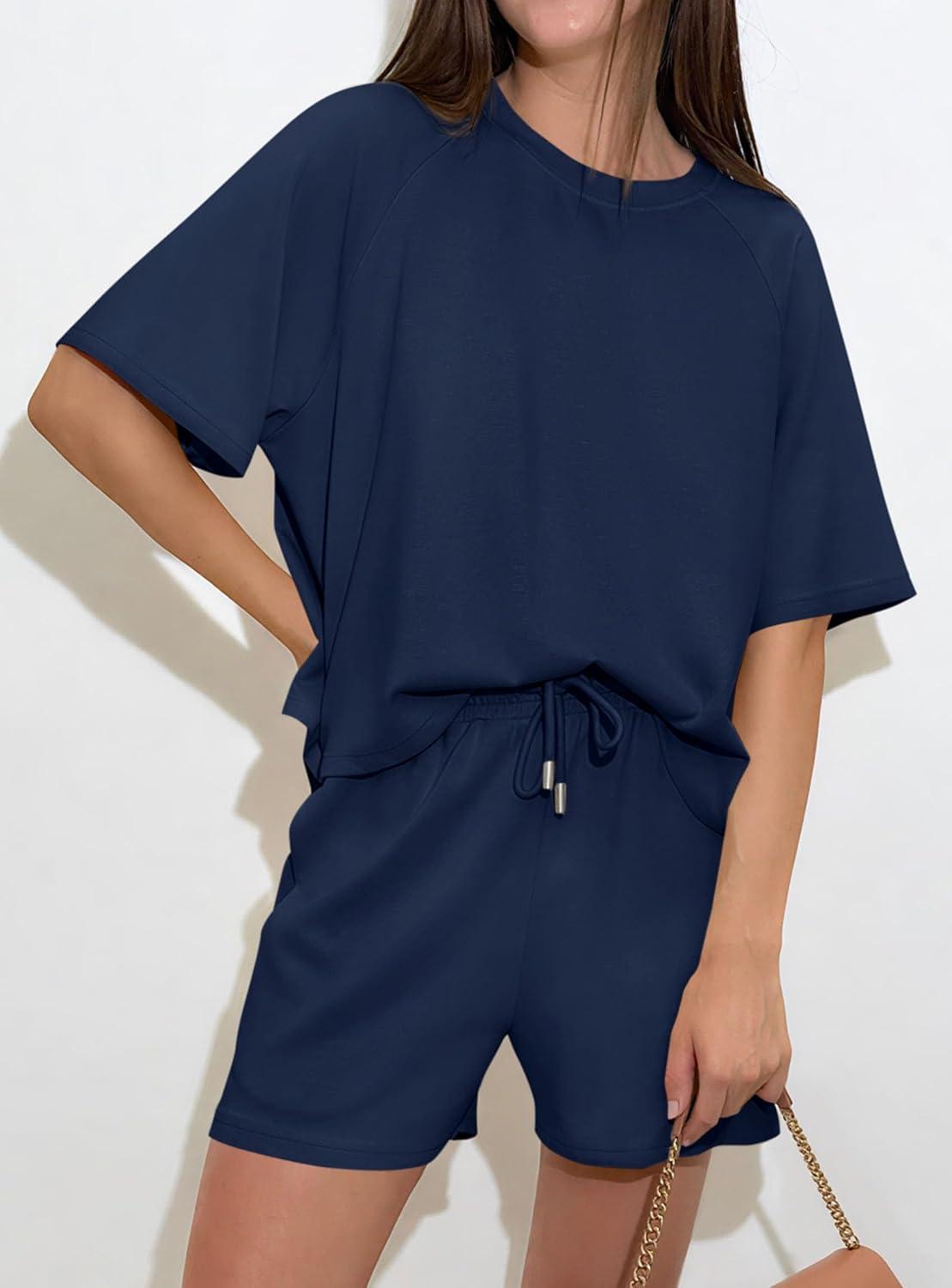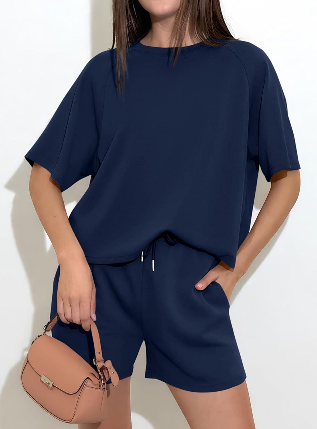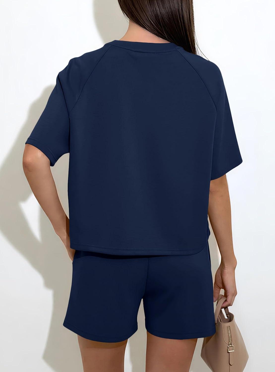 PRETTYGARDEN Women 2 Piece Lounge Sets Short Sleeve Shirts Workout Tops Shorts Matching Clothing 2026 Summer Vacation Outfits(Navy Blue)