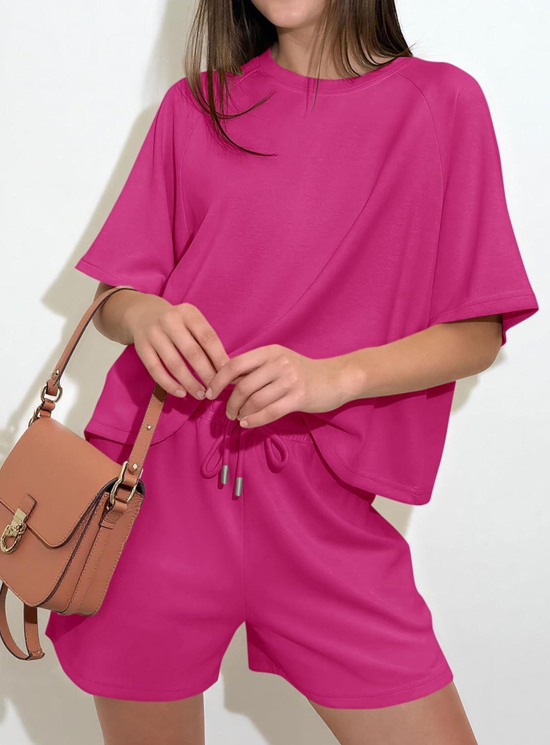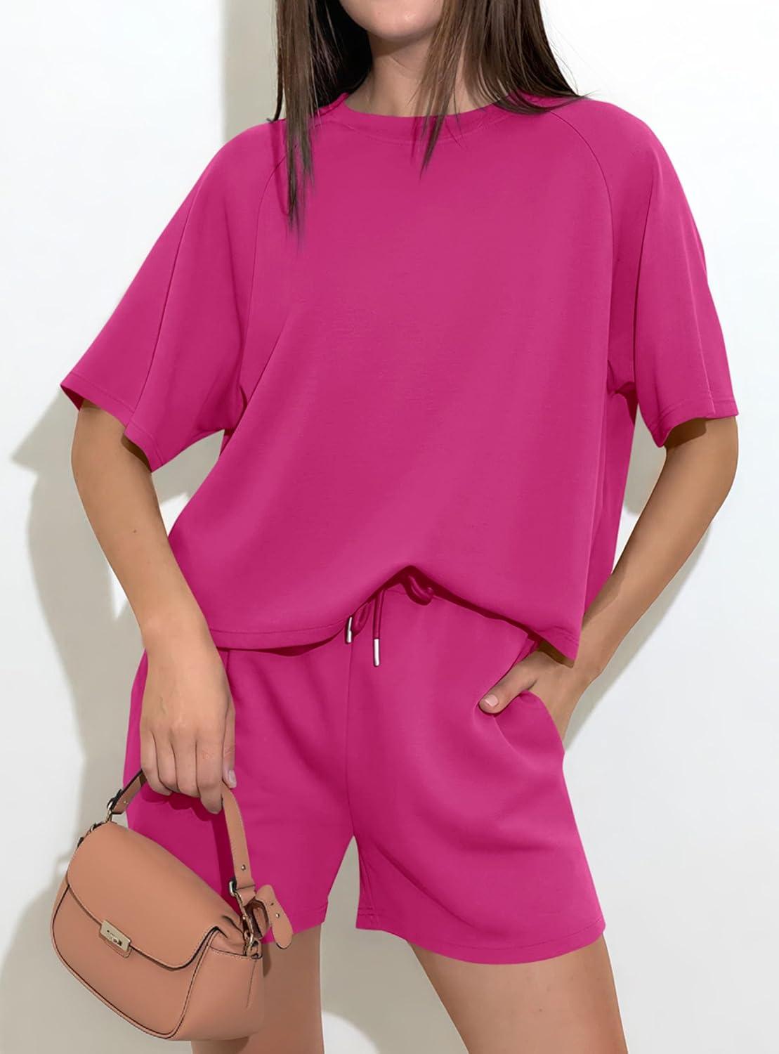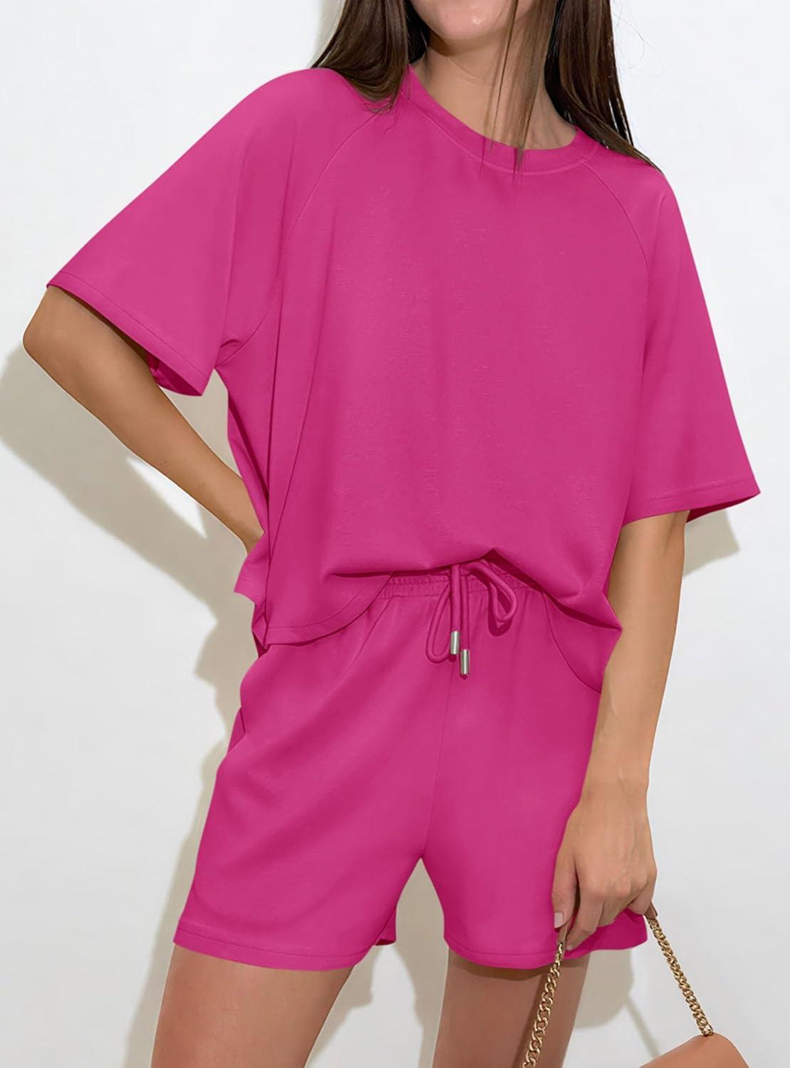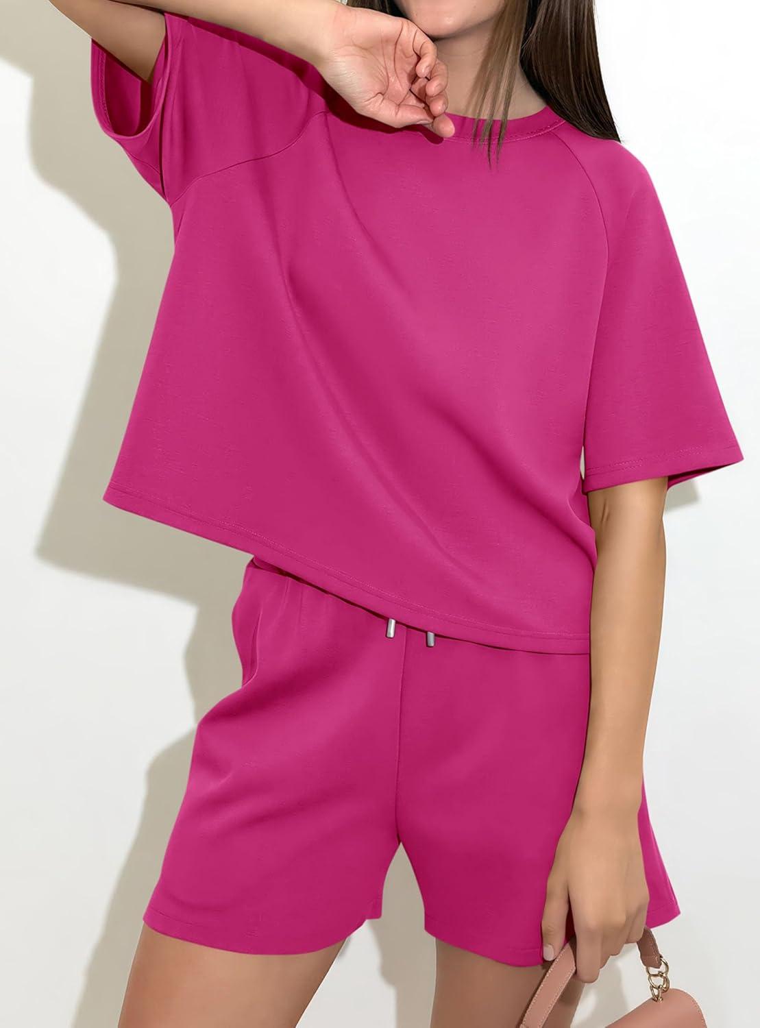 PRETTYGARDEN Women 2 Piece Lounge Sets Short Sleeve Shirts Workout Tops Shorts Matching Clothing 2026 Summer Vacation Outfits(Rose Red)