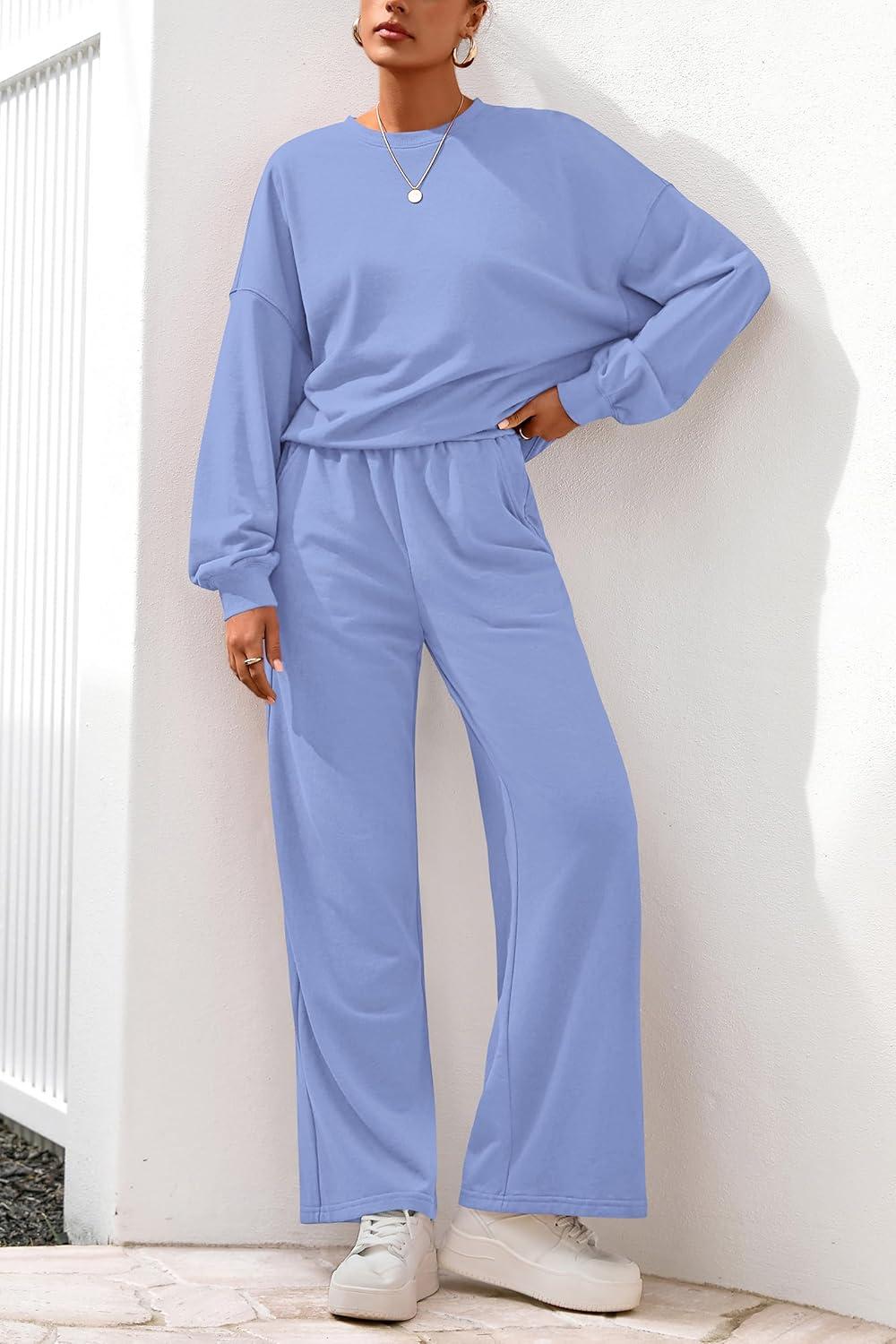 PRETTYGARDEN Women 2 Piece Outfits 2025 Fall Sweatsuits Crewneck Sweatshirt Wide Leg Sweatpants Lounge Sets Tracksuit(Light Blue)