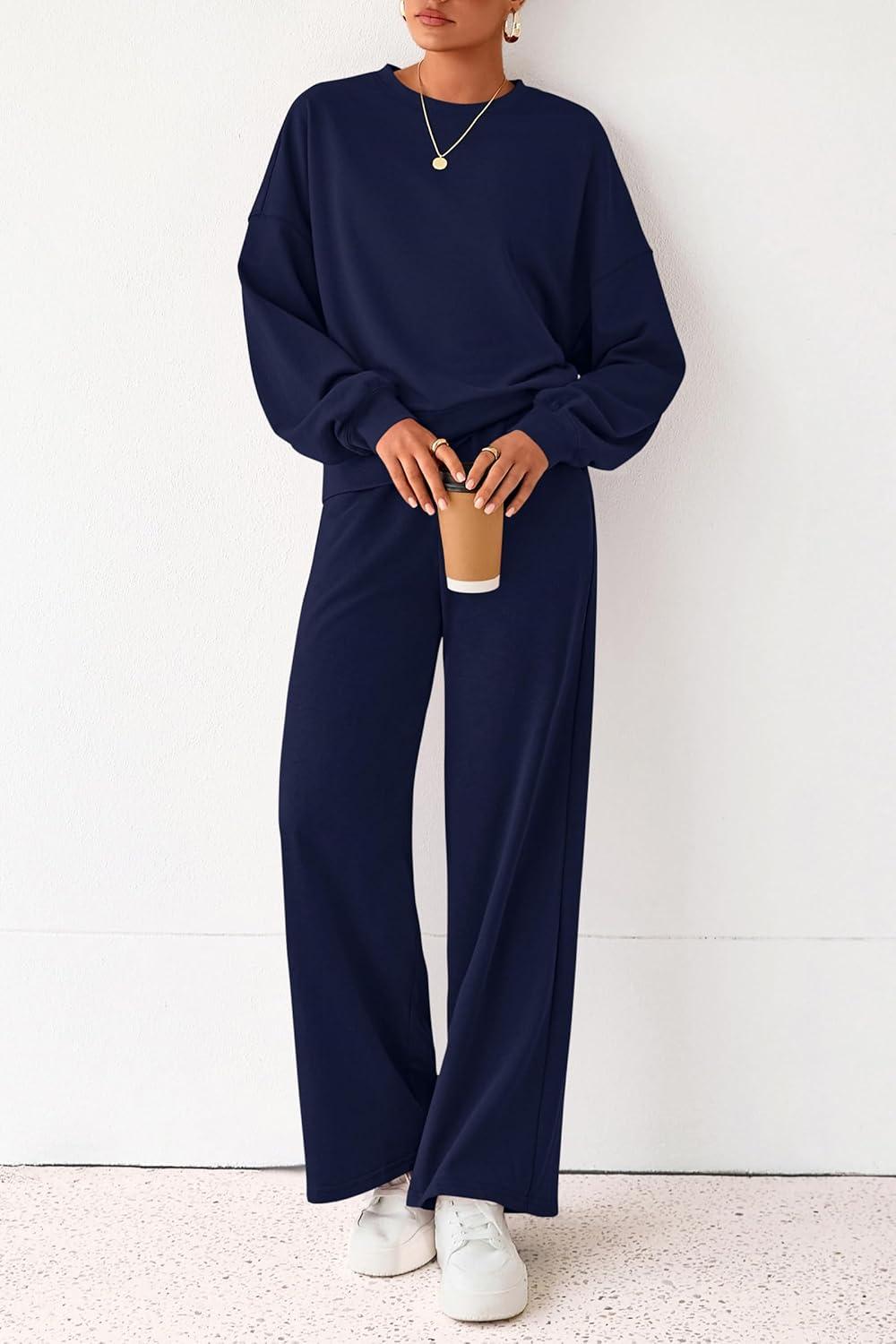 PRETTYGARDEN Women 2 Piece Outfits 2025 Fall Sweatsuits Crewneck Sweatshirt Wide Leg Sweatpants Lounge Sets Tracksuit(Navy Blue)
