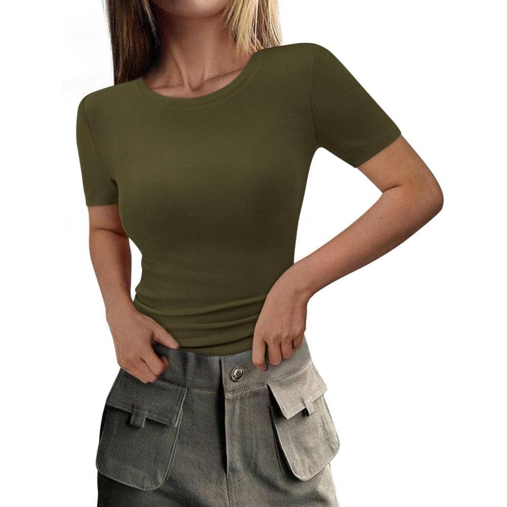 PRETTYGARDEN Women 2025 Summer Crew Neck Short Sleeve Tops Ribbed Knit Slim Fit Fashion Basic Tee Shirts Casual Going Out Top(Army Green)