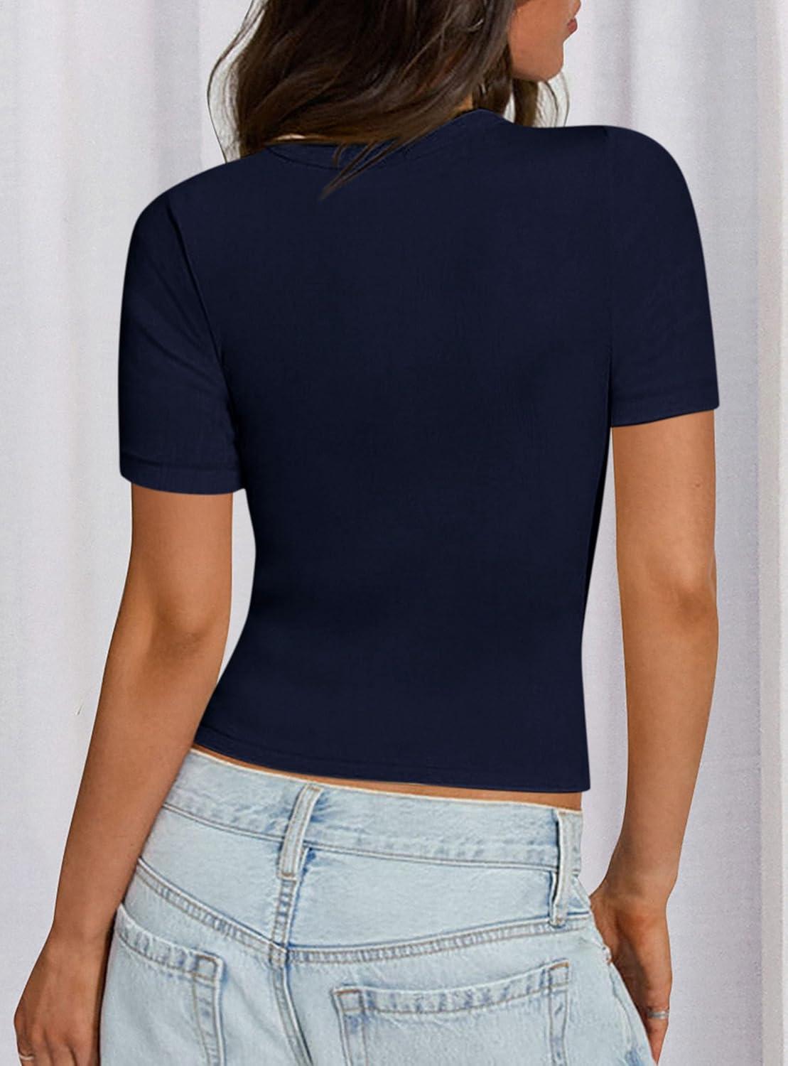 PRETTYGARDEN Women 2025 Summer Crew Neck Short Sleeve Tops Ribbed Knit Slim Fit Fashion Basic Tee Shirts Casual Going Out Top(Dark Blue)