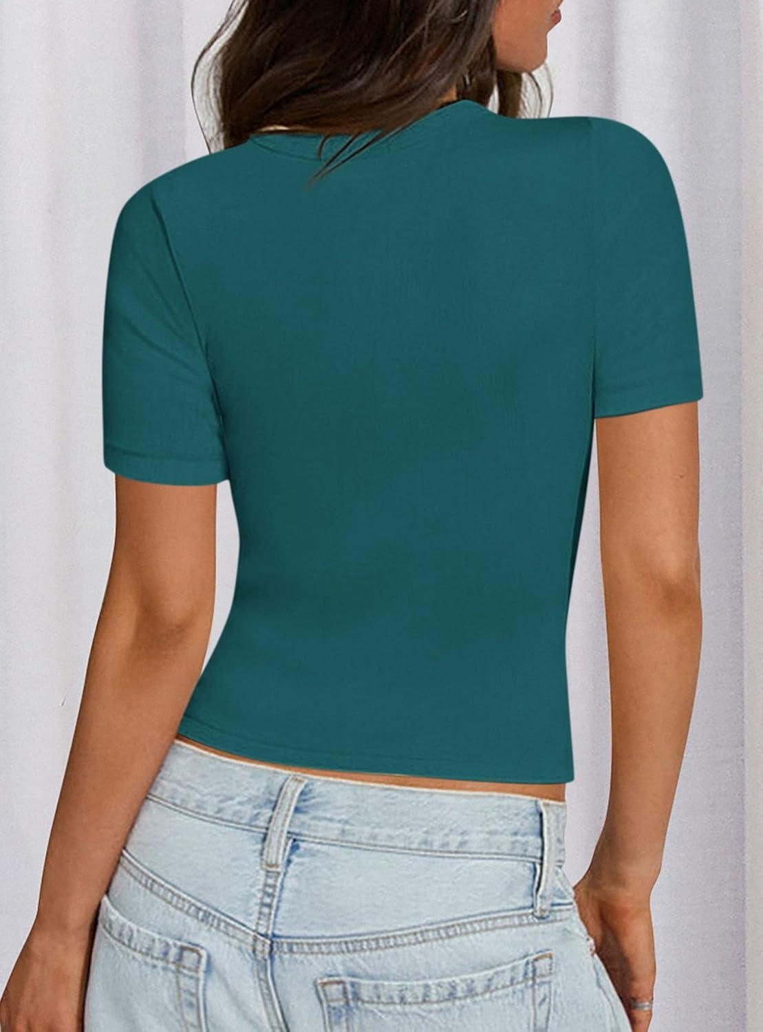 PRETTYGARDEN Women 2025 Summer Crew Neck Short Sleeve Tops Ribbed Knit Slim Fit Fashion Basic Tee Shirts Casual Going Out Top(Lake Blue)