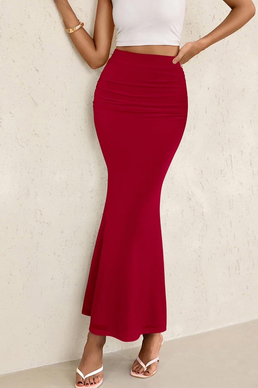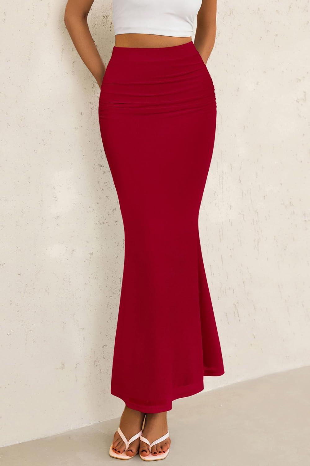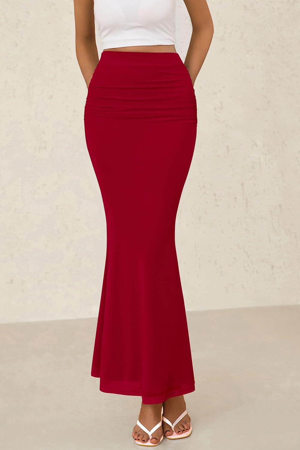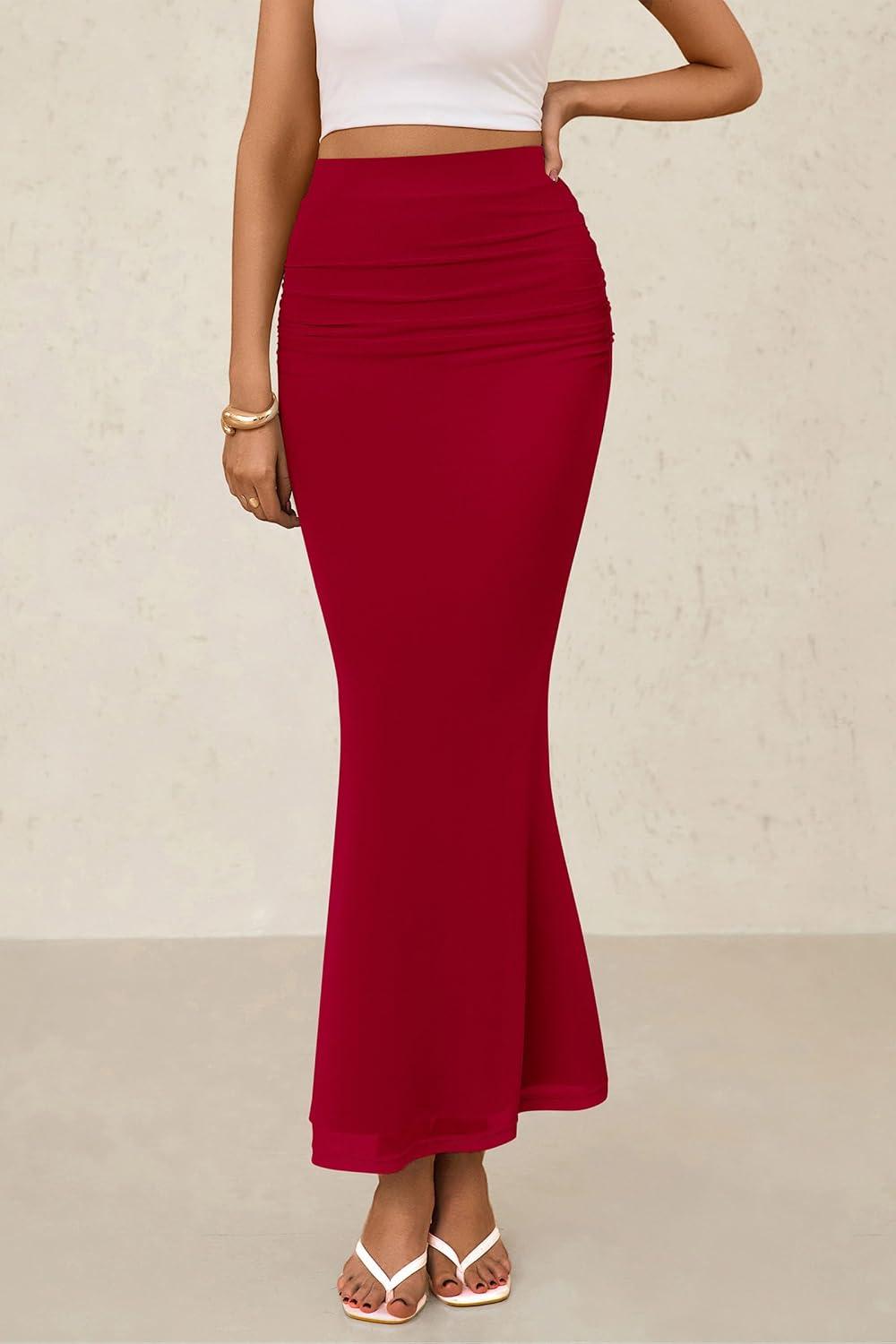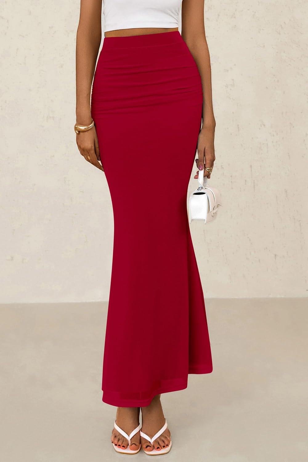 PRETTYGARDEN Women Bodycon Mermaid Skirt 2025 Spring Summer Casual Fitted Mesh High Waisted Ruched Maxi Long Going Out Outfit(Red)