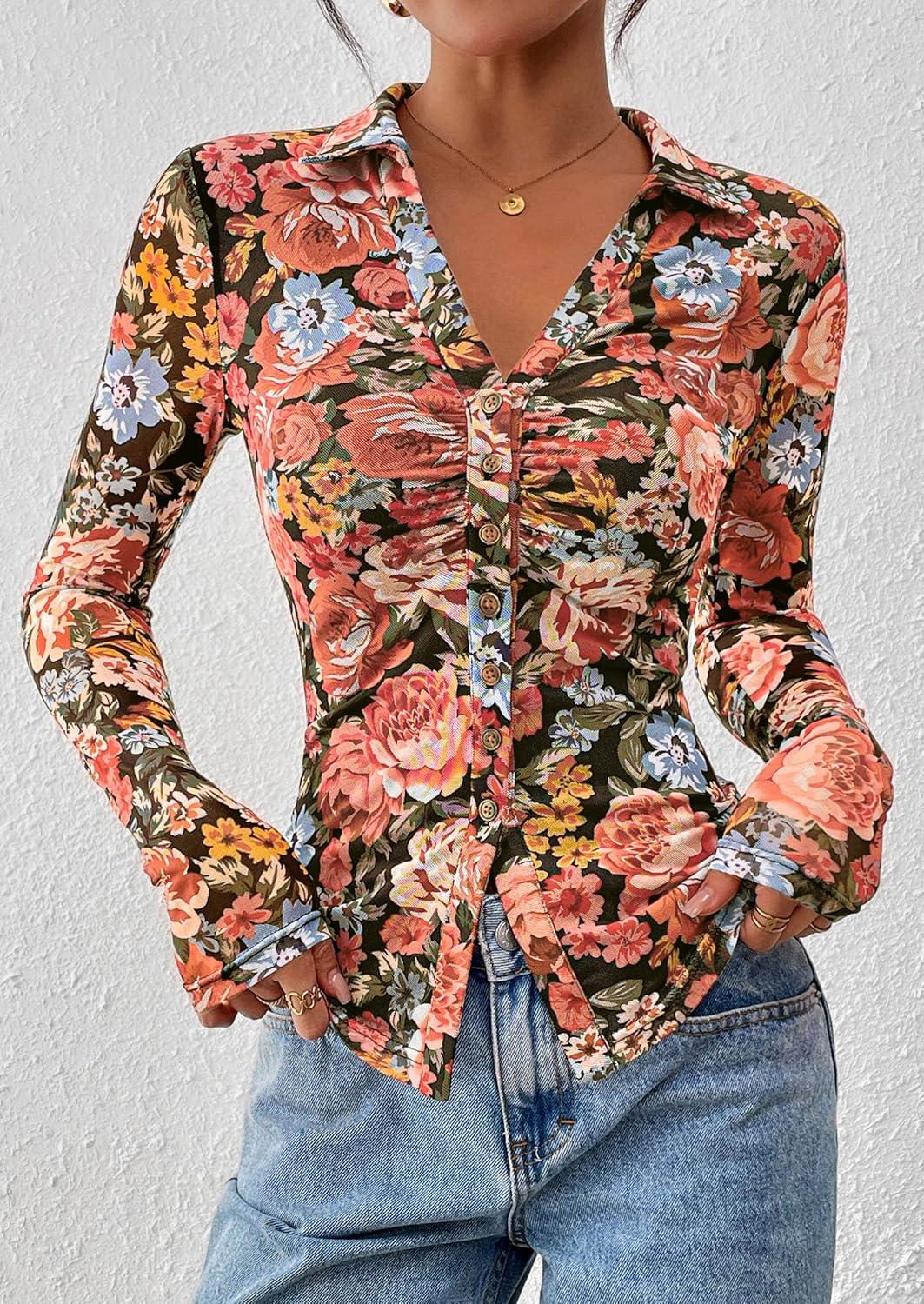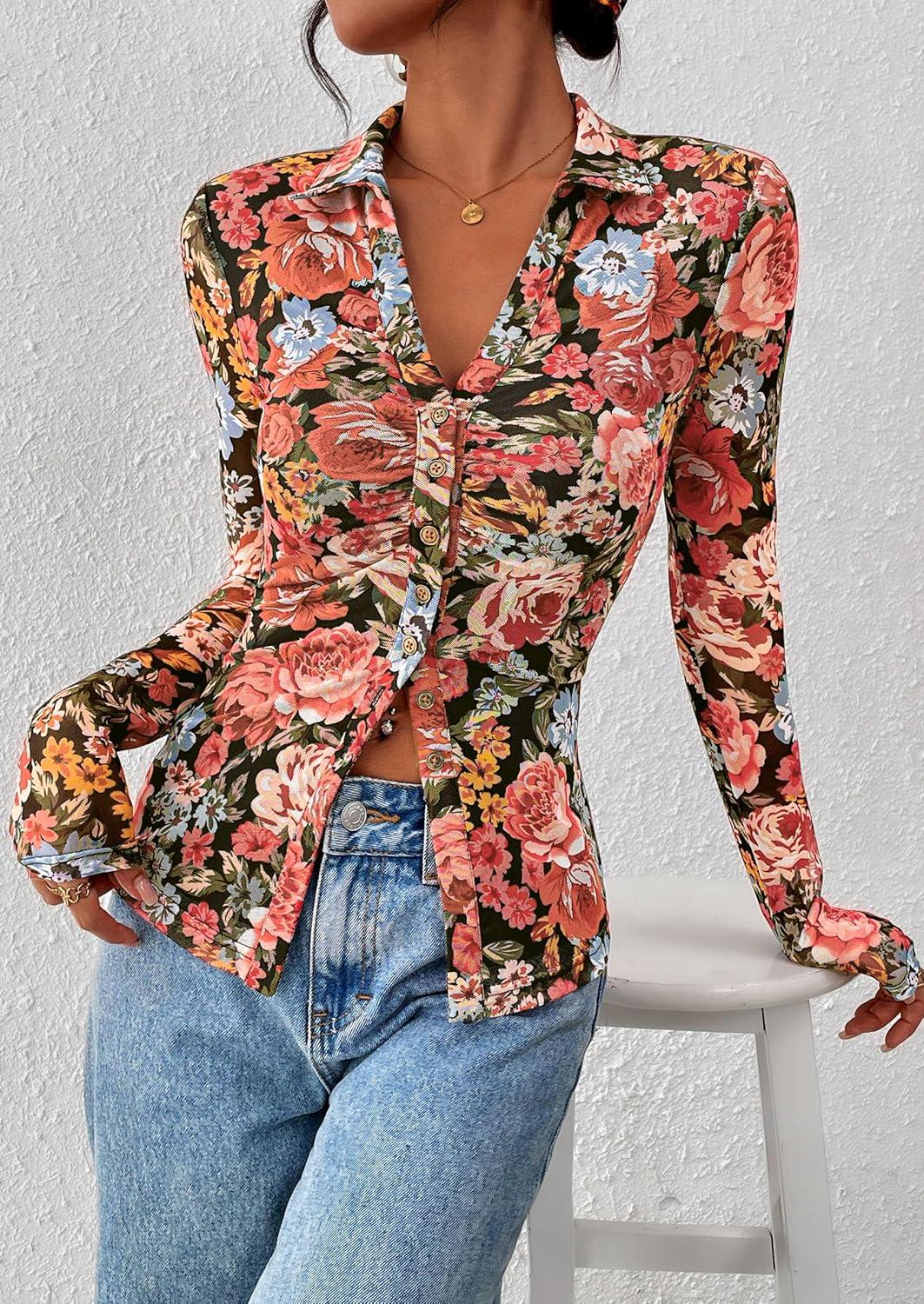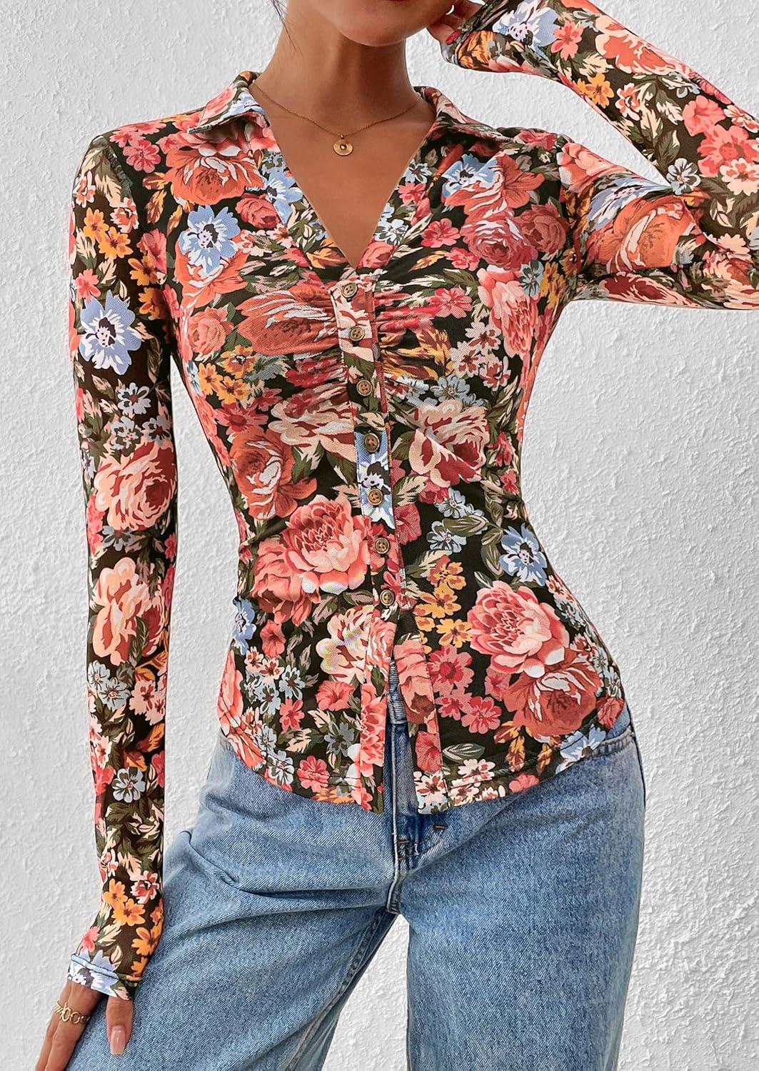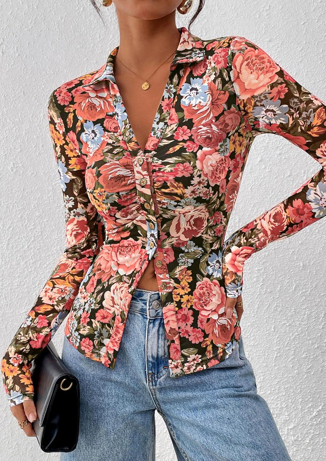 PRETTYGARDEN Women Button Down Floral Shirts 2025 Fall Trendy Long Sleeve V Neck Ruched Fitted Mesh Blouse Tops Date Outfits(Black Floral)