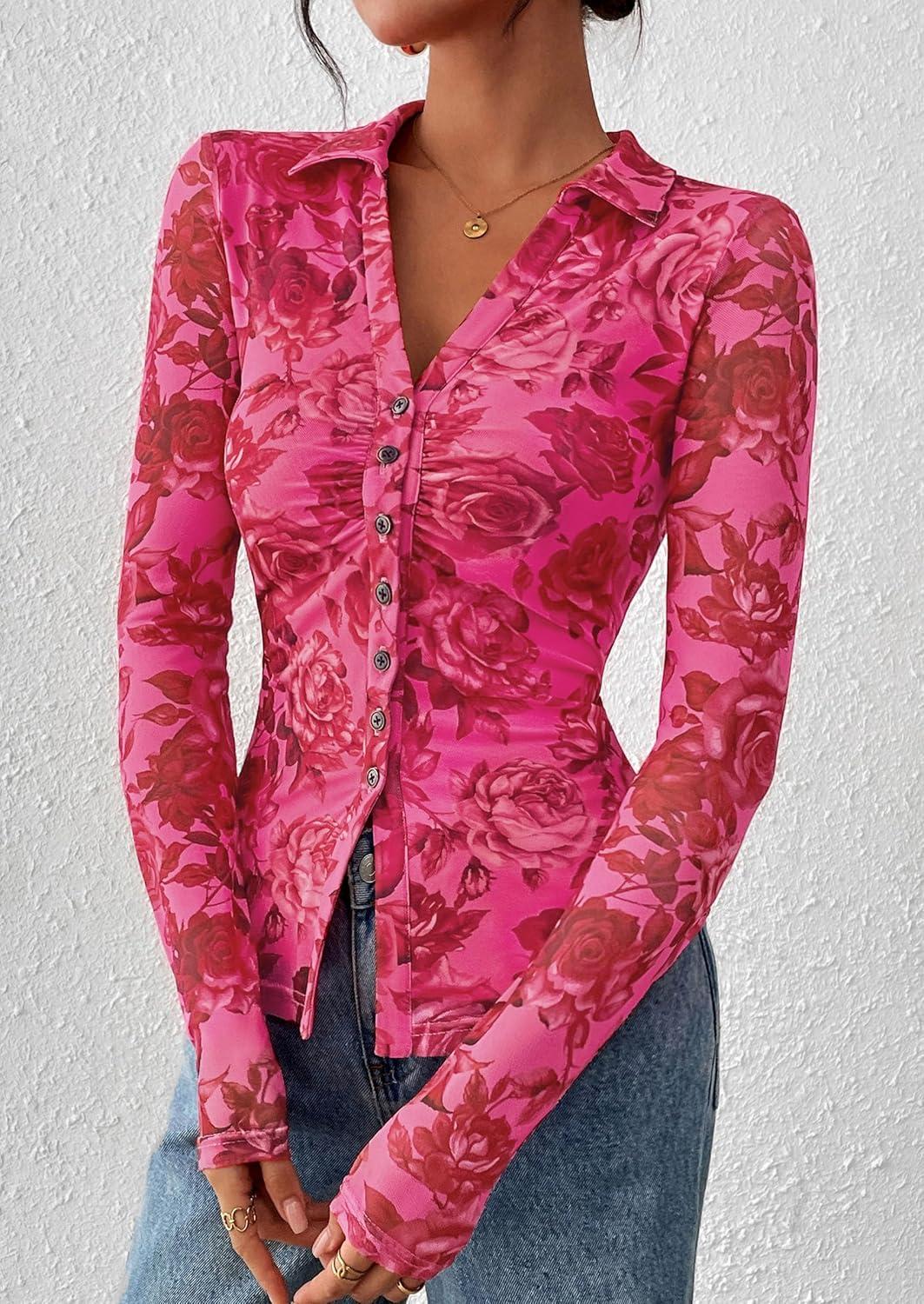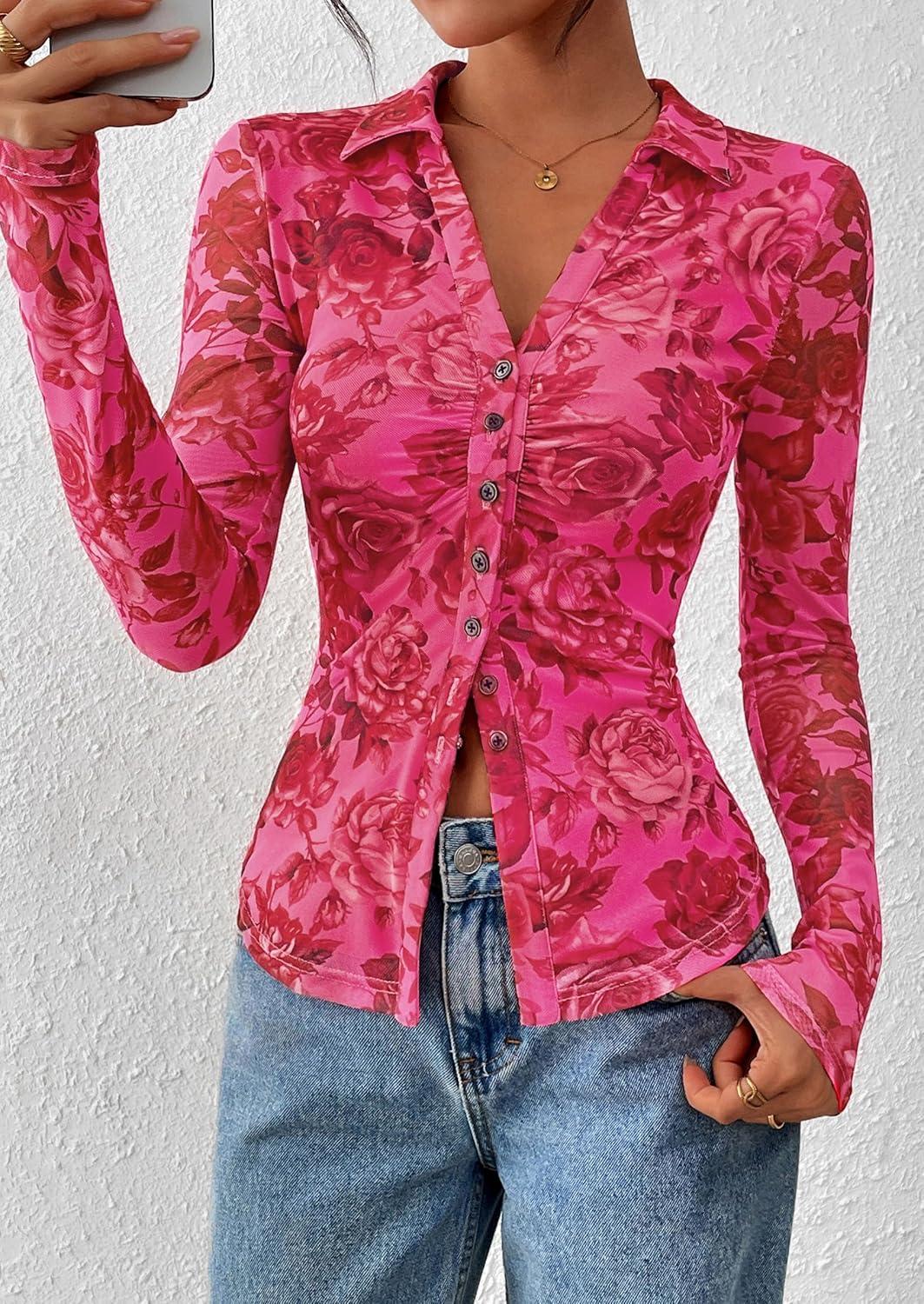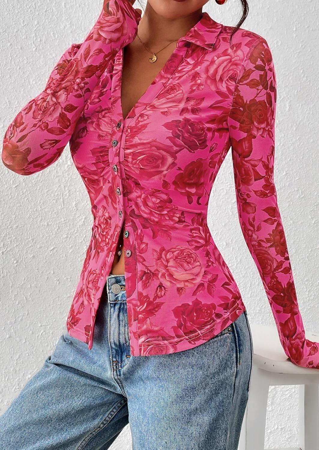 PRETTYGARDEN Women Button Down Floral Shirts 2025 Fall Trendy Long Sleeve V Neck Ruched Fitted Mesh Blouse Tops Date Outfits(Pink Red Floral)