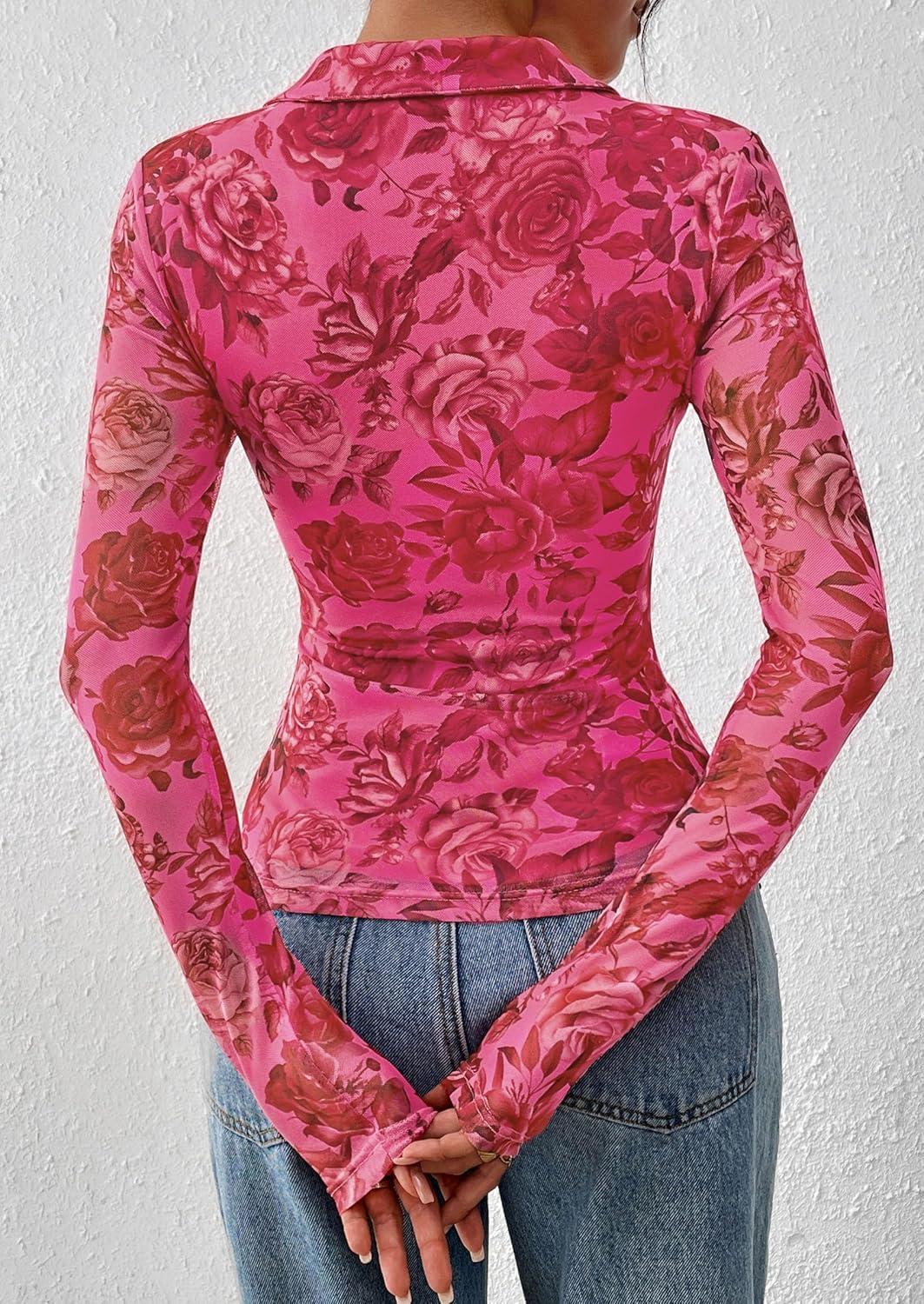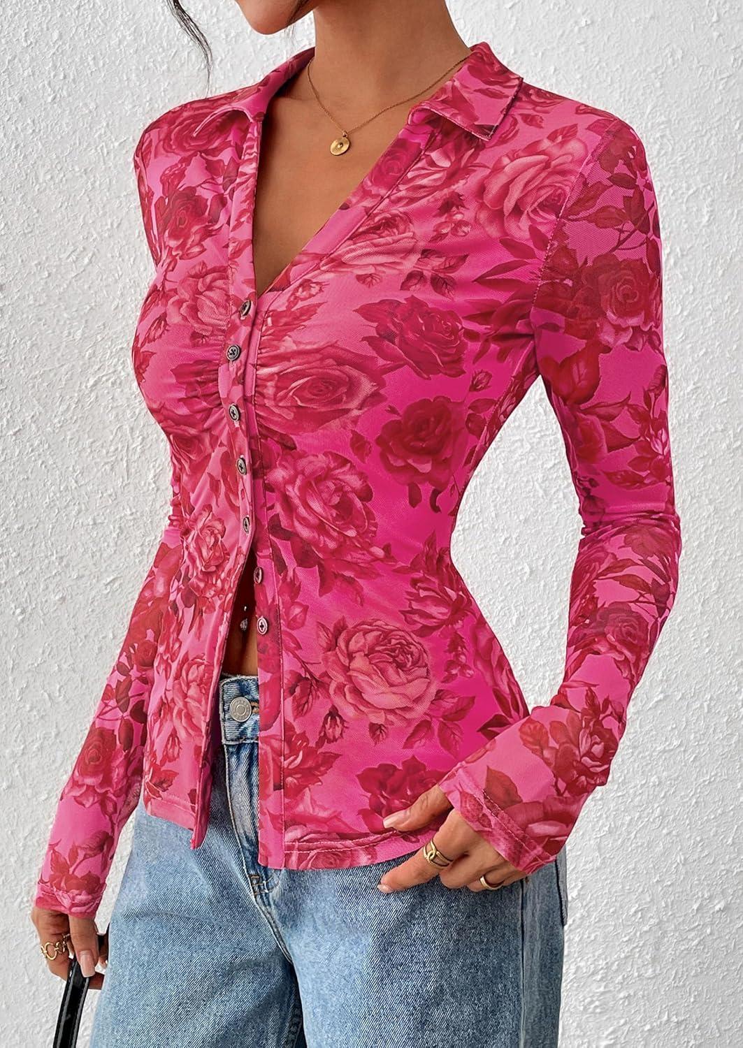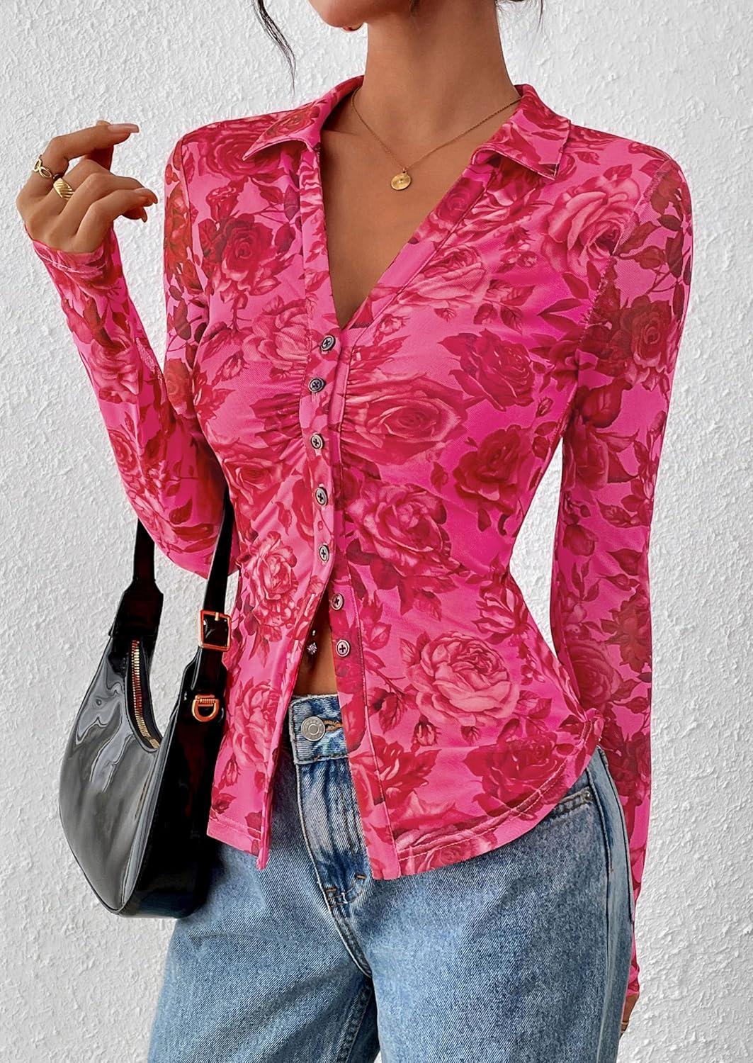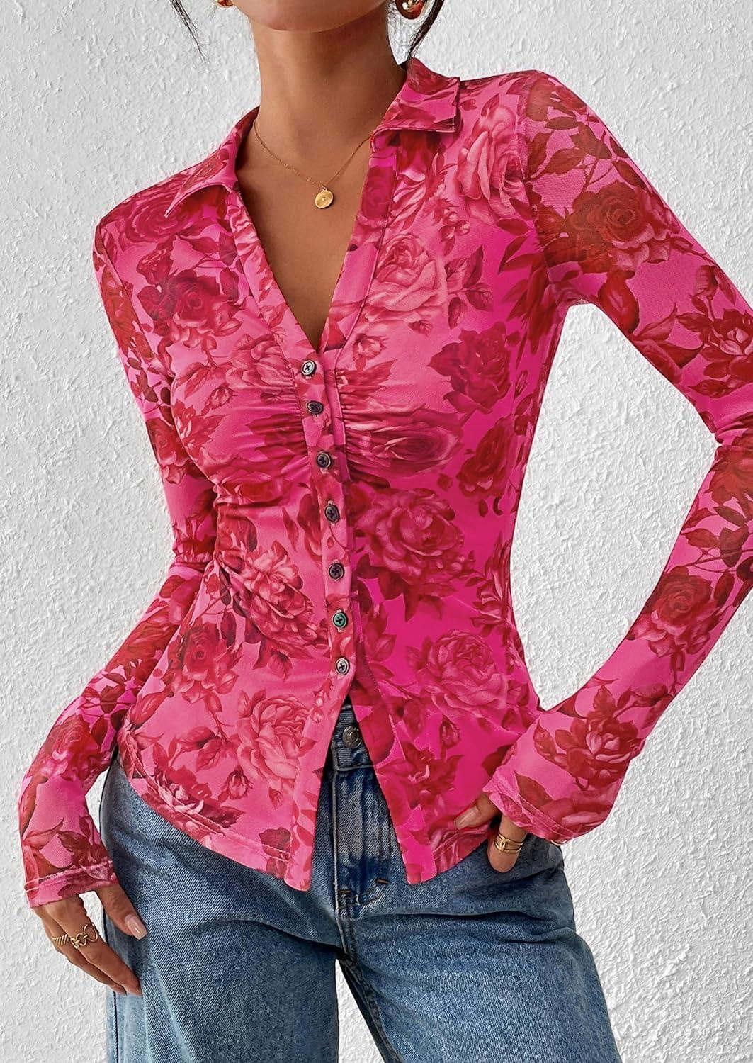 PRETTYGARDEN Women Button Down Floral Shirts 2025 Fall Trendy Long Sleeve V Neck Ruched Fitted Mesh Blouse Tops Date Outfits(Red Pink)