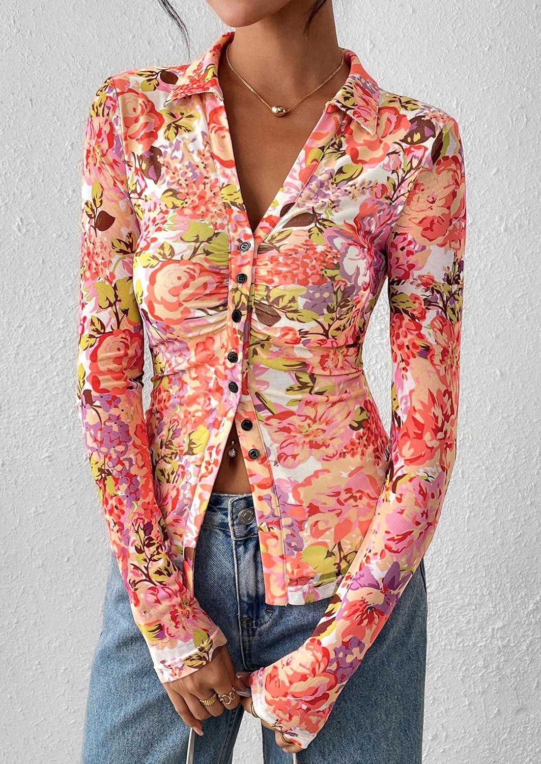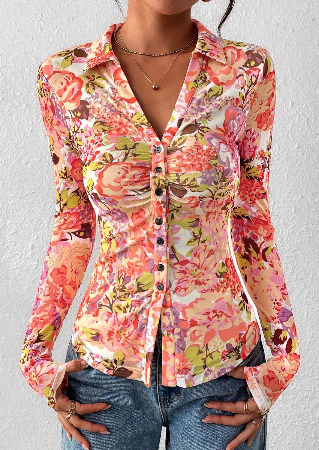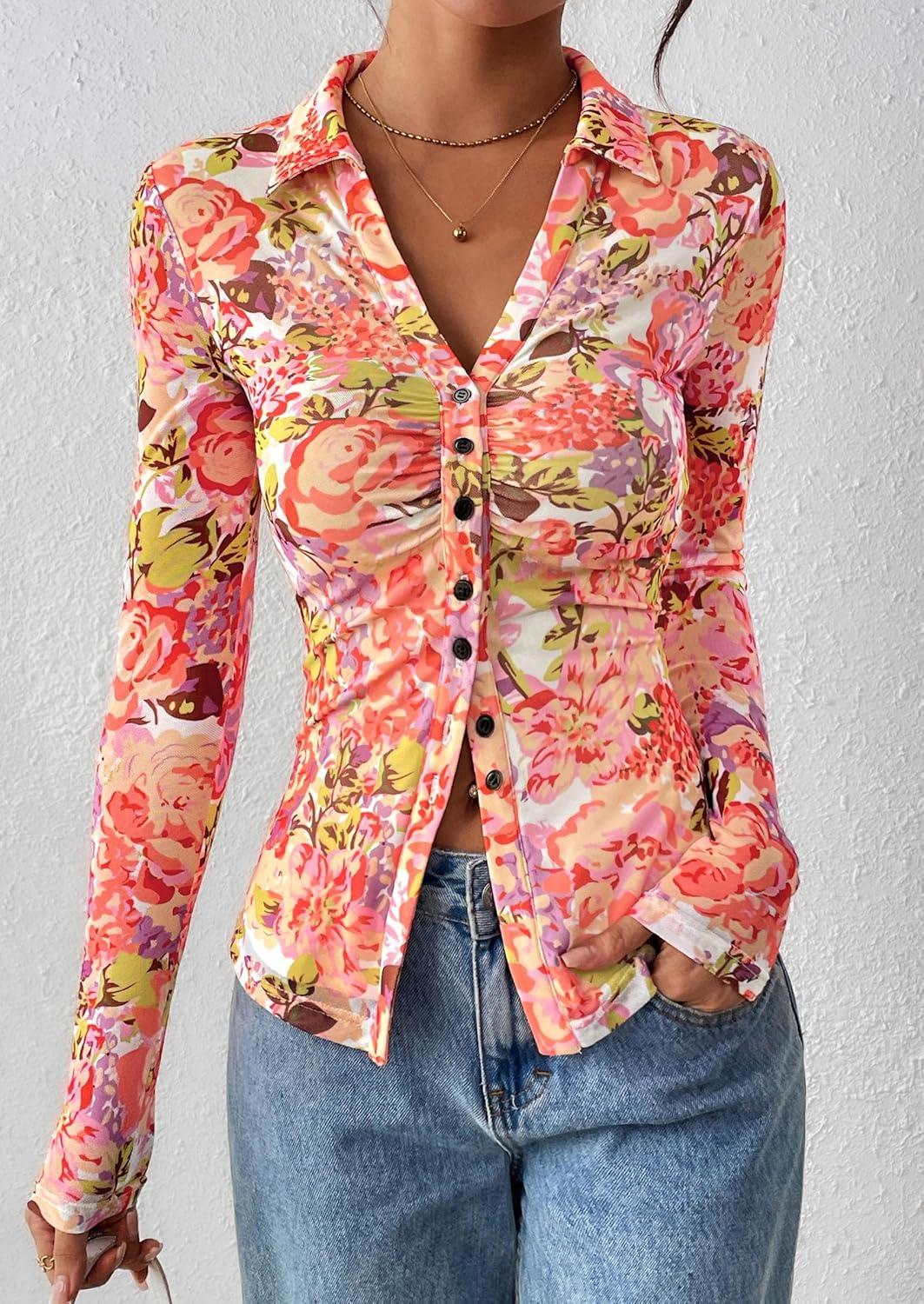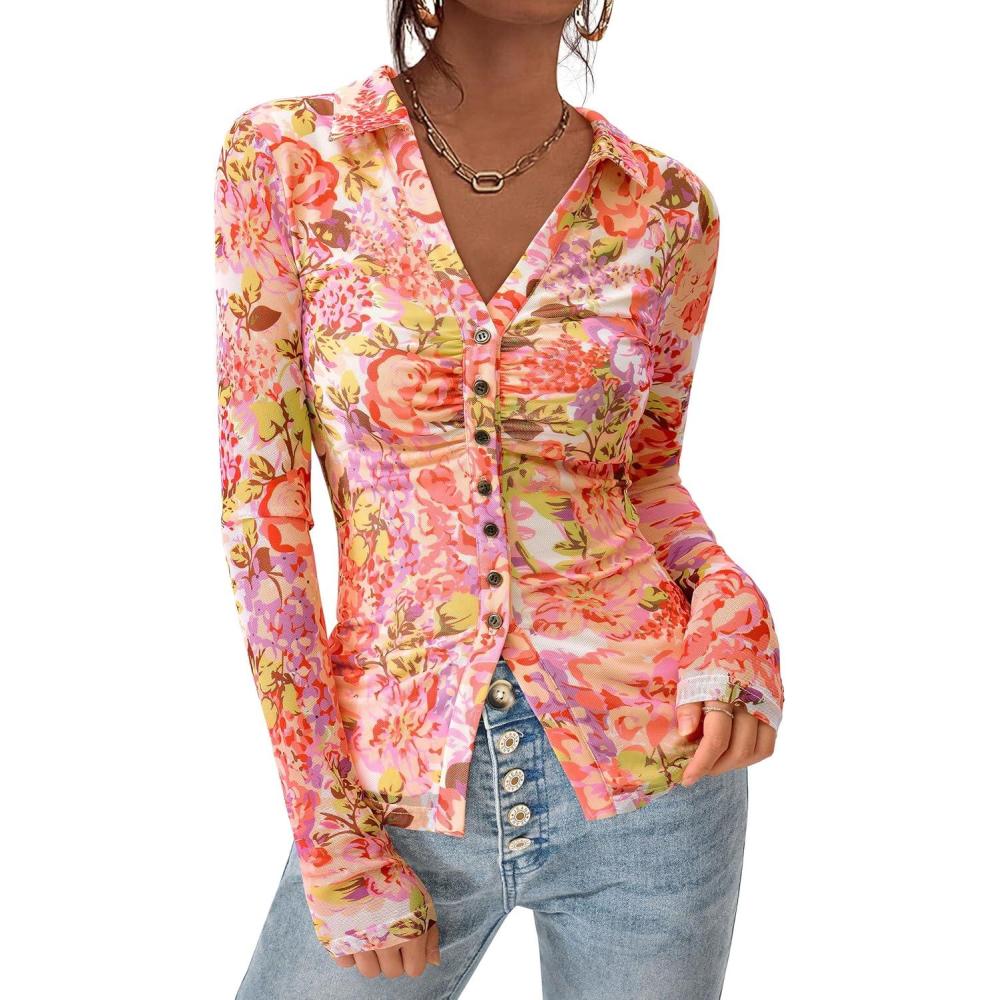 PRETTYGARDEN Women Button Down Floral Shirts 2025 Fall Trendy Long Sleeve V Neck Ruched Fitted Mesh Blouse Tops Date Outfits(Pink Red Floral)
