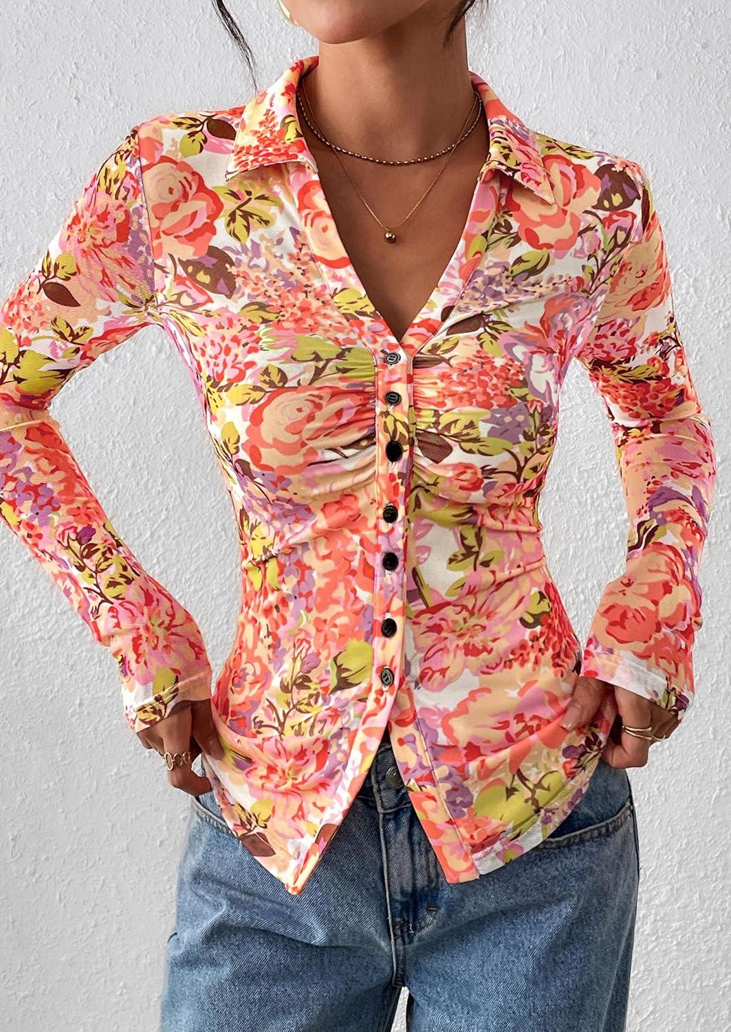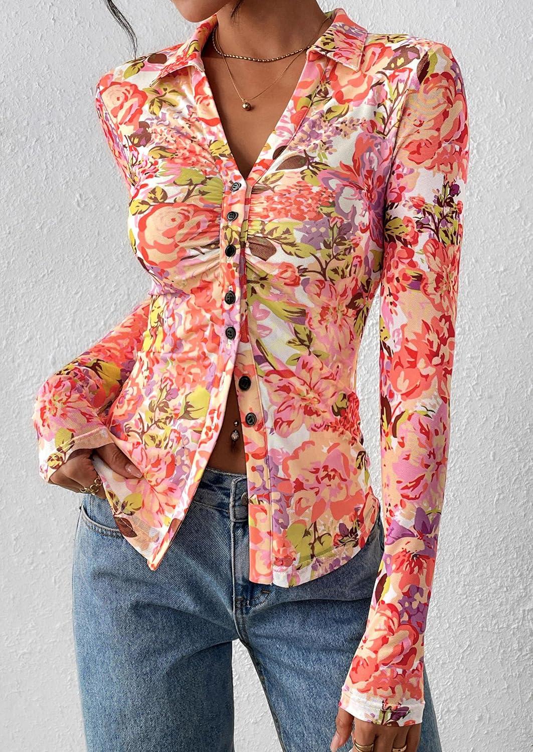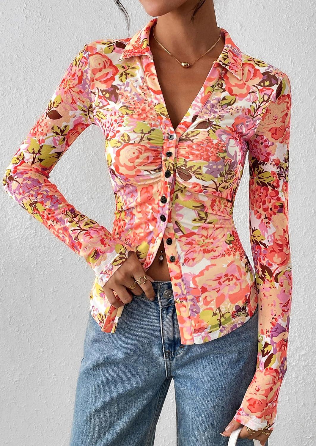 PRETTYGARDEN Women Button Down Floral Shirts 2025 Fall Trendy Long Sleeve V Neck Ruched Fitted Mesh Blouse Tops Date Outfits(Pink Red Floral)
