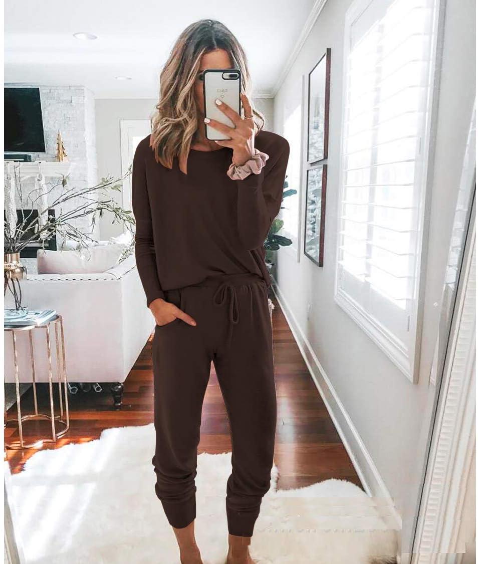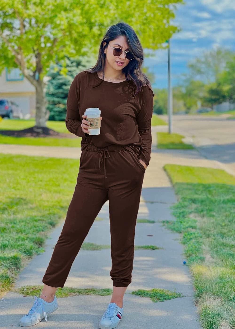 PRETTYGARDEN Women Fall 2 Piece Lounge Outfit Long Sleeve Tops High Waisted Jogger Pants Set Spring Travel Clothes Tracksuit(Brown)