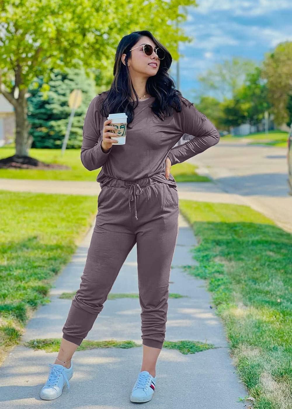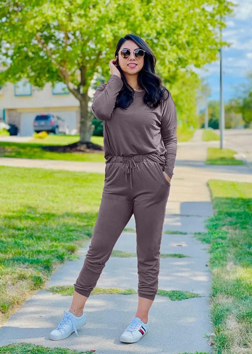 imagePRETTYGARDEN Women Fall 2 Piece Lounge Outfit Long Sleeve Tops High Waisted Jogger Pants Set Spring Travel Clothes TracksuitLight Brown