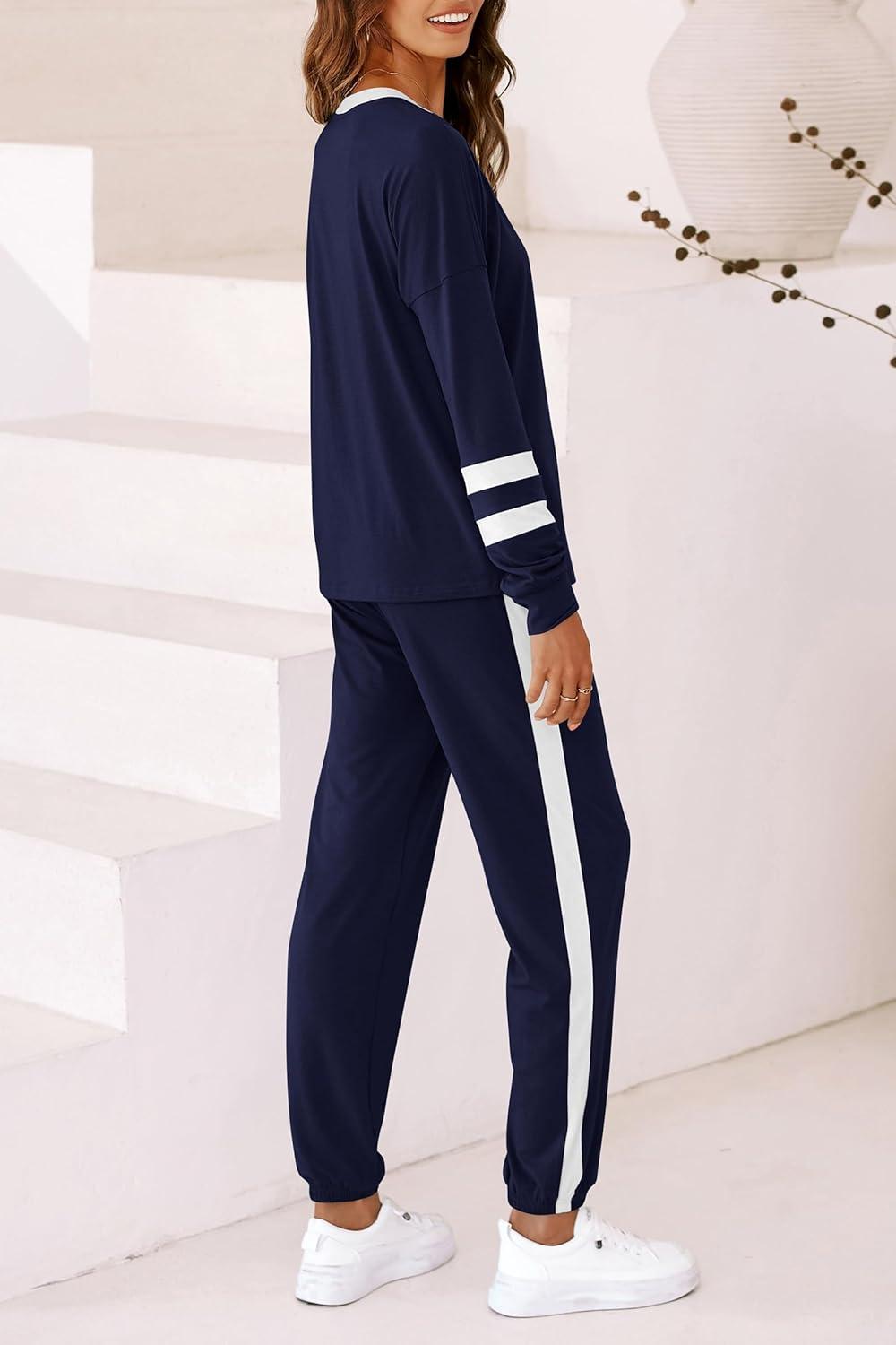 PRETTYGARDEN Women Fall 2 Piece Lounge Outfit Long Sleeve Tops High Waisted Jogger Pants Set Spring Travel Clothes Tracksuit(Striped Navy)
