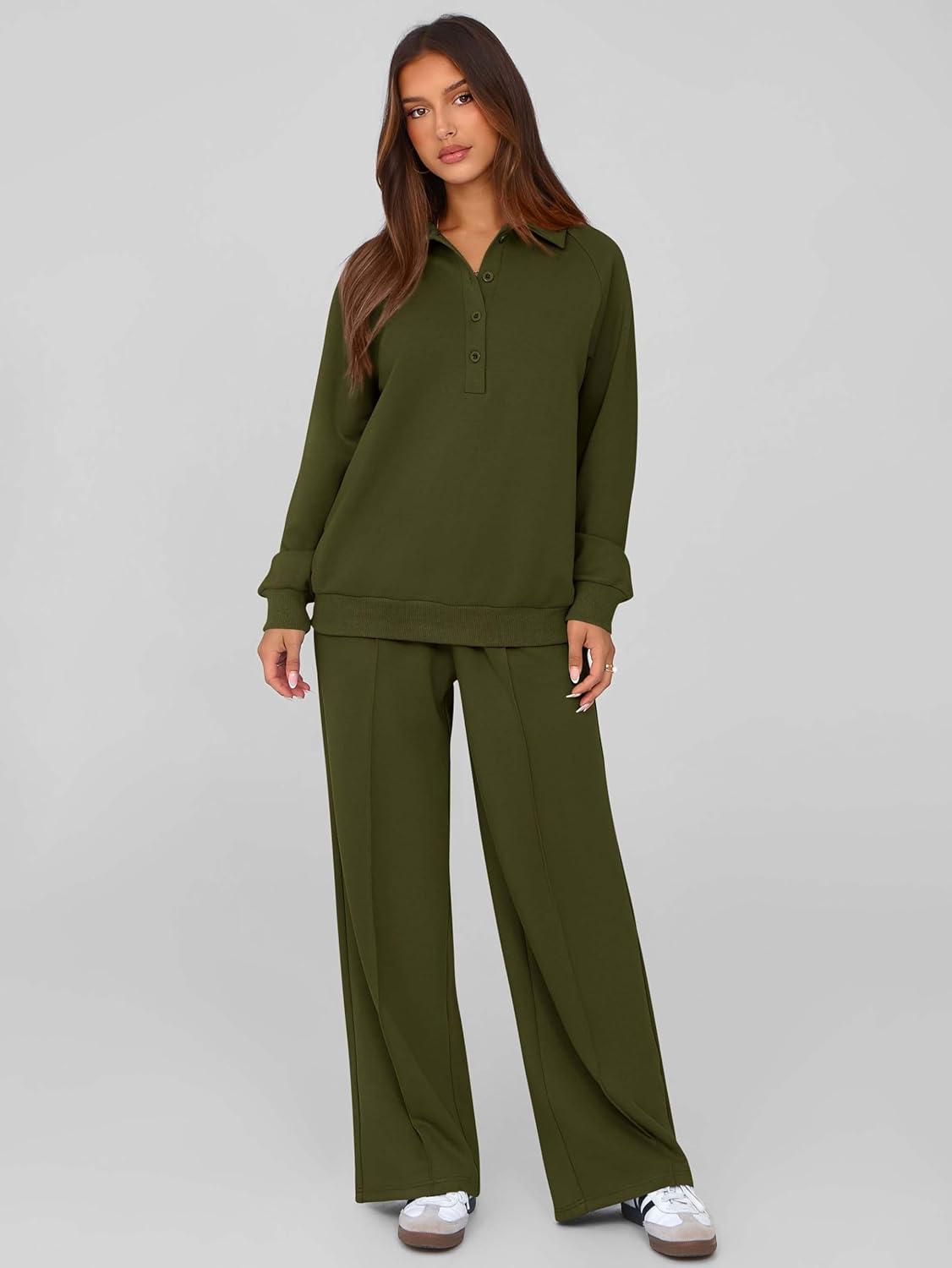 PRETTYGARDEN Women Fall 2 Piece Outfits Sweatsuits Quarter Button Long Sleeve Sweatshirt Wide Leg Pants Tracksuit Lounge Sets(Army Green)