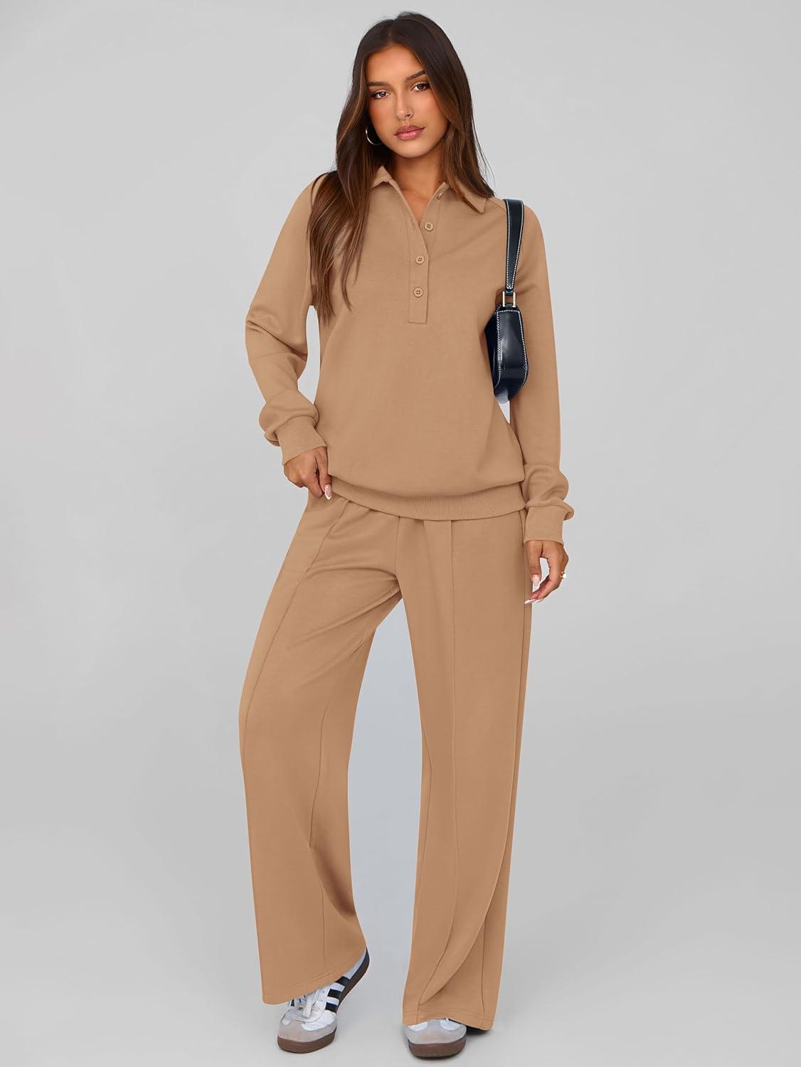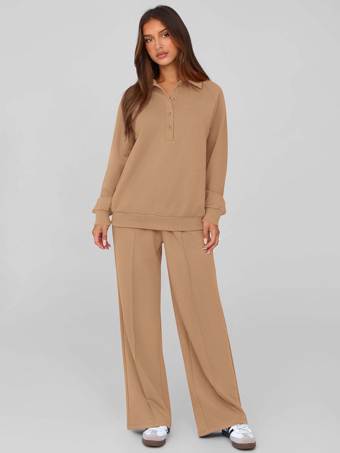 PRETTYGARDEN Women Fall 2 Piece Outfits Sweatsuits Quarter Button Long Sleeve Sweatshirt Wide Leg Pants Tracksuit Lounge Sets(Camel)