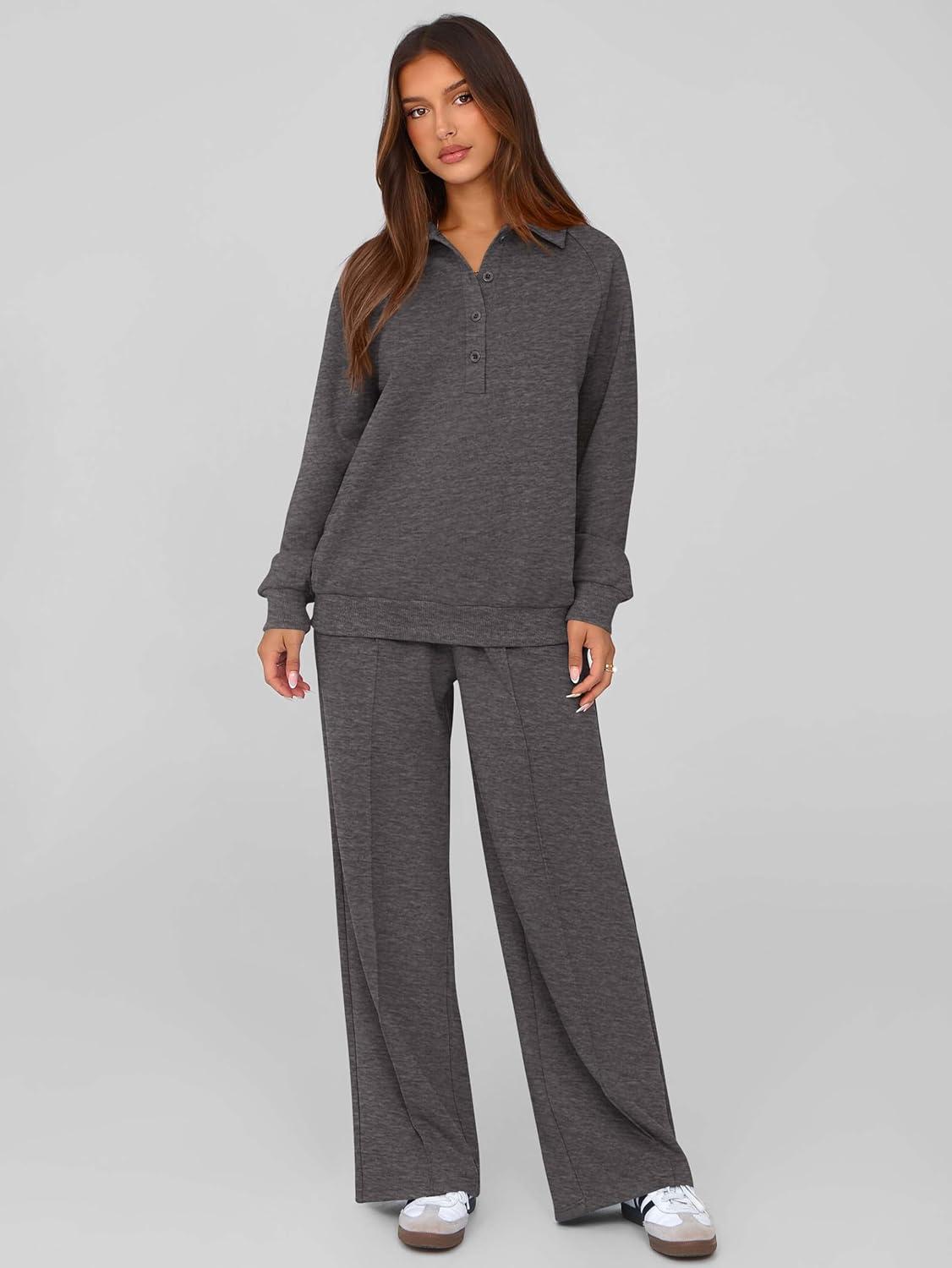 PRETTYGARDEN Women Fall 2 Piece Outfits Sweatsuits Quarter Button Long Sleeve Sweatshirt Wide Leg Pants Tracksuit Lounge Sets(Dark Grey)