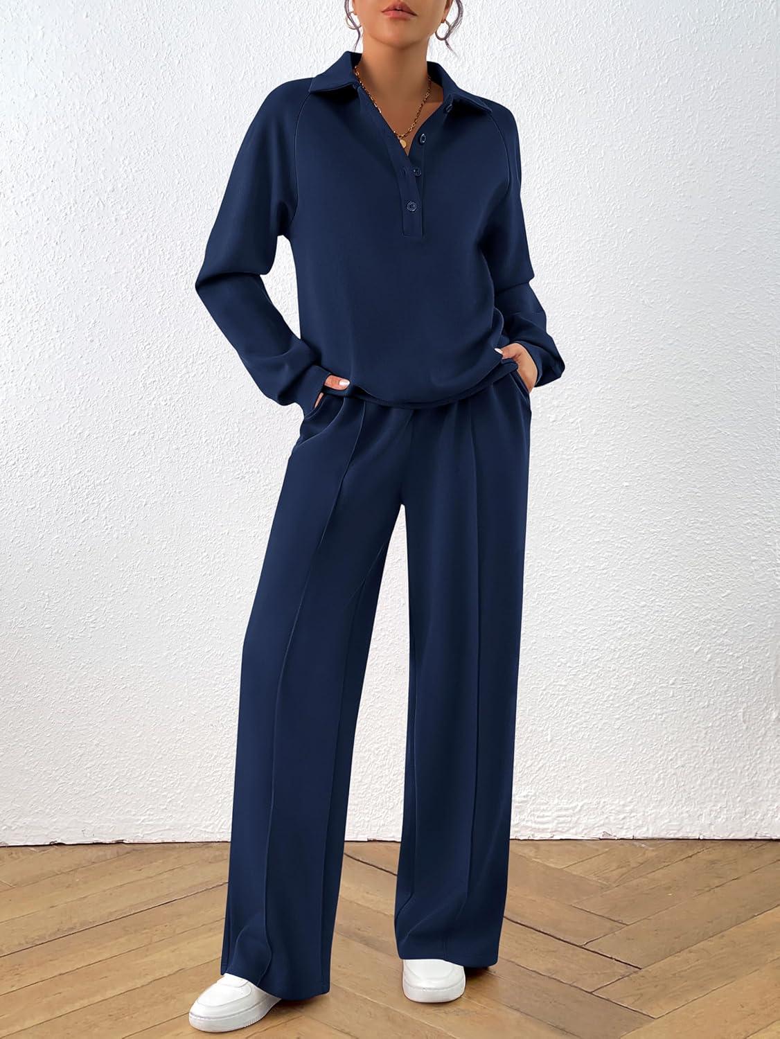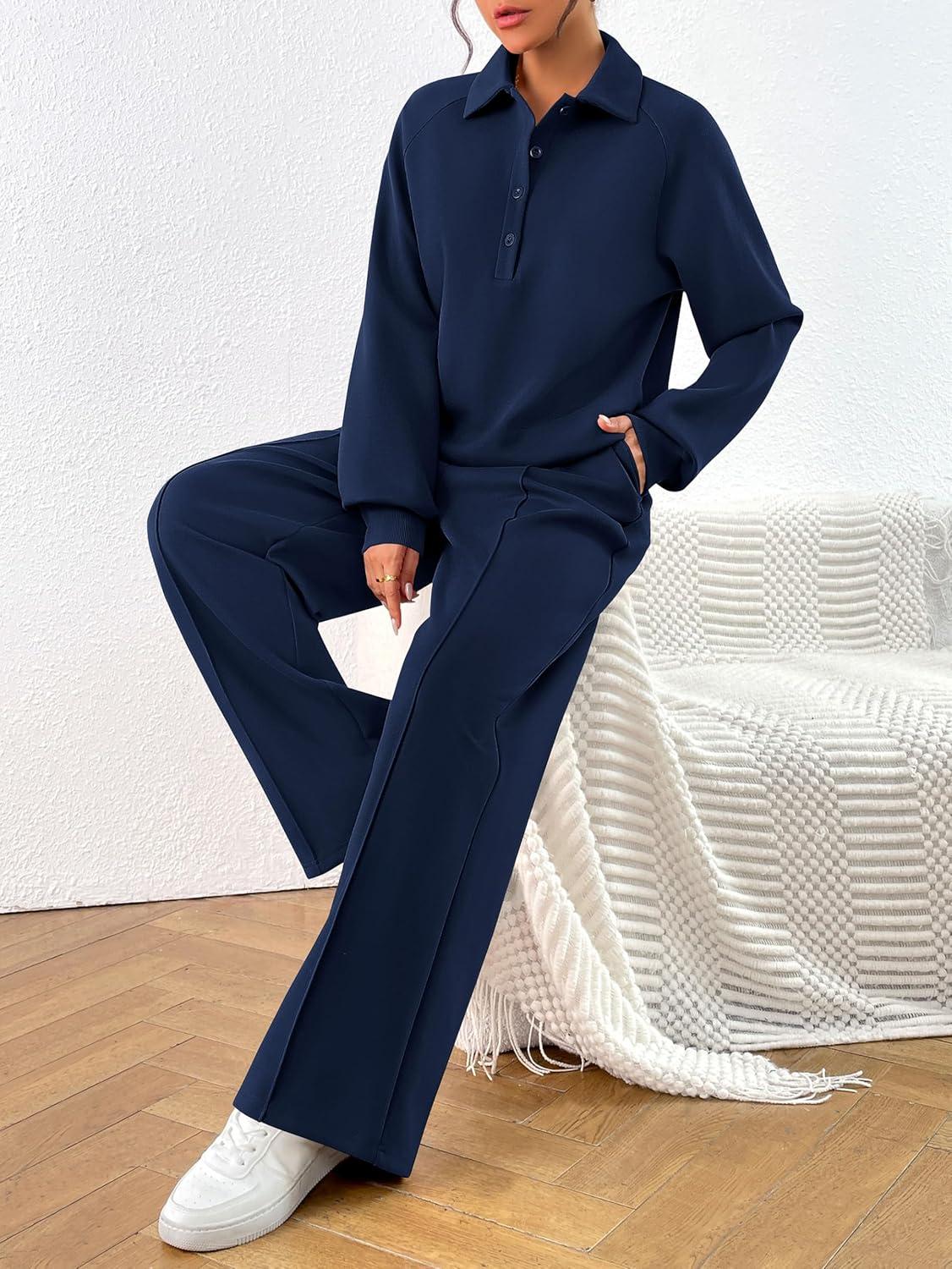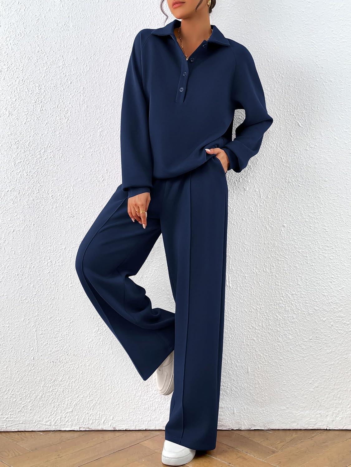 PRETTYGARDEN Women Fall 2 Piece Outfits Sweatsuits Quarter Button Long Sleeve Sweatshirt Wide Leg Pants Tracksuit Lounge Sets(Navy)